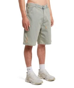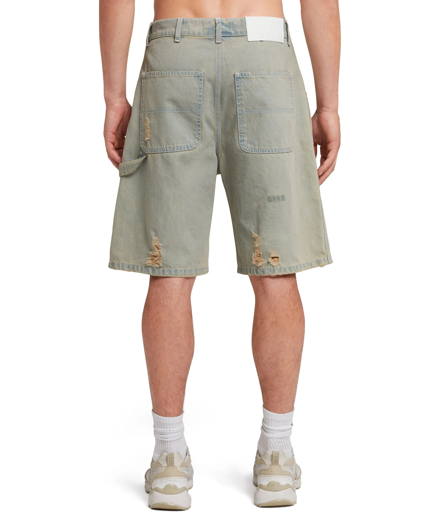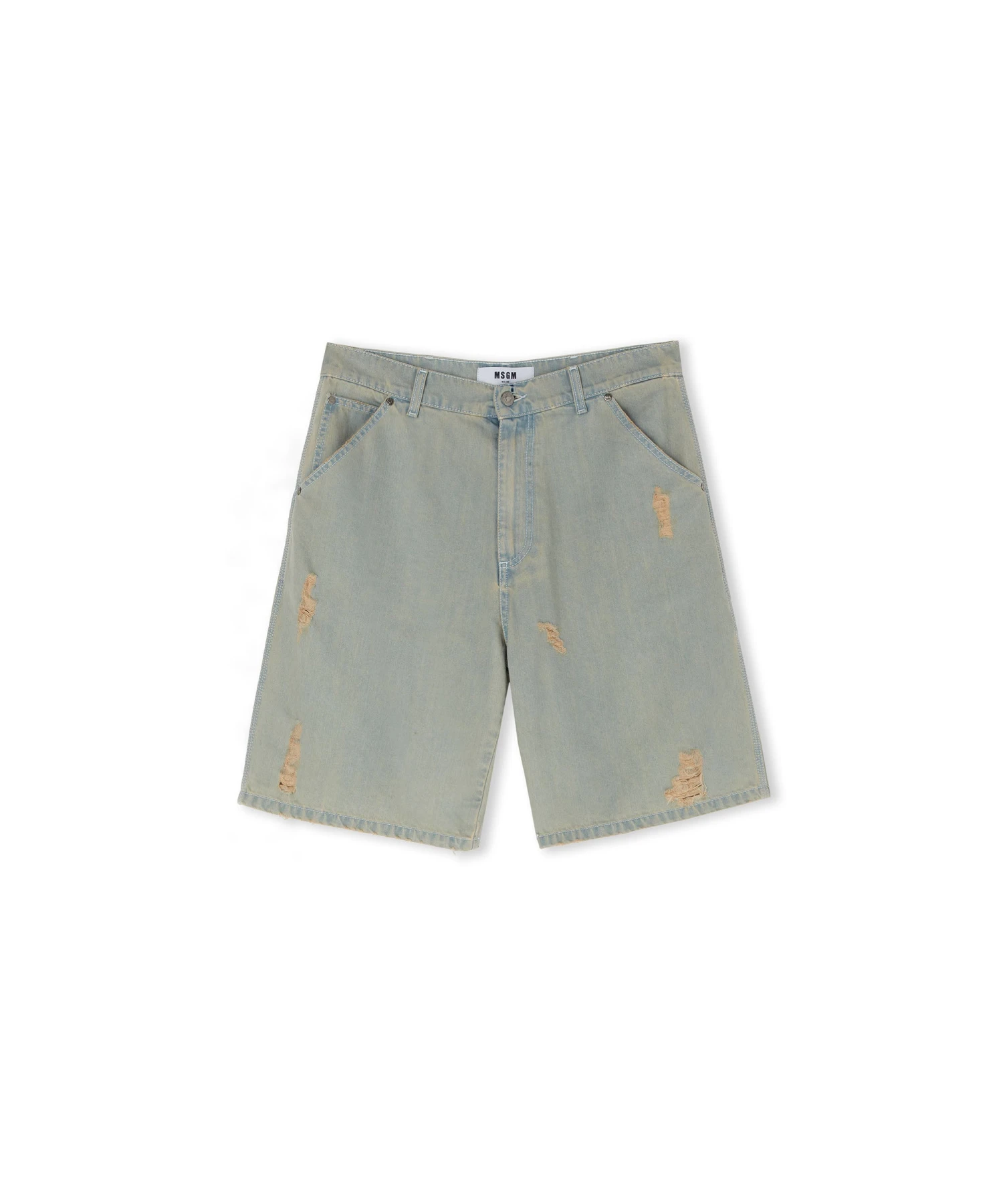 Light denim bermuda shorts with tears. 5-pocket model, belt loops at waist, closure with button and hidden zipper. Contrasting MSGM logo embroidered on back. Knee length. Oversize fit.