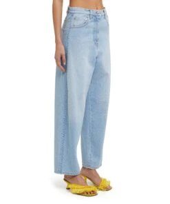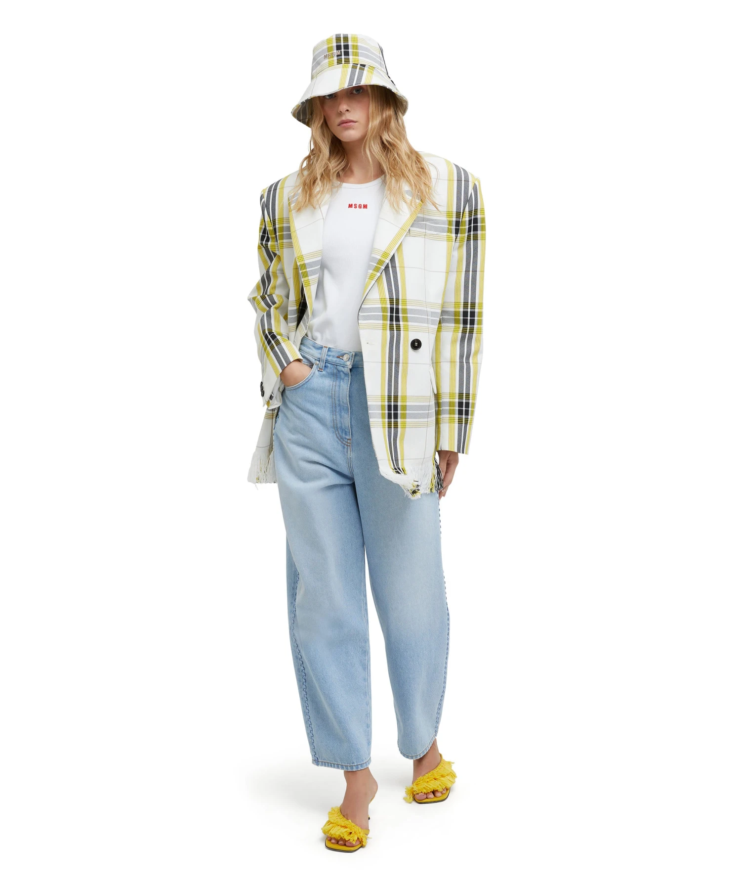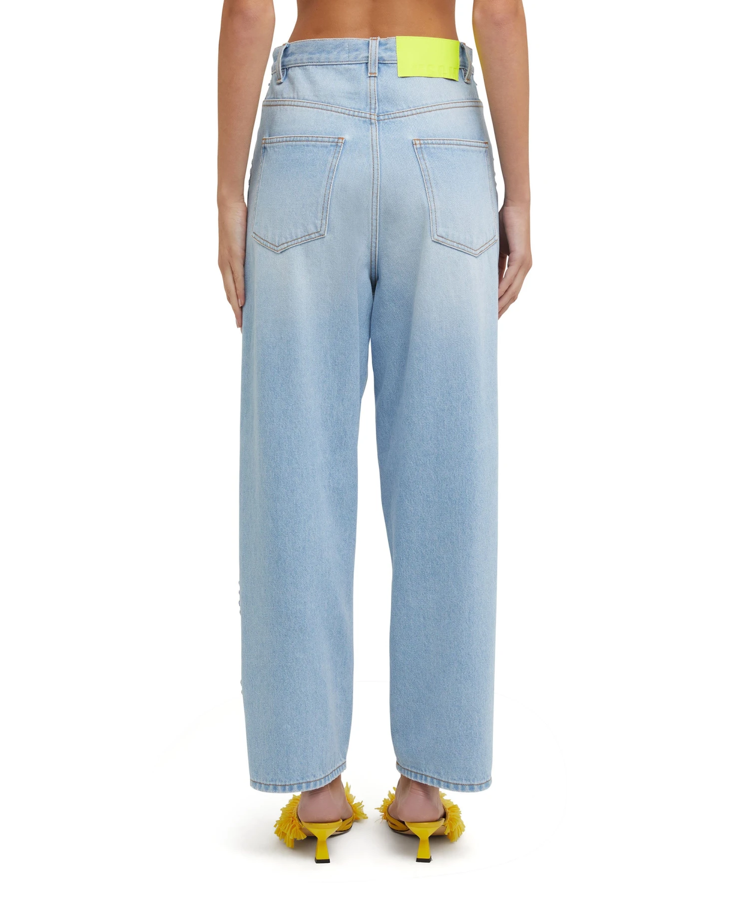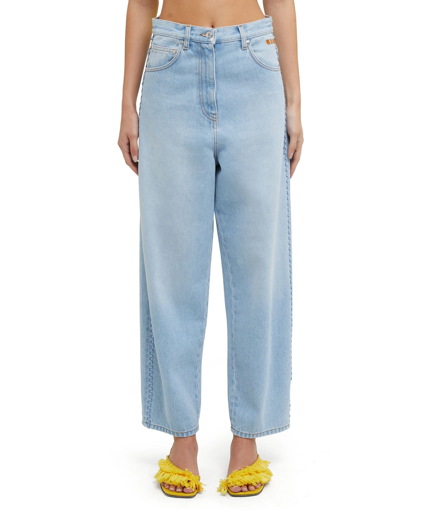 Roomy-leg light denim pants with matching gros grain applied to the sides and contrasting MSGM logo embroidered on the sides. Medium waist, belt loops and closure with button and hidden zipper. 5-pocket model. Oversize fit.