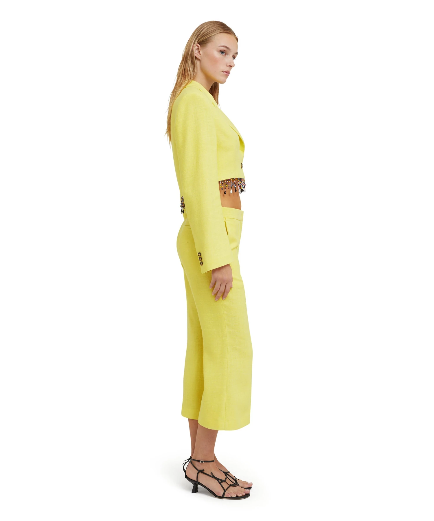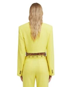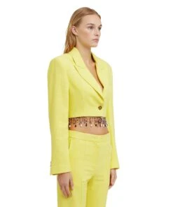 Solid color blended linen crop jacket with single-breasted one-button closure and beaded application on the hem. Peak lapels and internal shoulder pads. Welt pocket on the chest. Oversize fit.