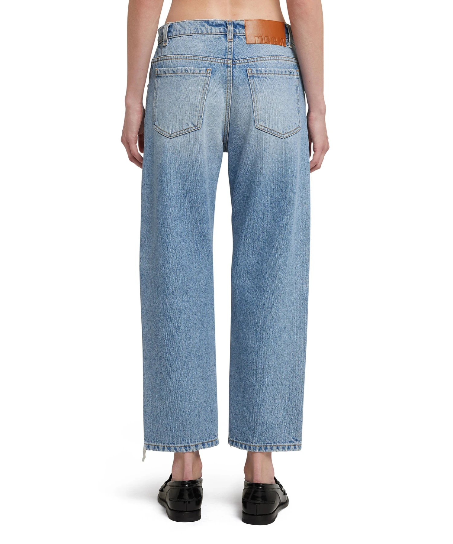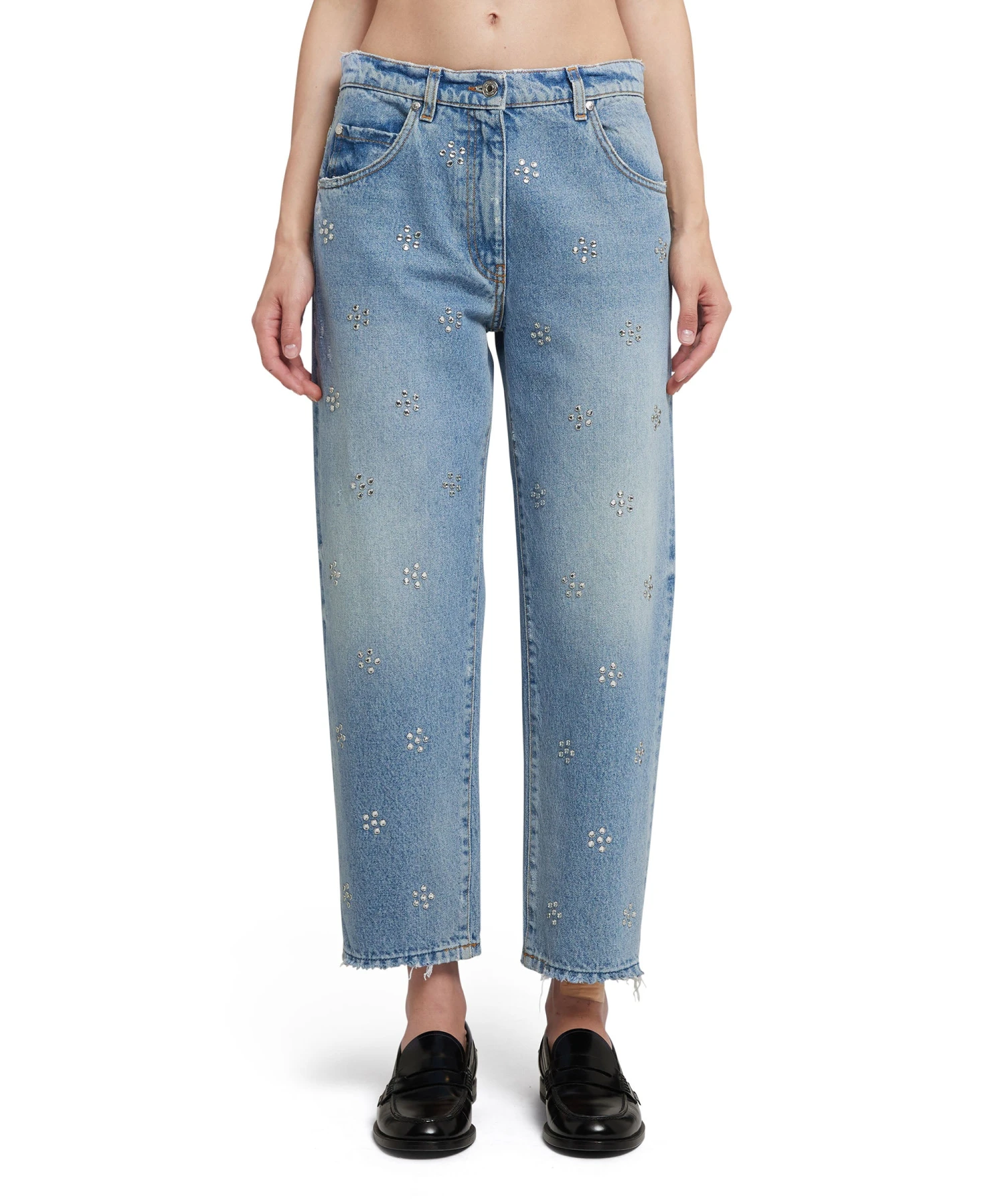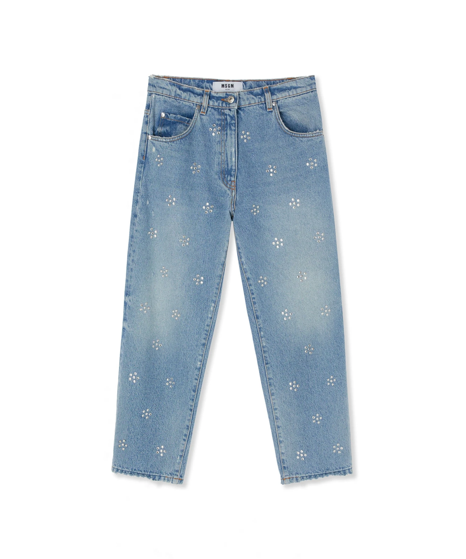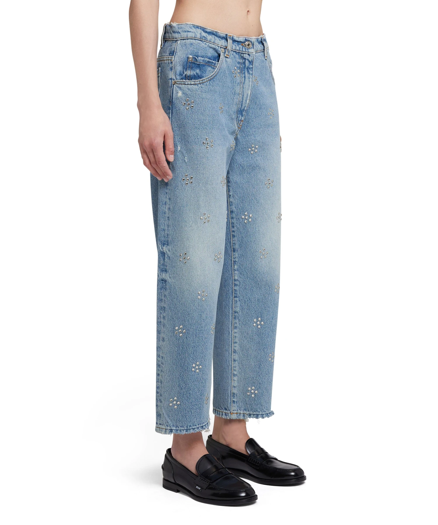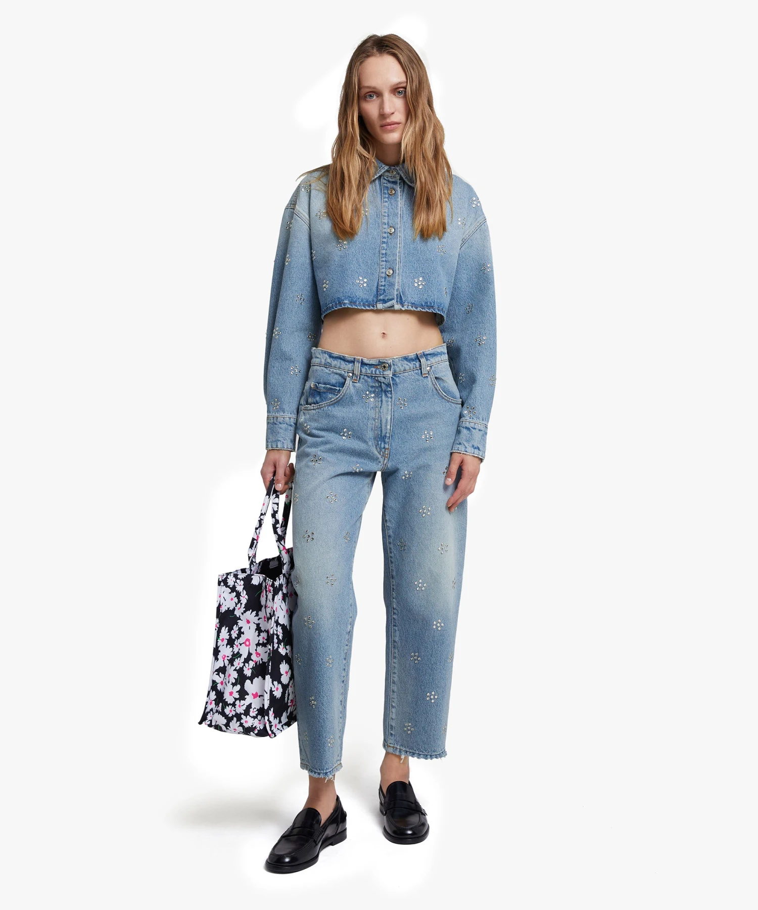 Blue denim cropped pants and rhinestone application with daisy design. Medium waist, belt loops and closure with button and hidden zipper. 5-pocket model. Regular fit.