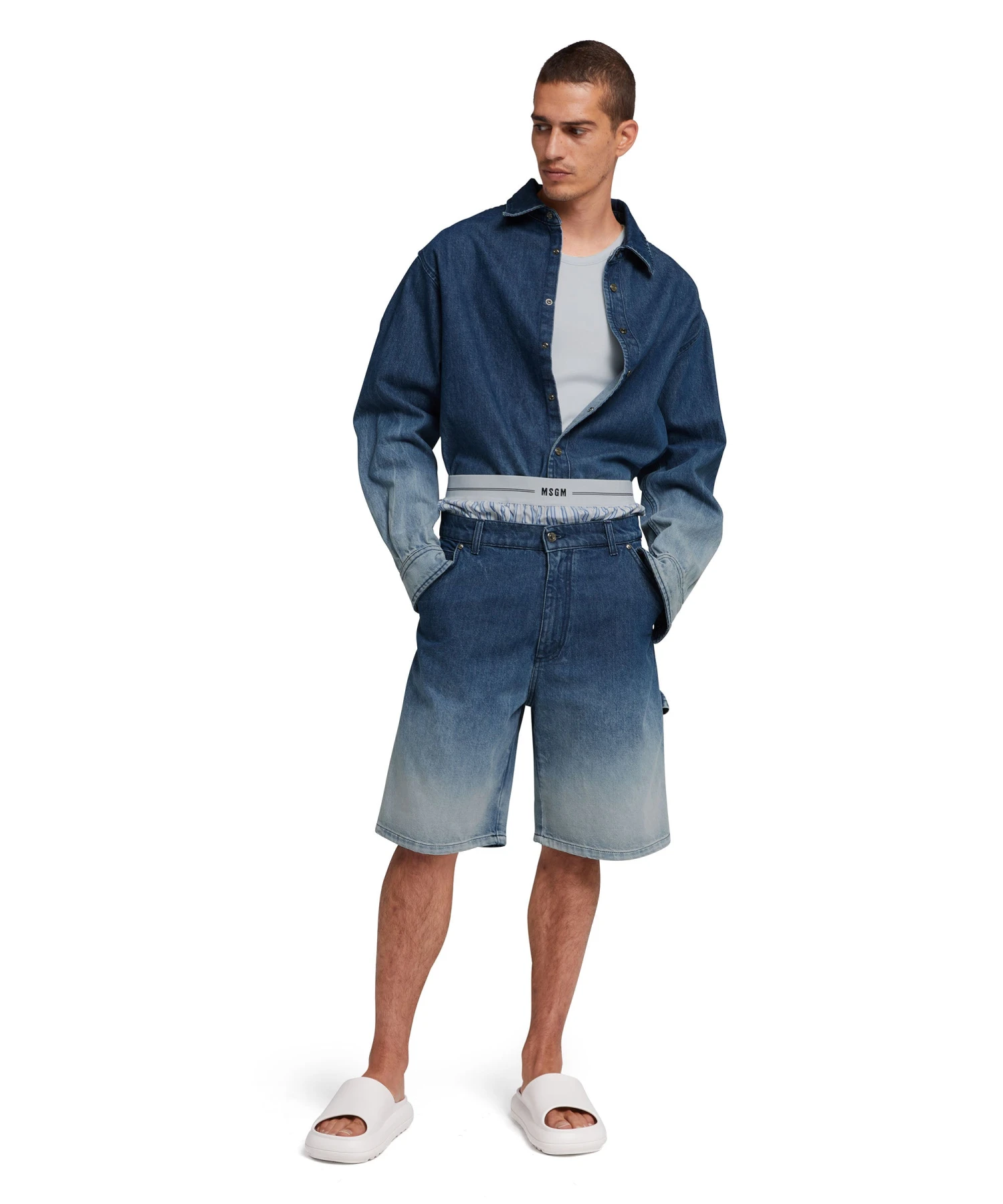 Blue denim long-sleeve shirt with faded treatment and matching MSGM logo embroidered on front. Classic collar and closure with snaps. Rounded hem. Regular fit.