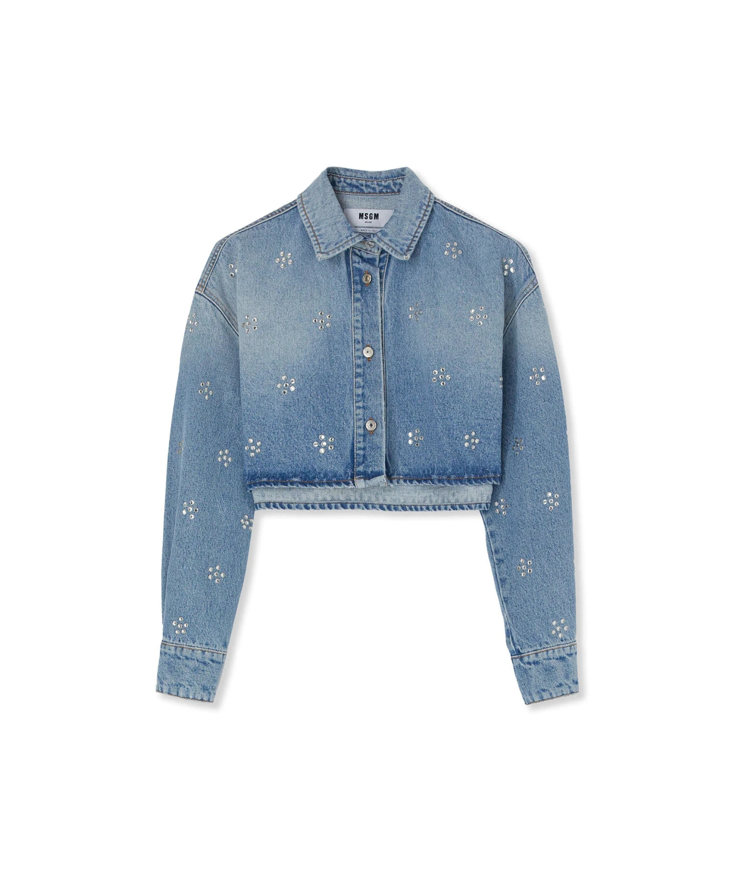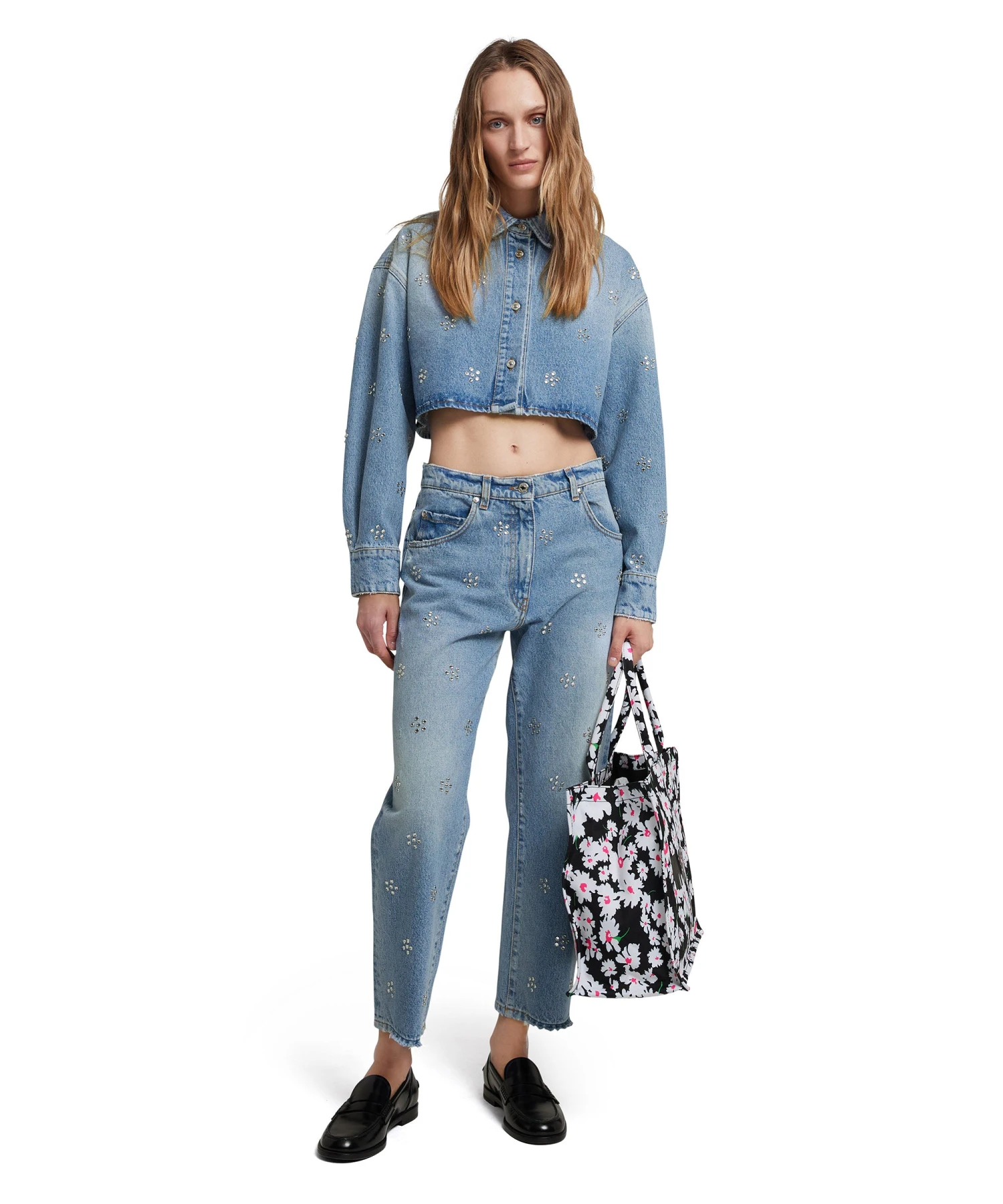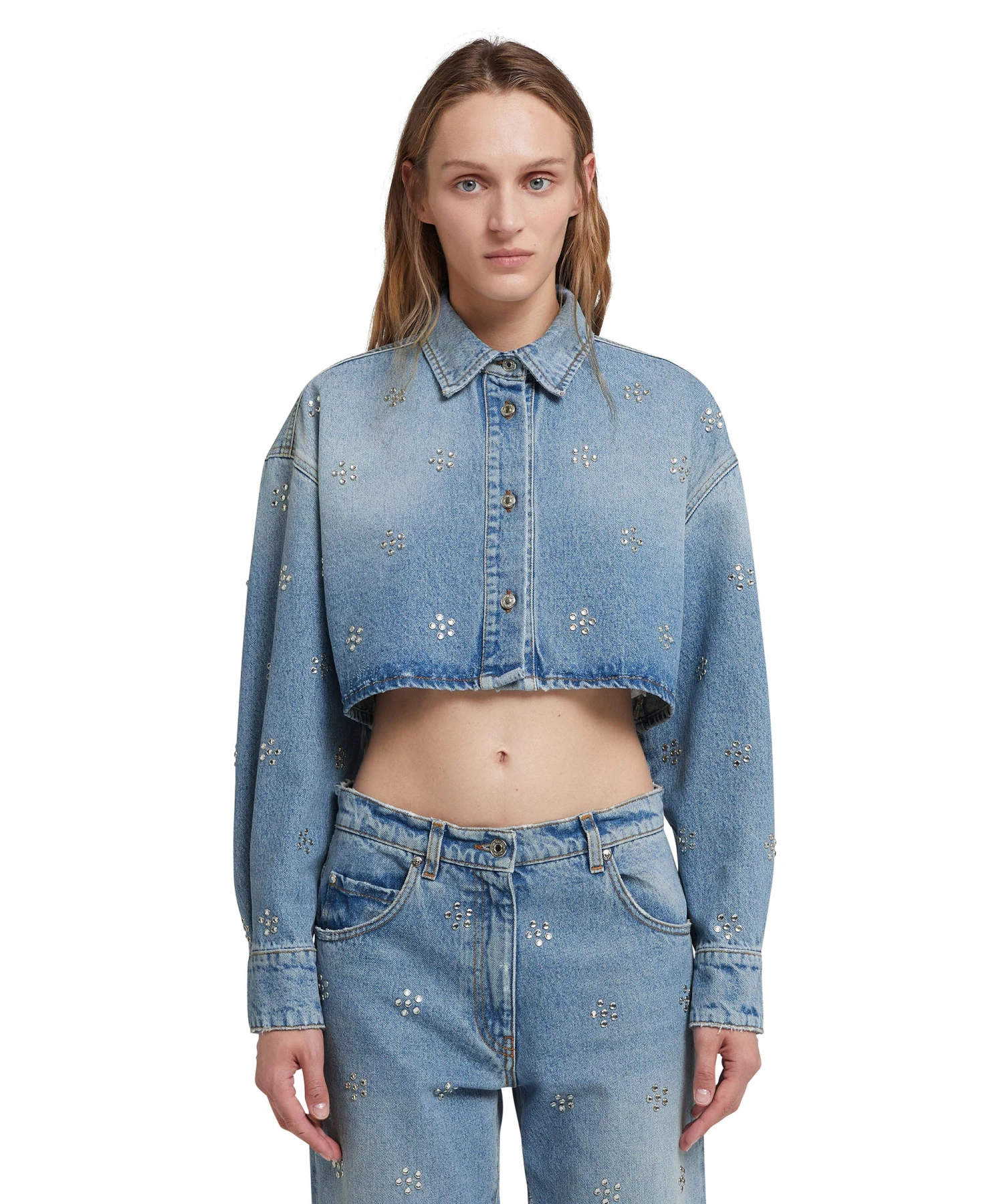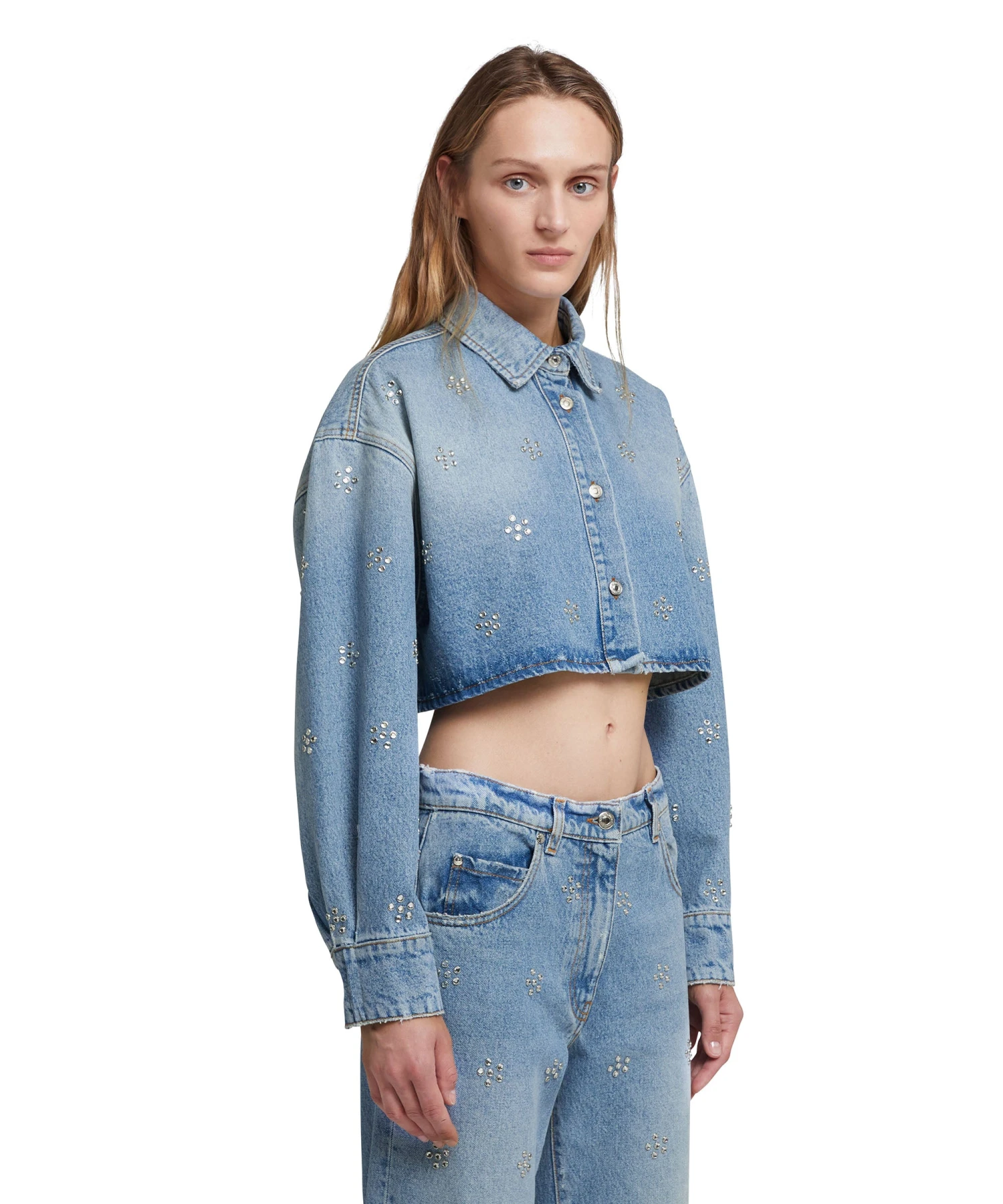 Blue denim long-sleeve cropped shirt with rhinestone daisy design application. Central closure with buttons. Regular fit.