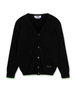 Plain-coloured cardigan in virgin wool and cashmere. Contrasting hand-embroidered style logo detail. Ribbed neckline, cuffs and hem. Hem detail in contrasting colour on the bottom and cuffs. V-neck with front tone-on-tone button closure. Regular fit.