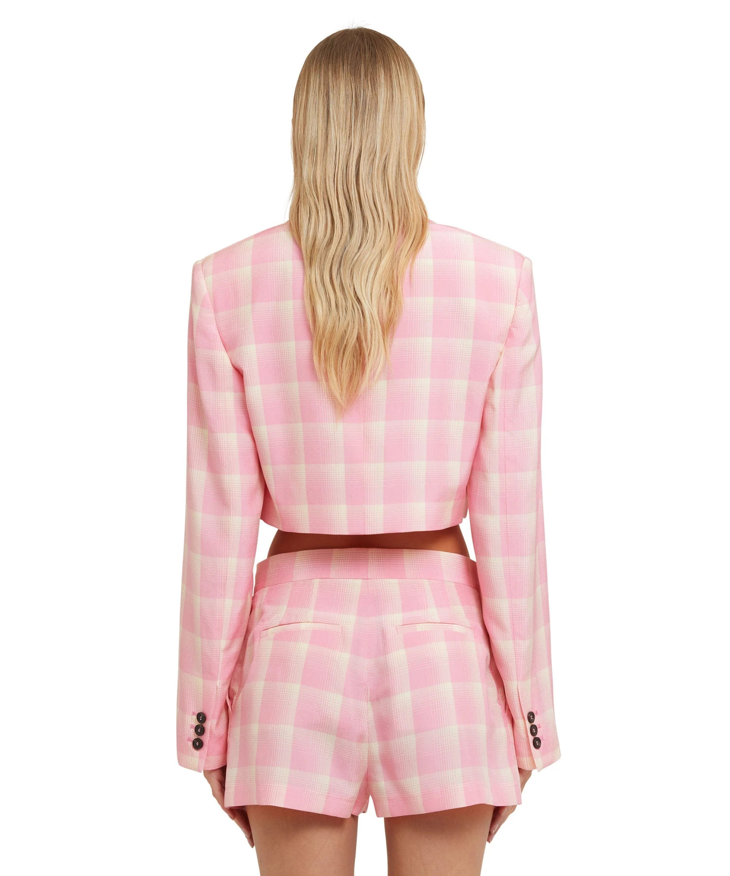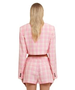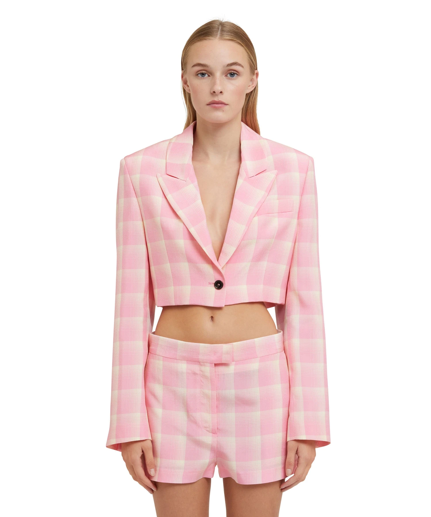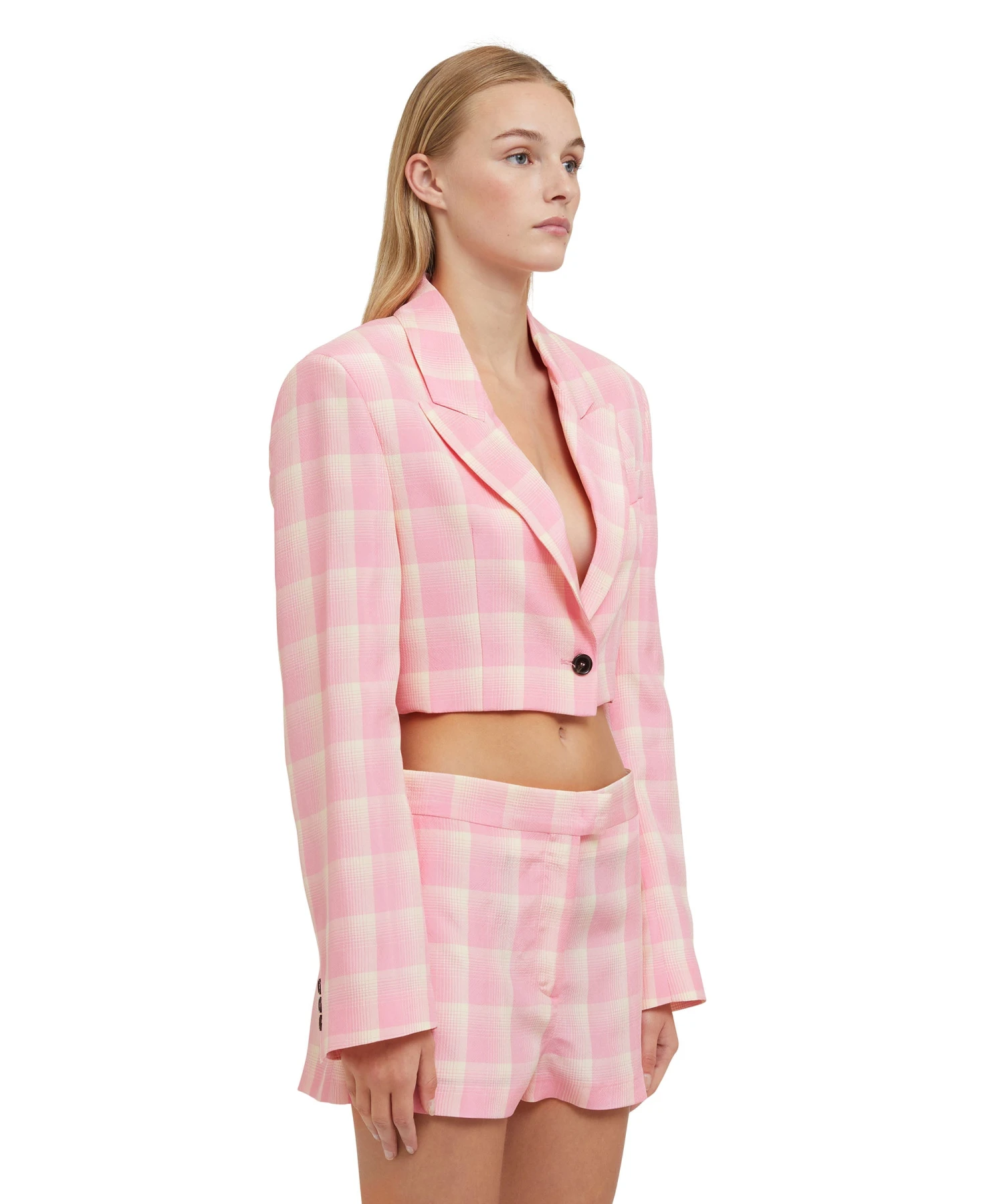 Viscose check-print crop jacket with single-breasted one-button closure. Peak lapels and internal shoulder pads. Welt pocket on the chest. Oversize fit.
