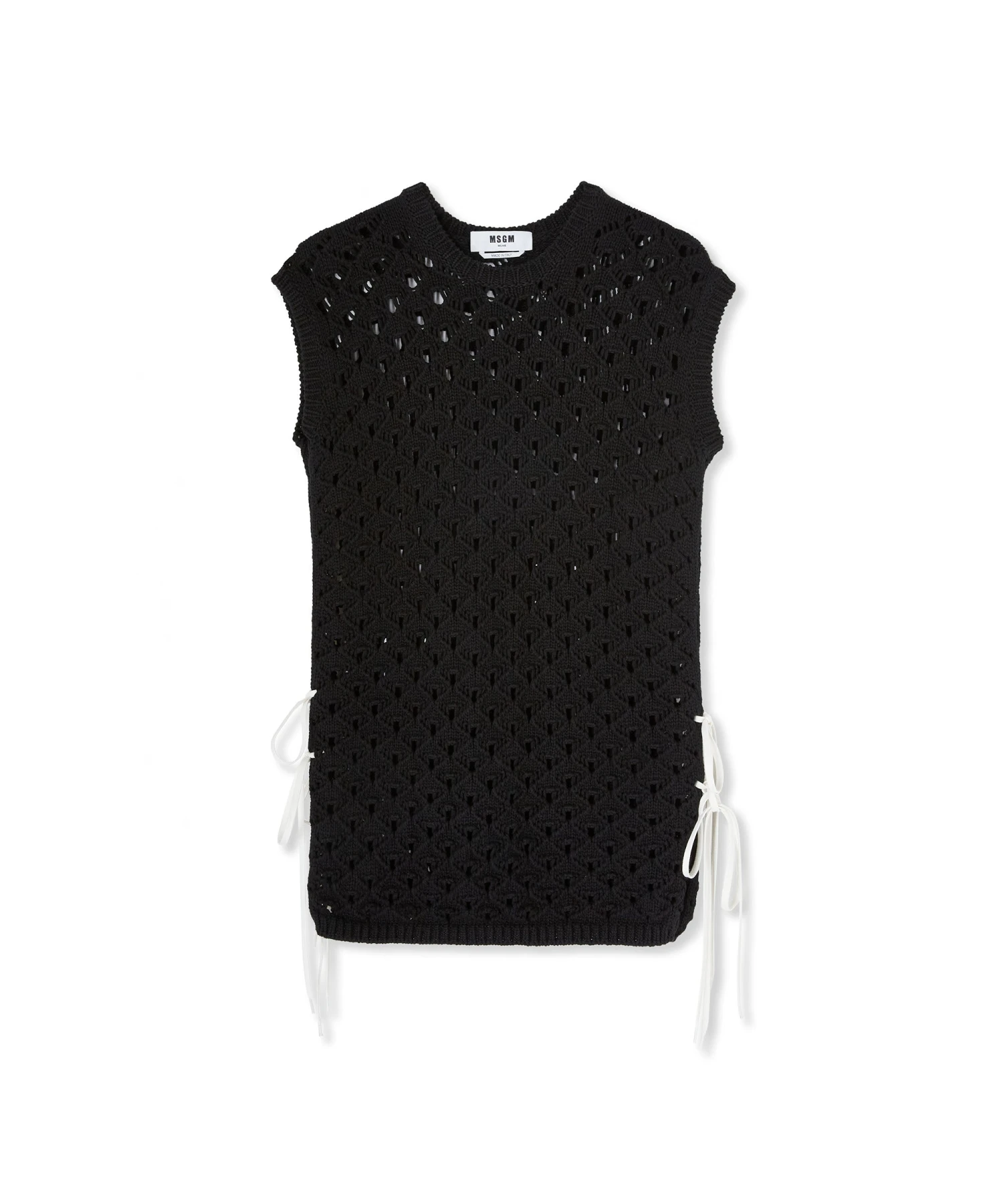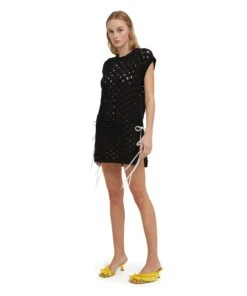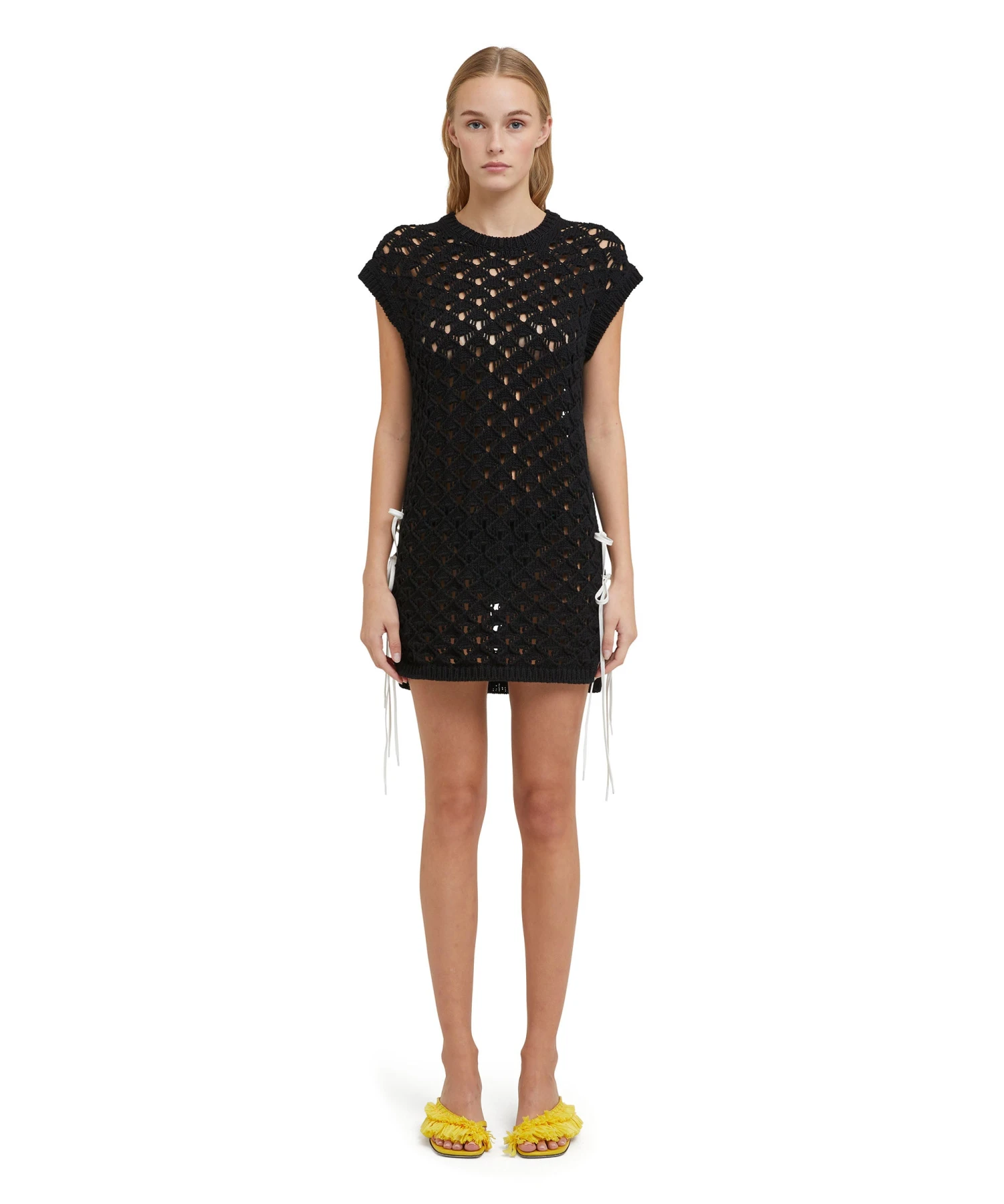Solid color sleevless short dress in cotton crochet knit with side slits at the bottom decorated with contrasting color strings. Ribbed profiles. Regular fit.