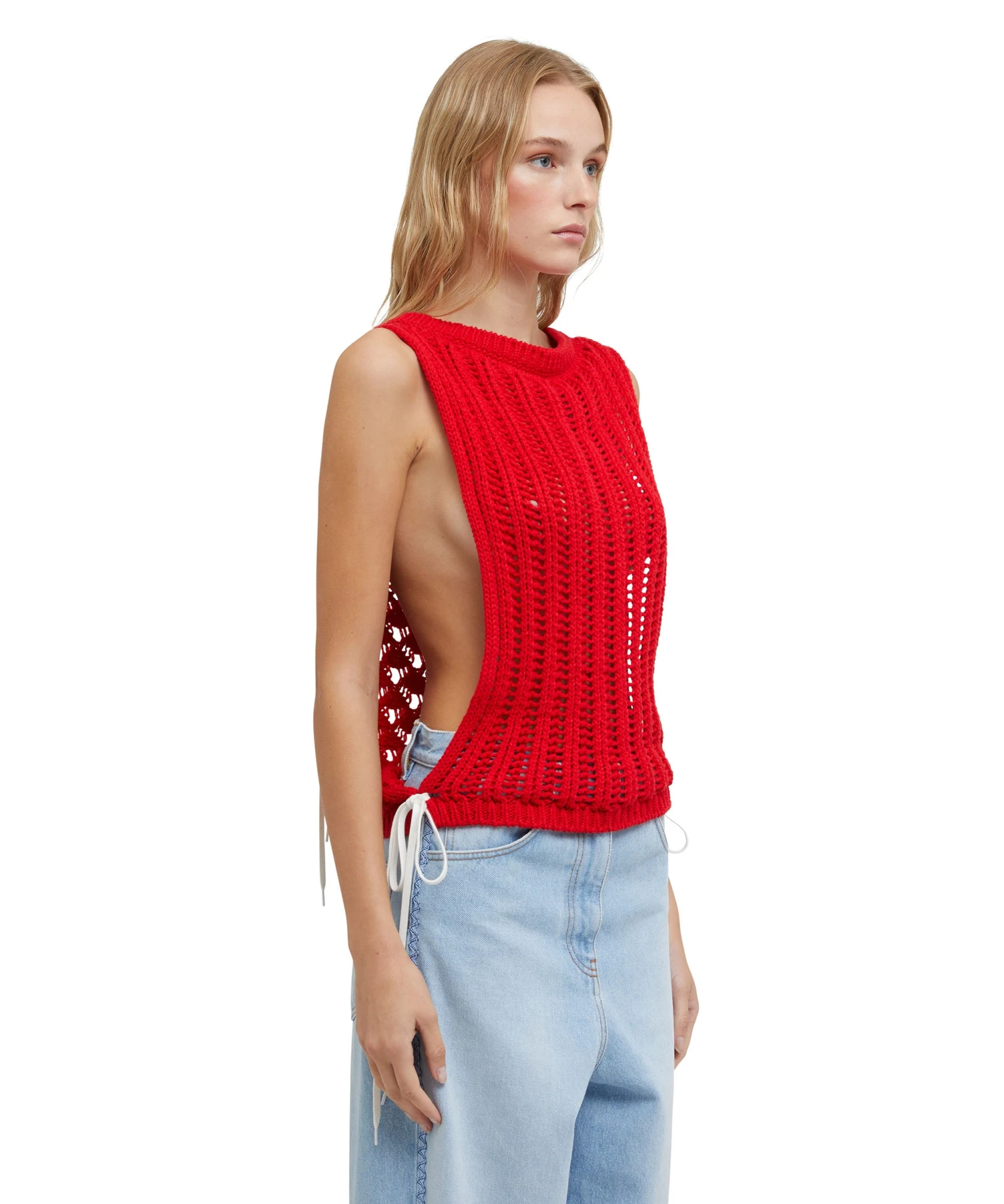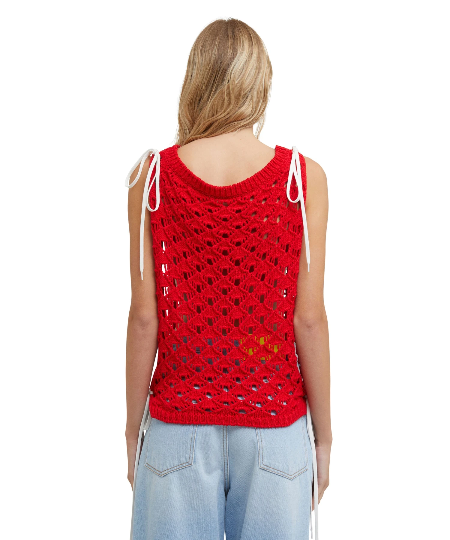 Cotton knit top with crochet workmanship and decorative laces. Roomy armhole. Regular fit.
