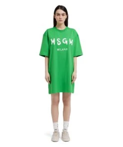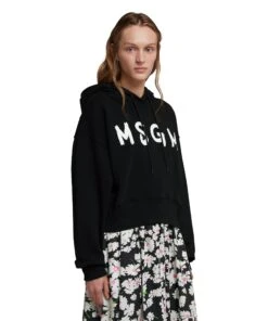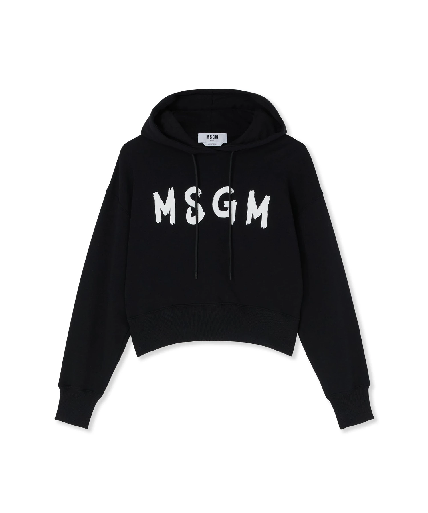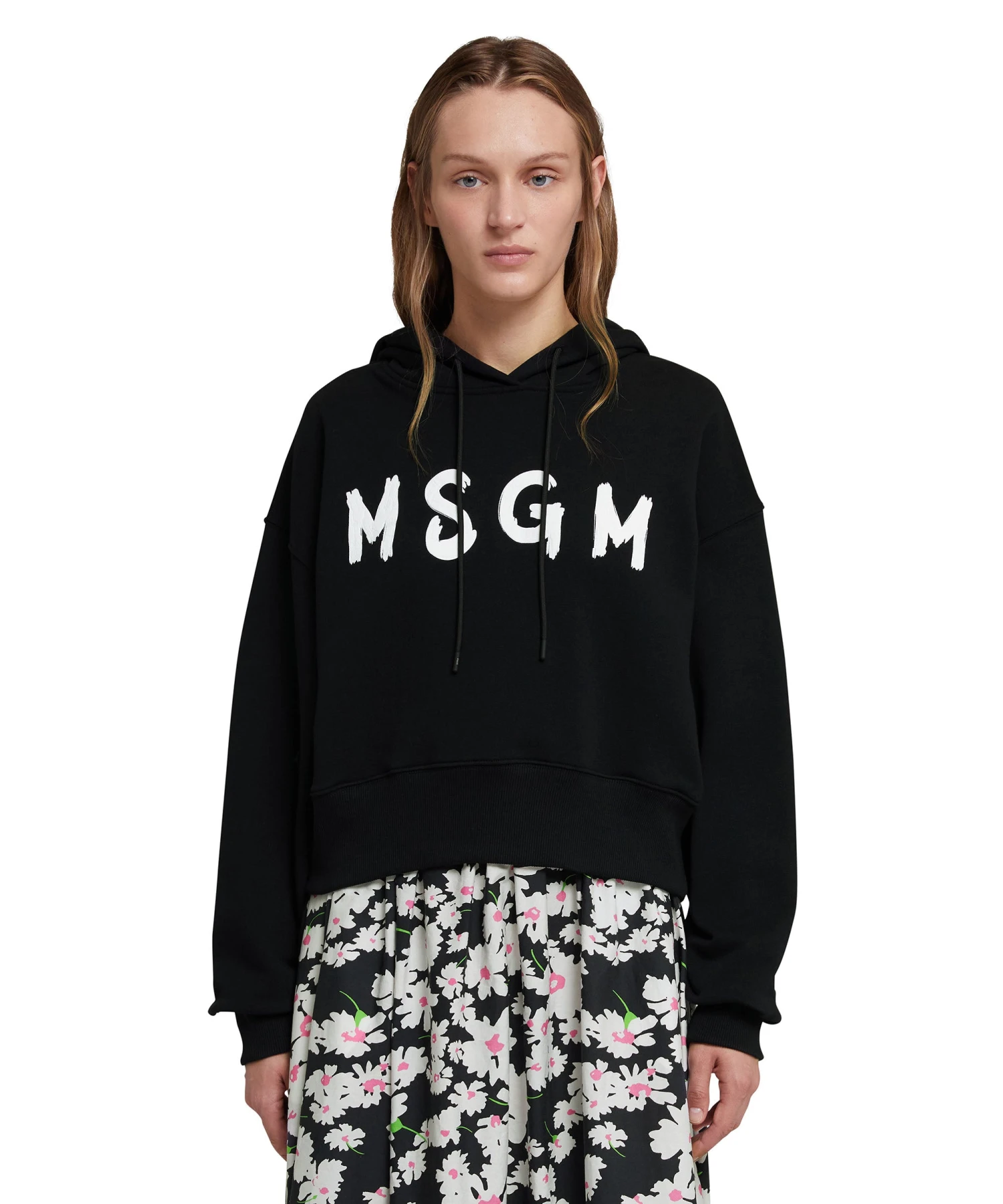 Solid color fabric hooded sweatshirt with contrasting MSGM brushtroke logo printed on the chest. Crop model. Ribbed collar, cuffs and bottom. Regular fit.