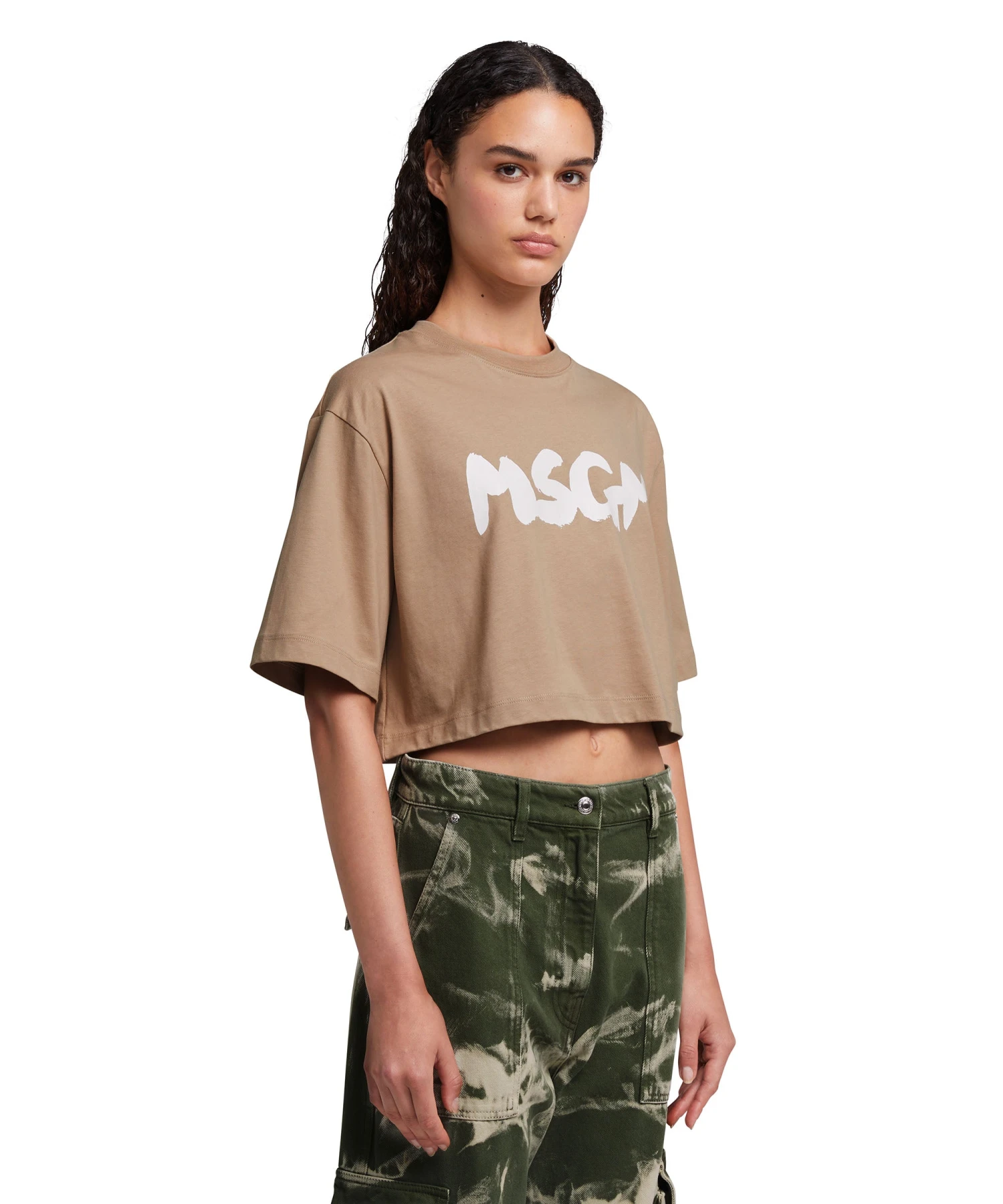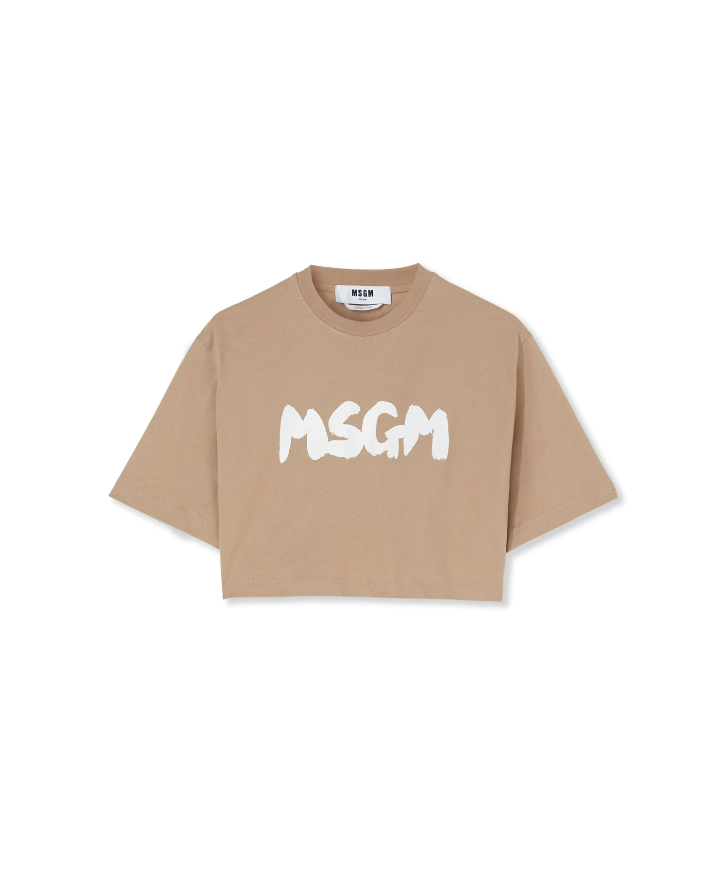 Solid color cotton crewneck t-shirt with new MSGM brushstroke logo. Crop-top model. Regular fit.