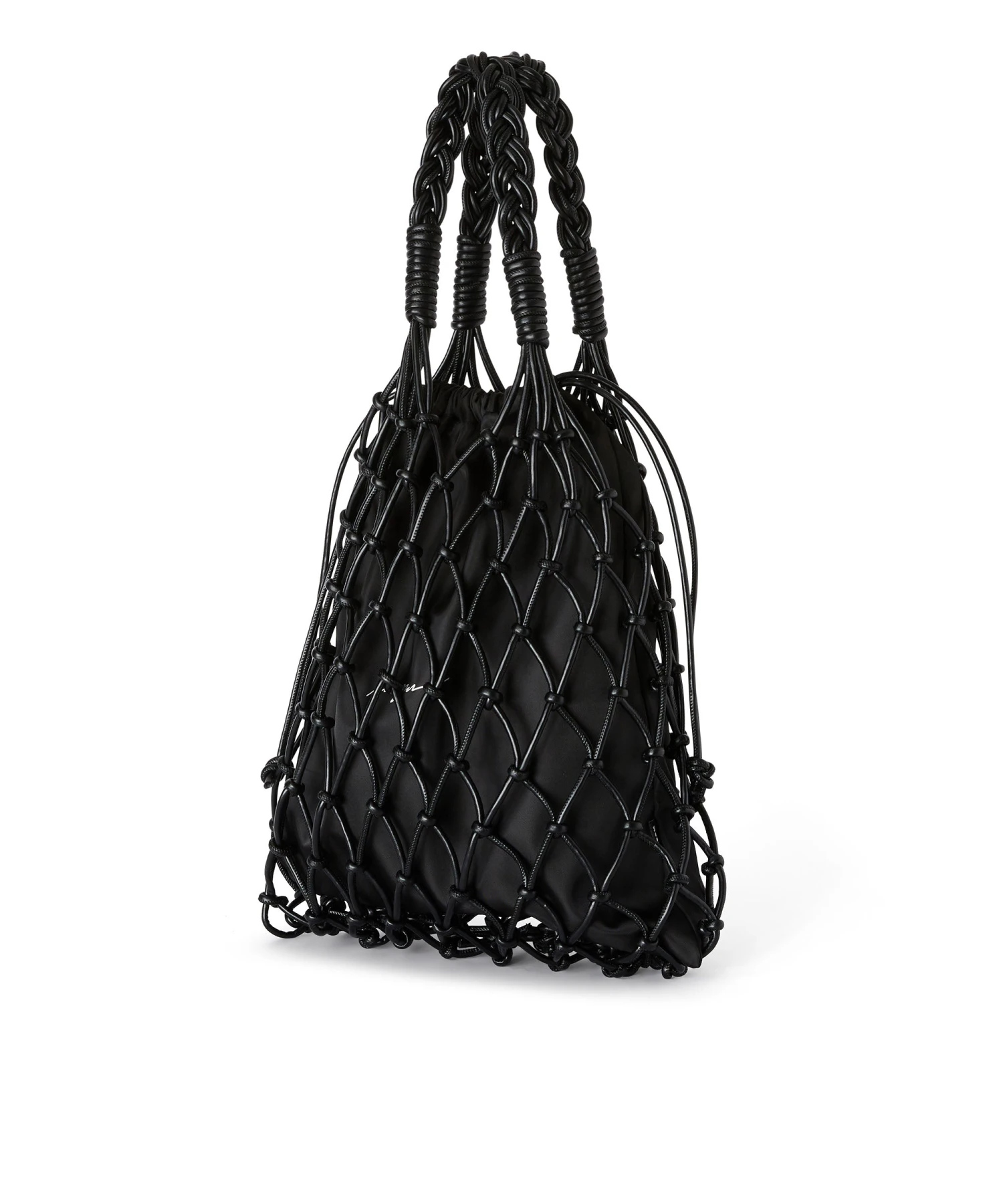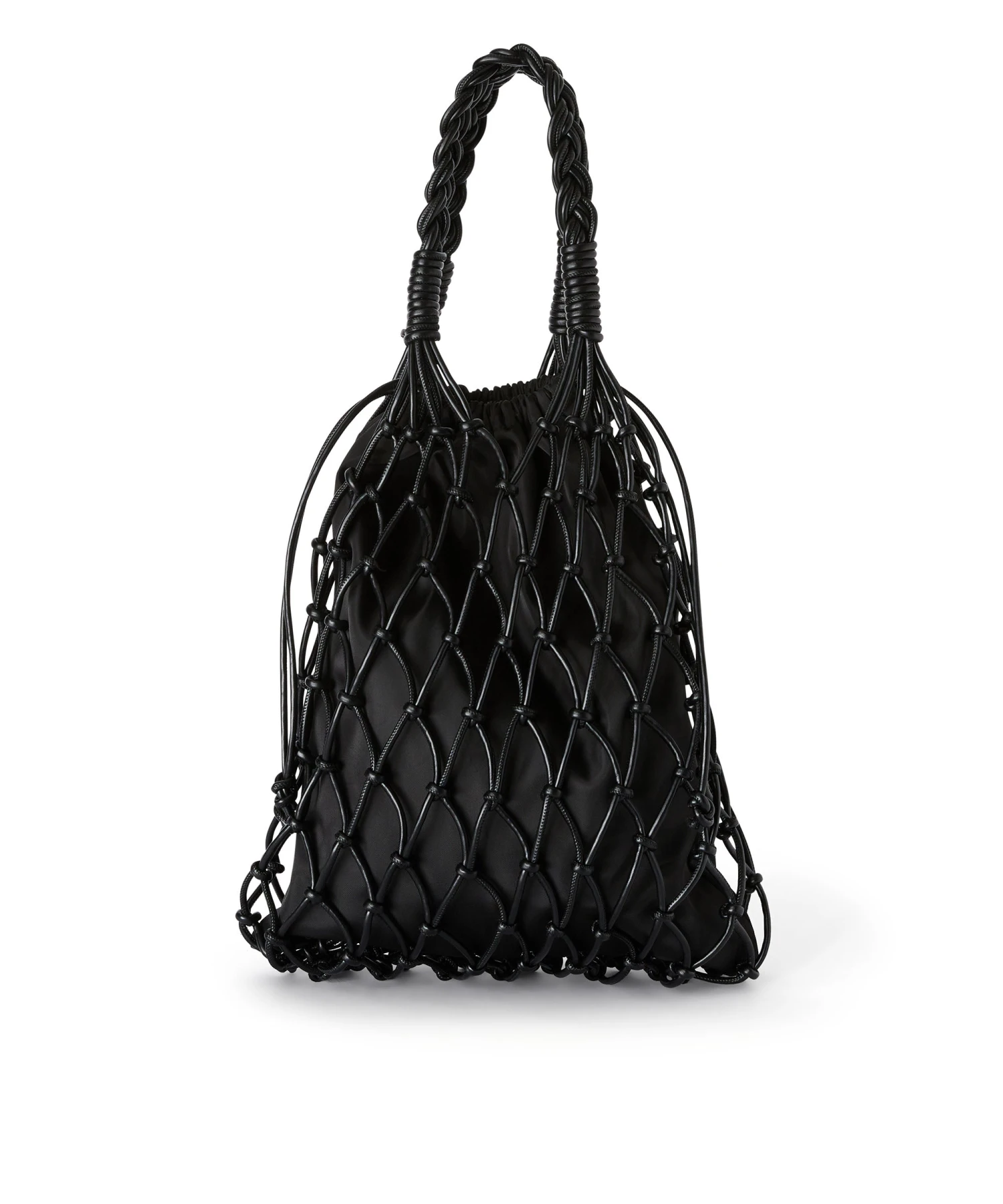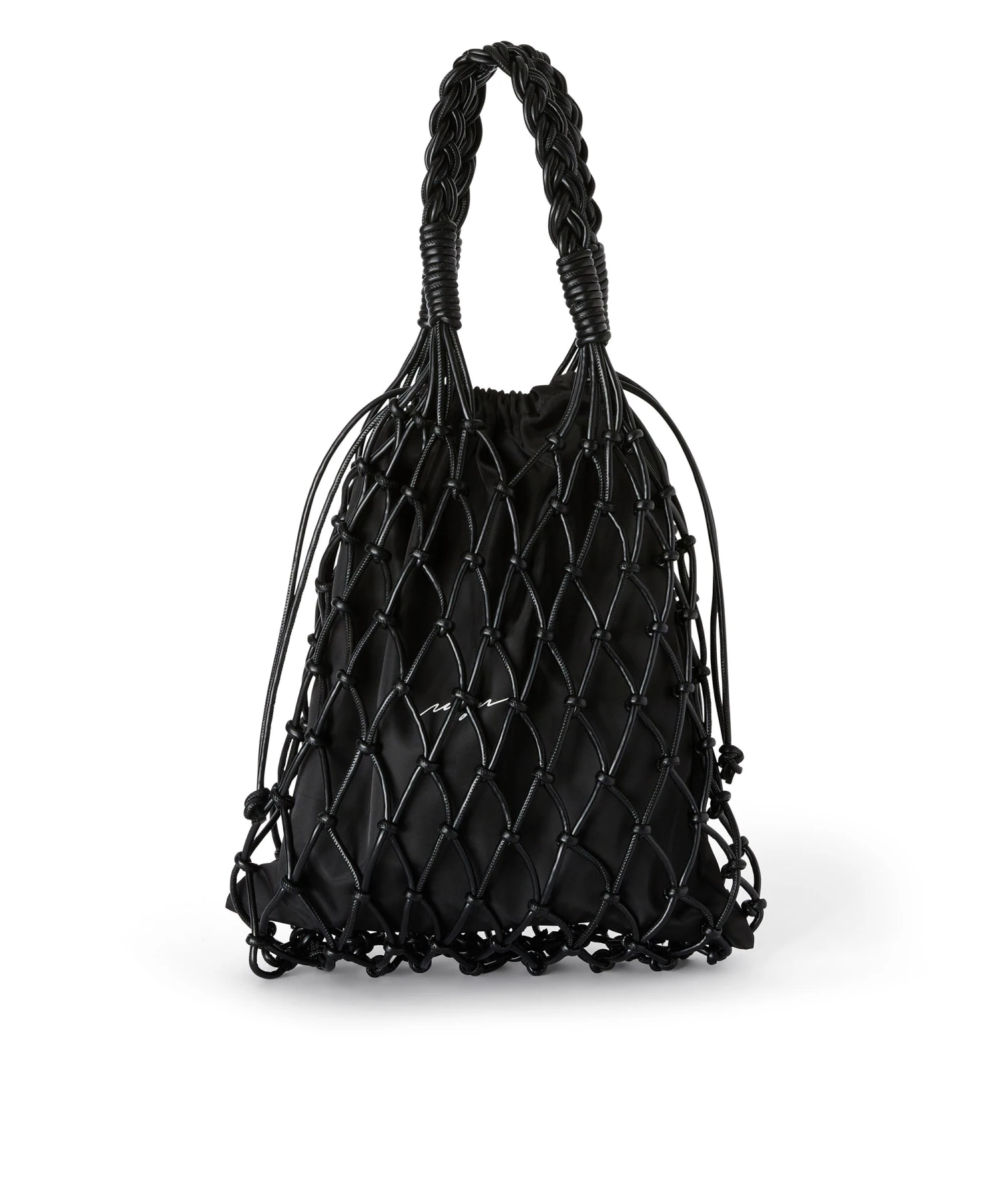 Medium faux-leather mesh tote bag. Internal nylon pouch with contrasting cursive printed logo. Faux-leather drawstring closure. Measurements: 34 x 40 x 5 cm / 13.4 x 15.8 x 2 inches