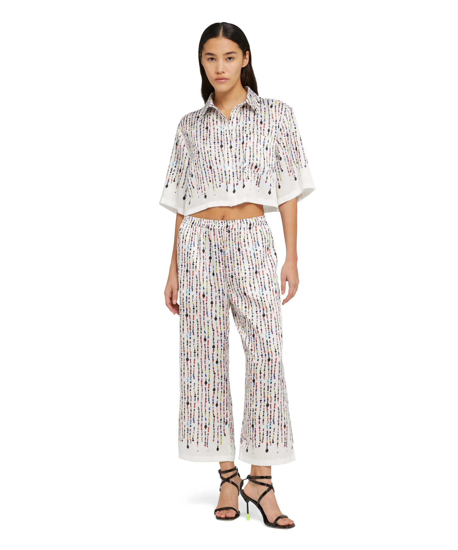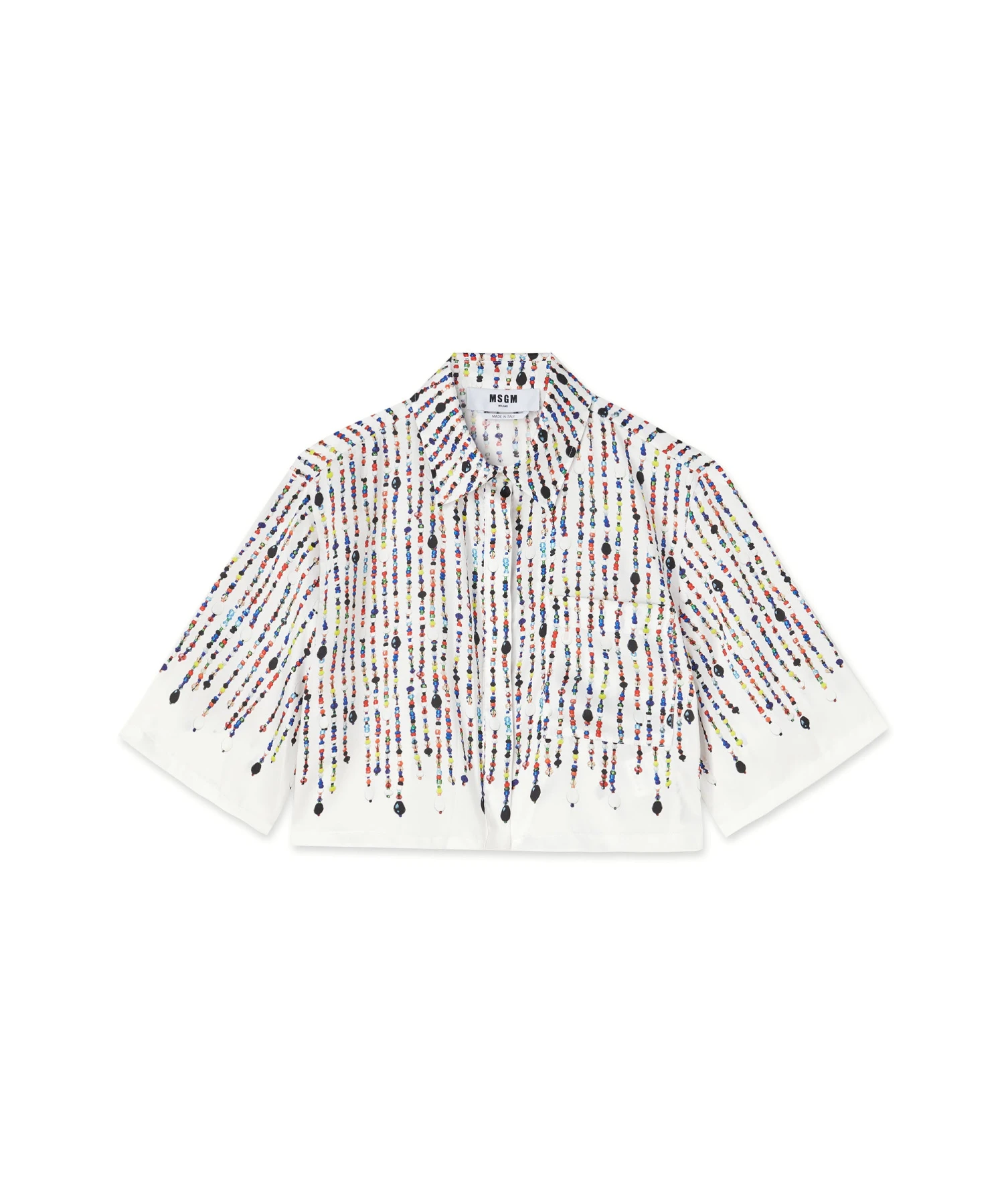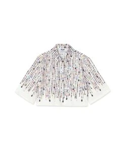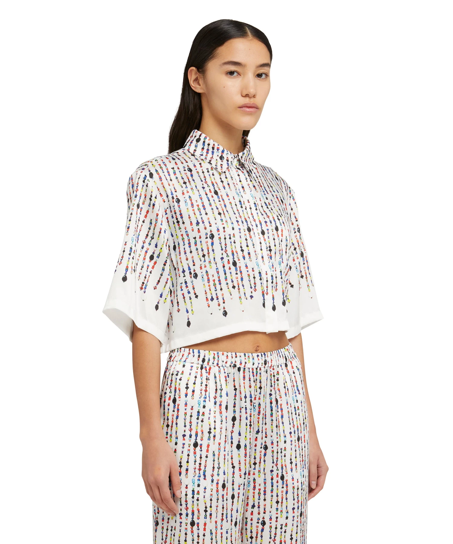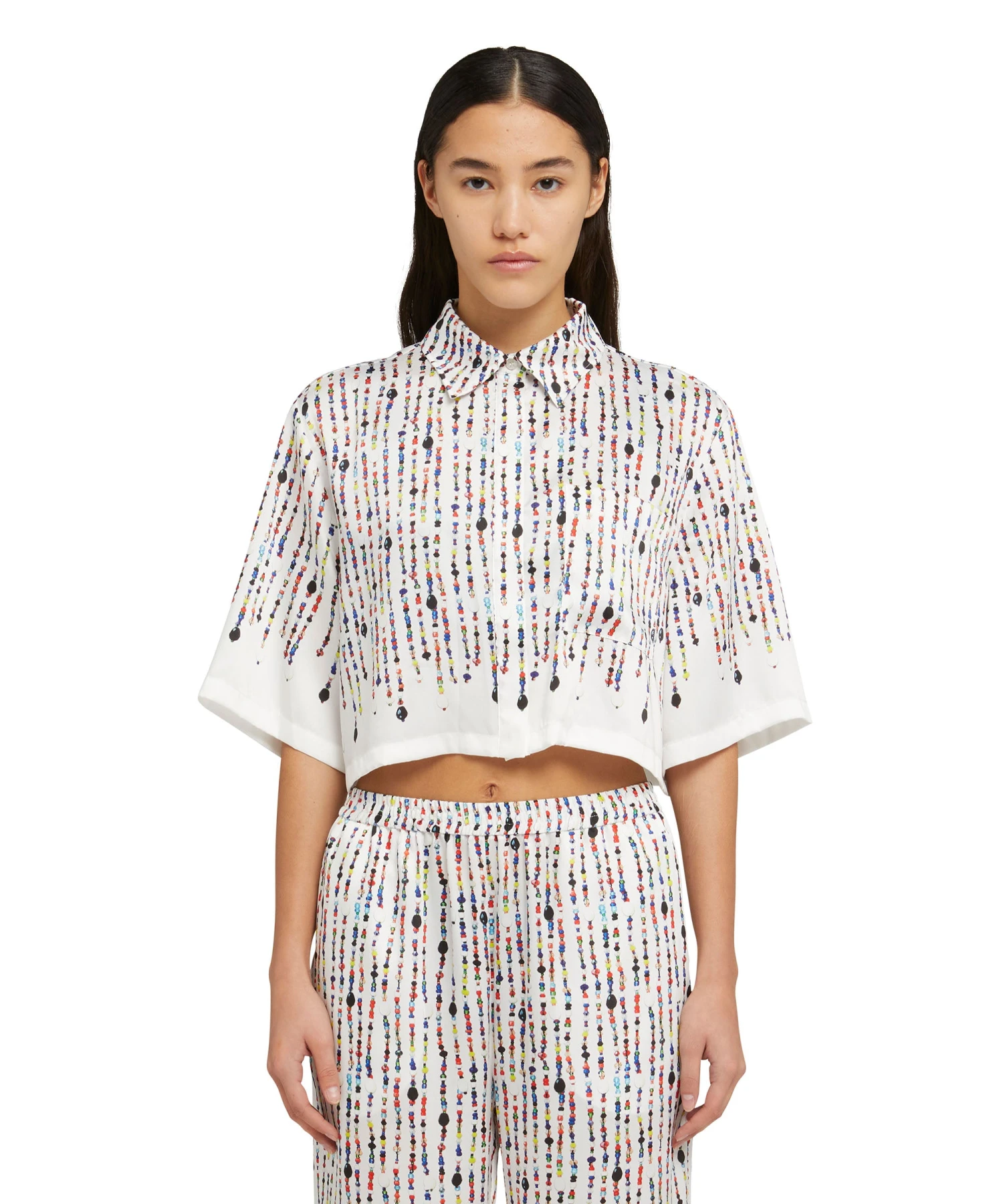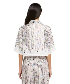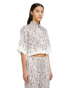 Short-sleeve crop shirt in fluid fabric with all-over printed beaded graphics. Classic collar, welt chest pocket and hidden front closure. Oversize fit.