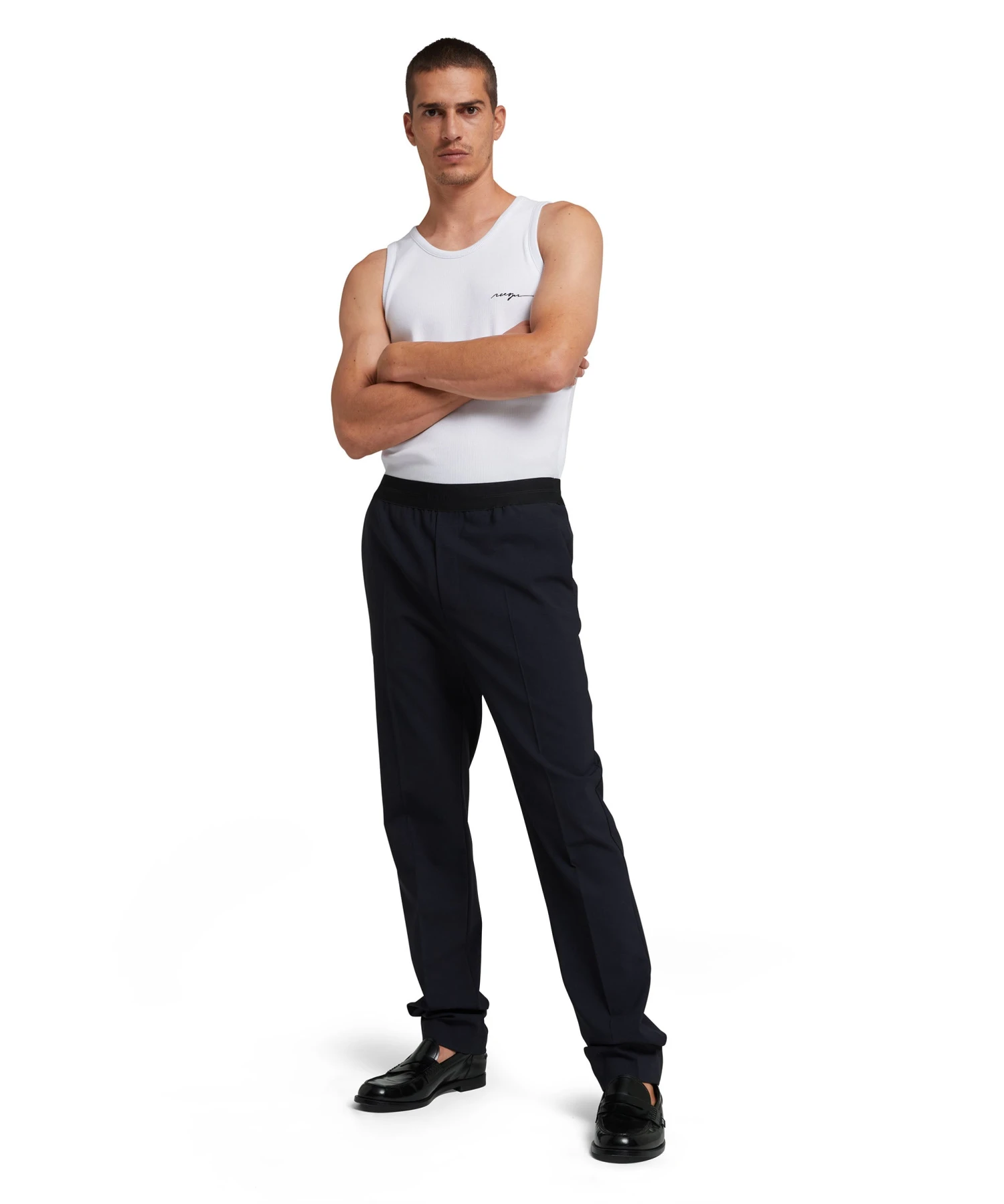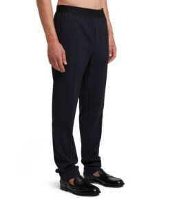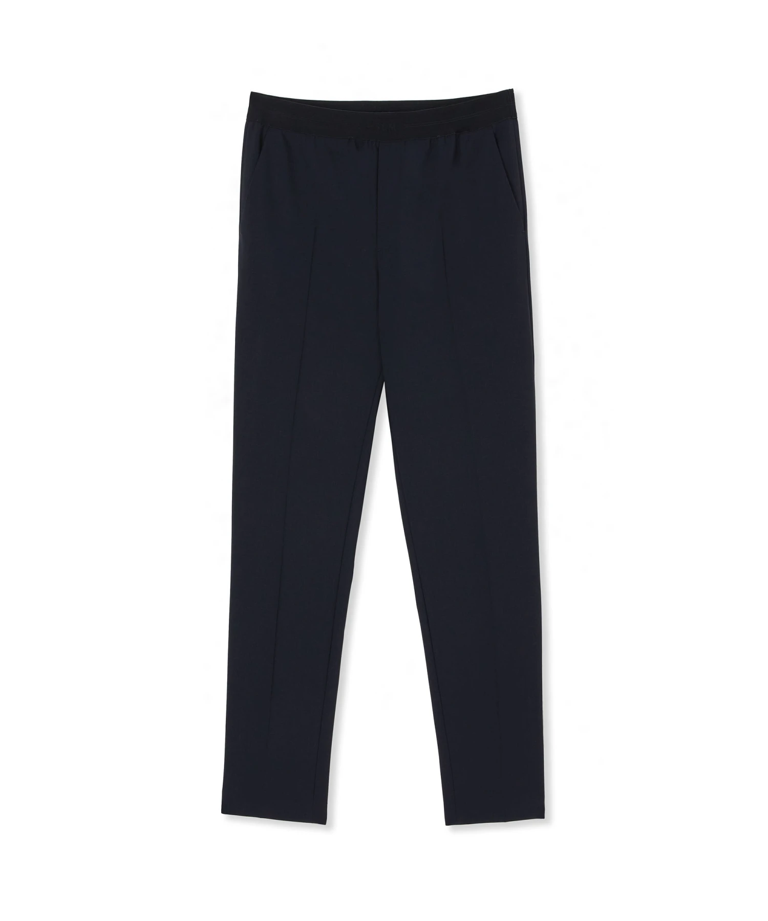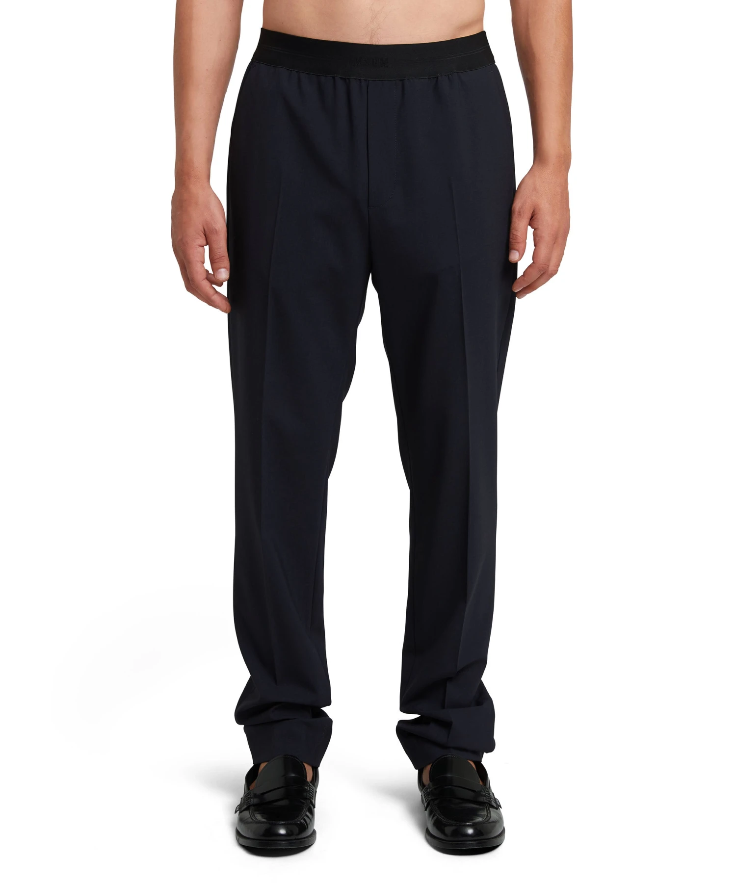 Fresh wool stretch pants with narrow legs with matching elasticized waistband. Side and back pockets.