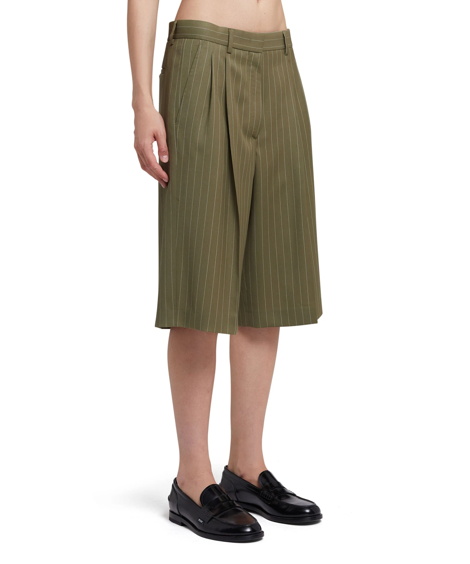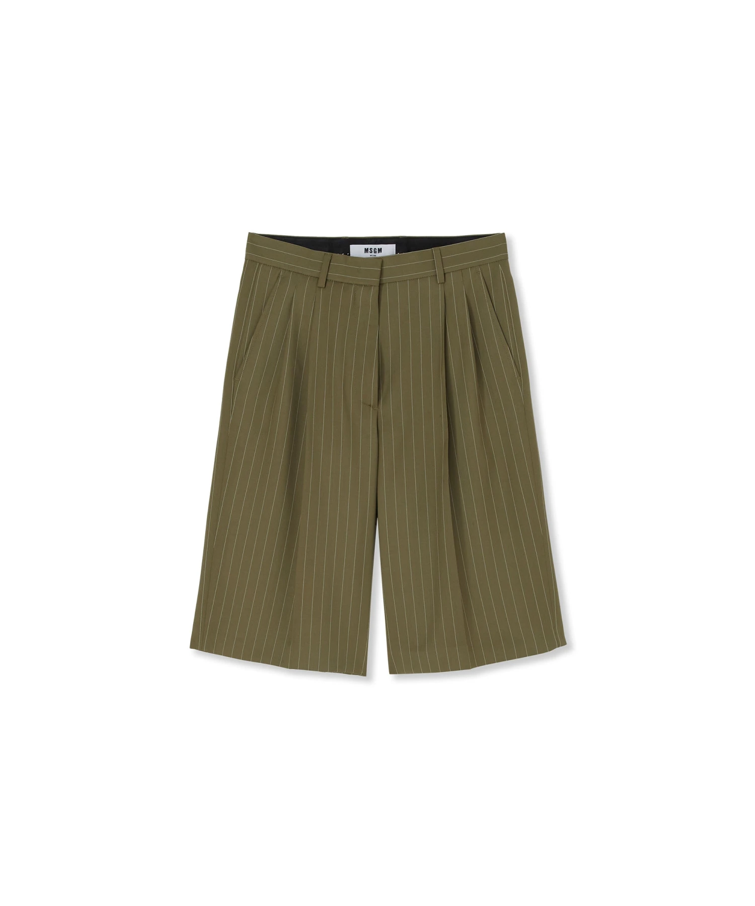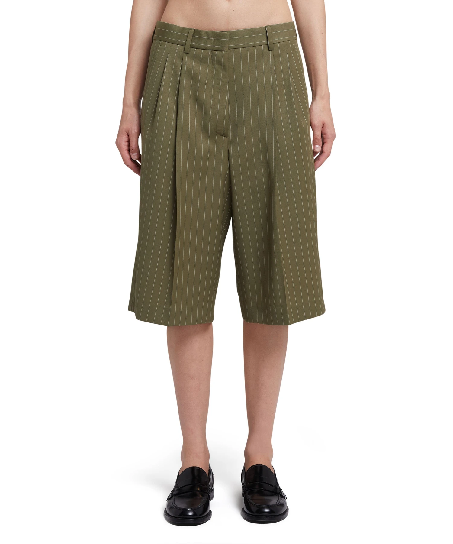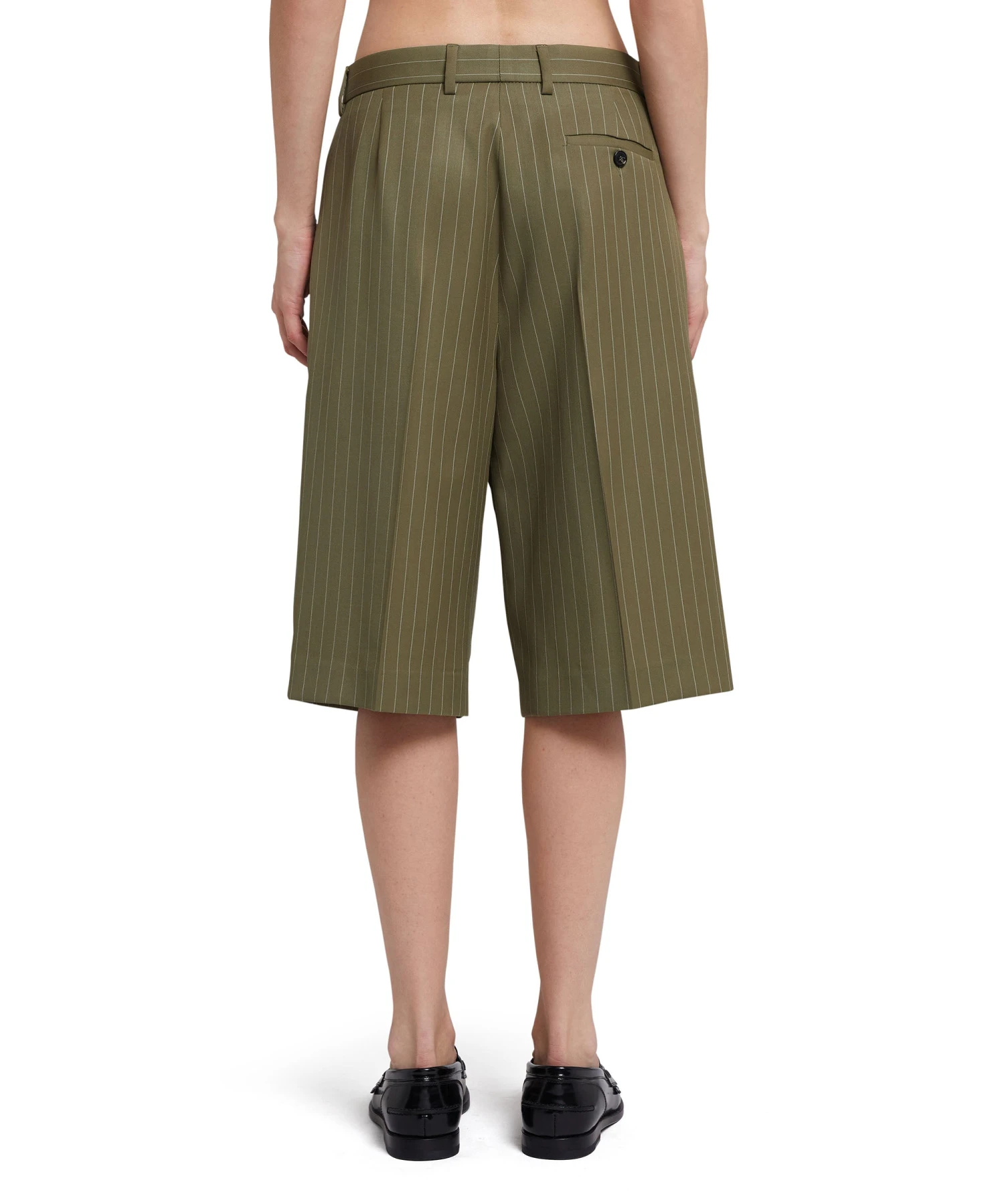 Fresh wool bermuda shorts with pinstripe pattern and enhanced by frontal pleats. Closure with hok andd internal counter button. Beltloops at the waist. Side and back pockets. Regular fit and below knee length.