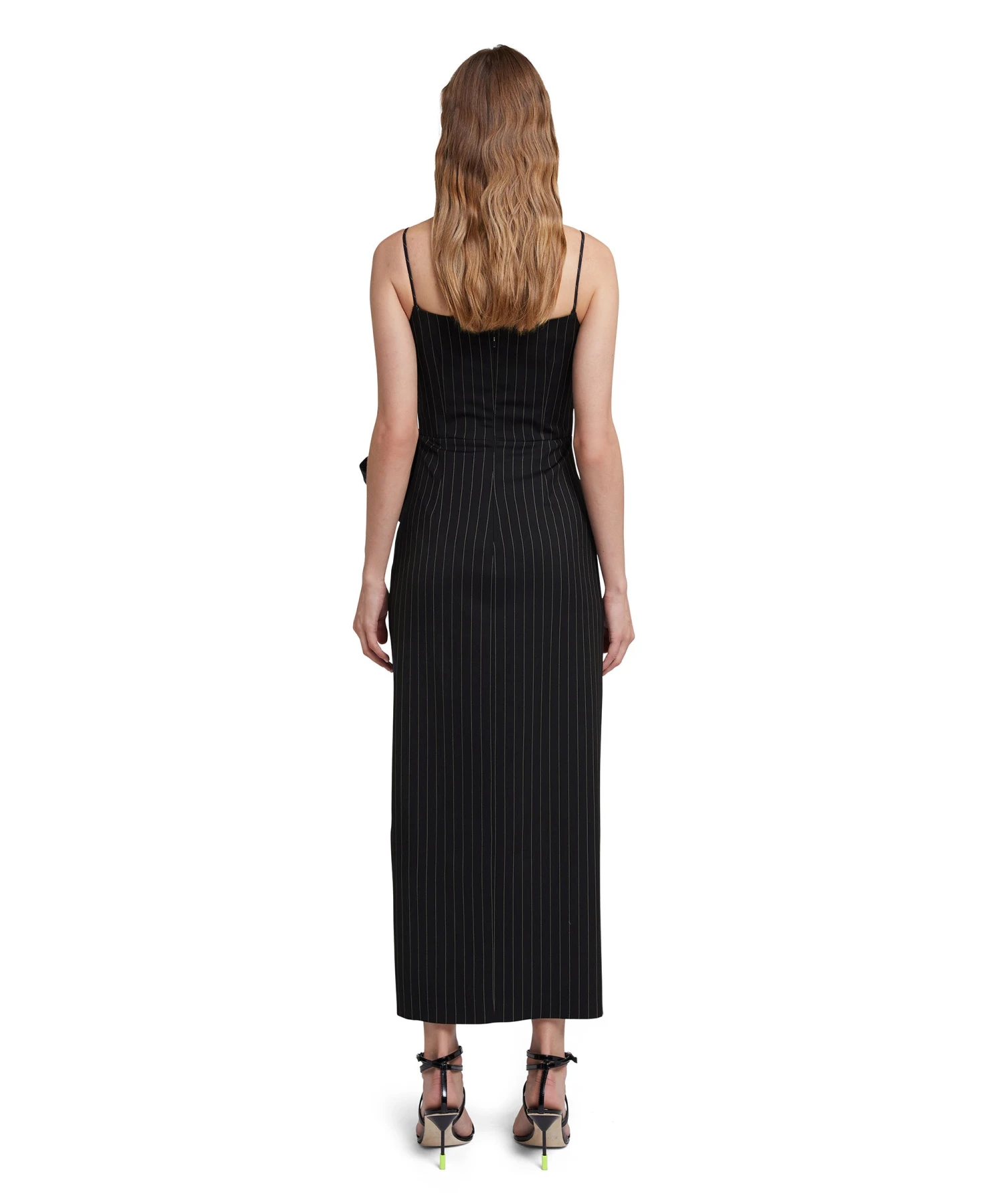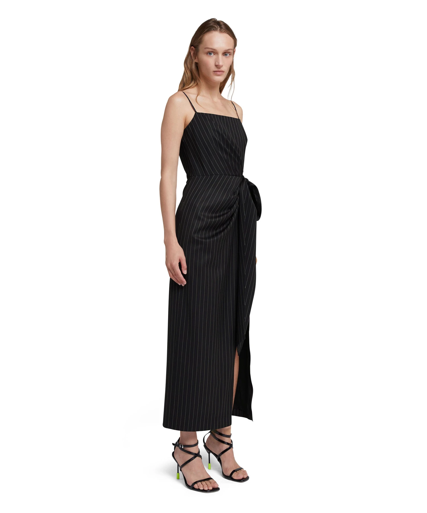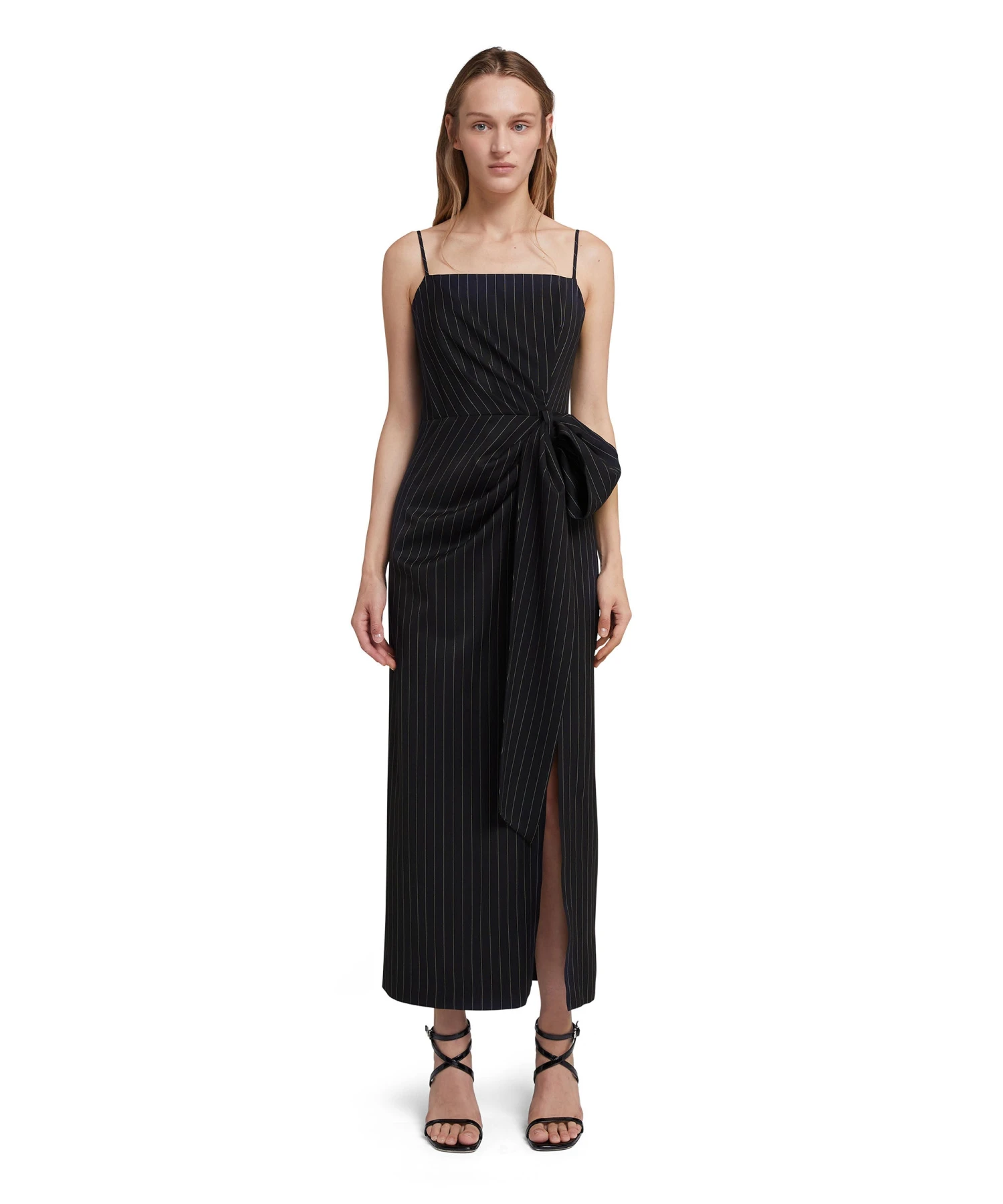 Fresh wool pinstripe dress with thin shoulder straps and bow detail at the waist. Square neckline, rear zipper closure and side slit. Regular fit.