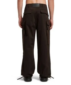 Gabardine cotton cargo pants with large pockets and adjustable drawstring at the bottom of the leg. Waist closure with hook and internal counter button, matching logo embroidered on the large pocket. Oversize fit.