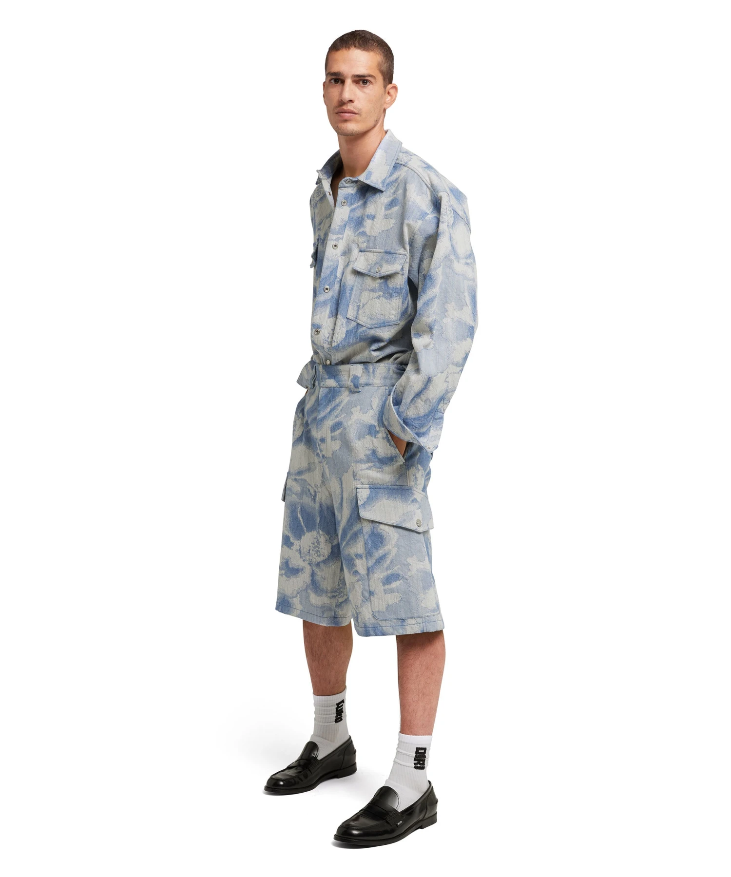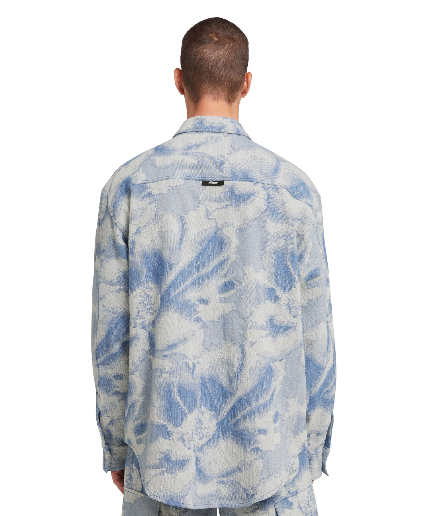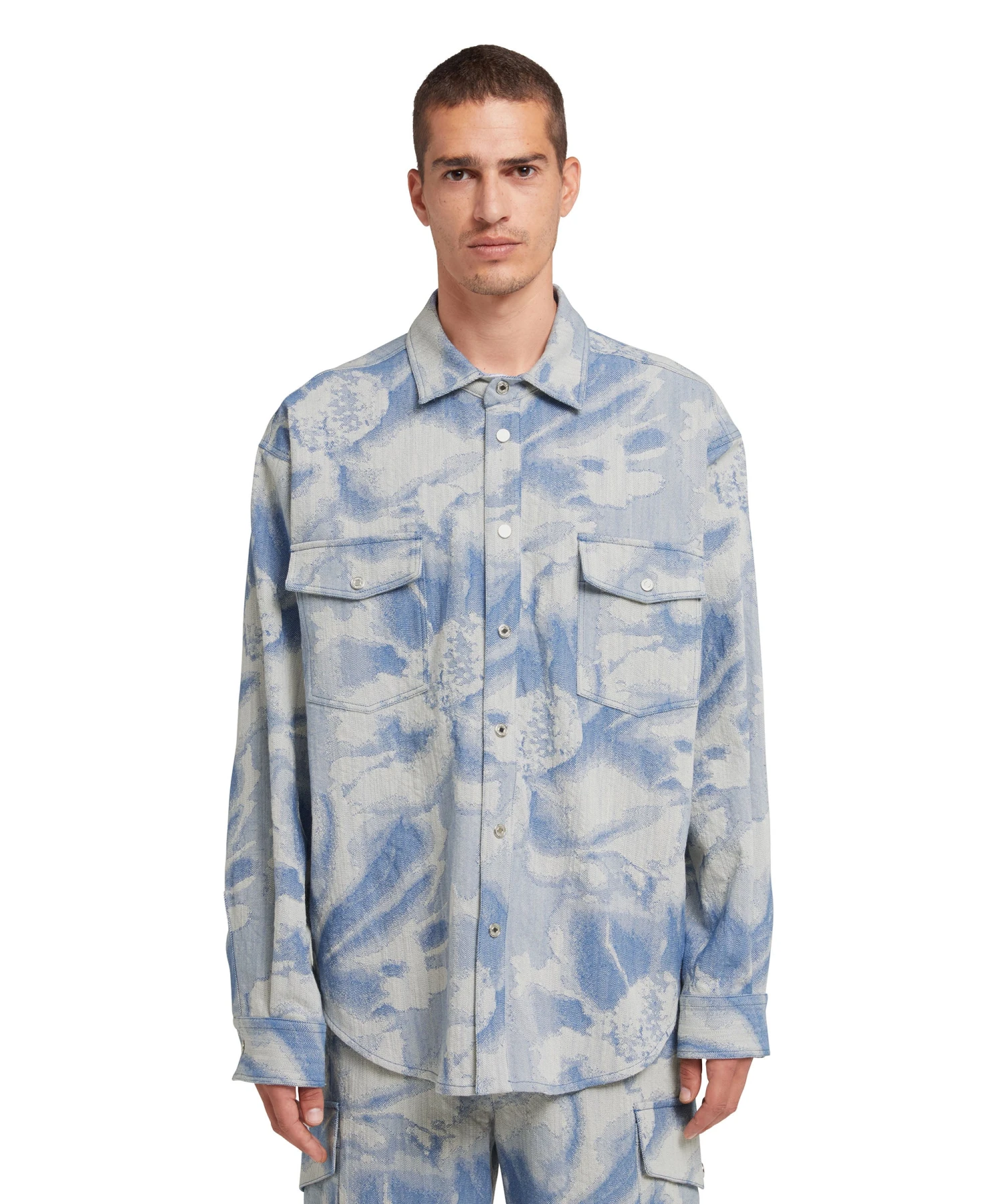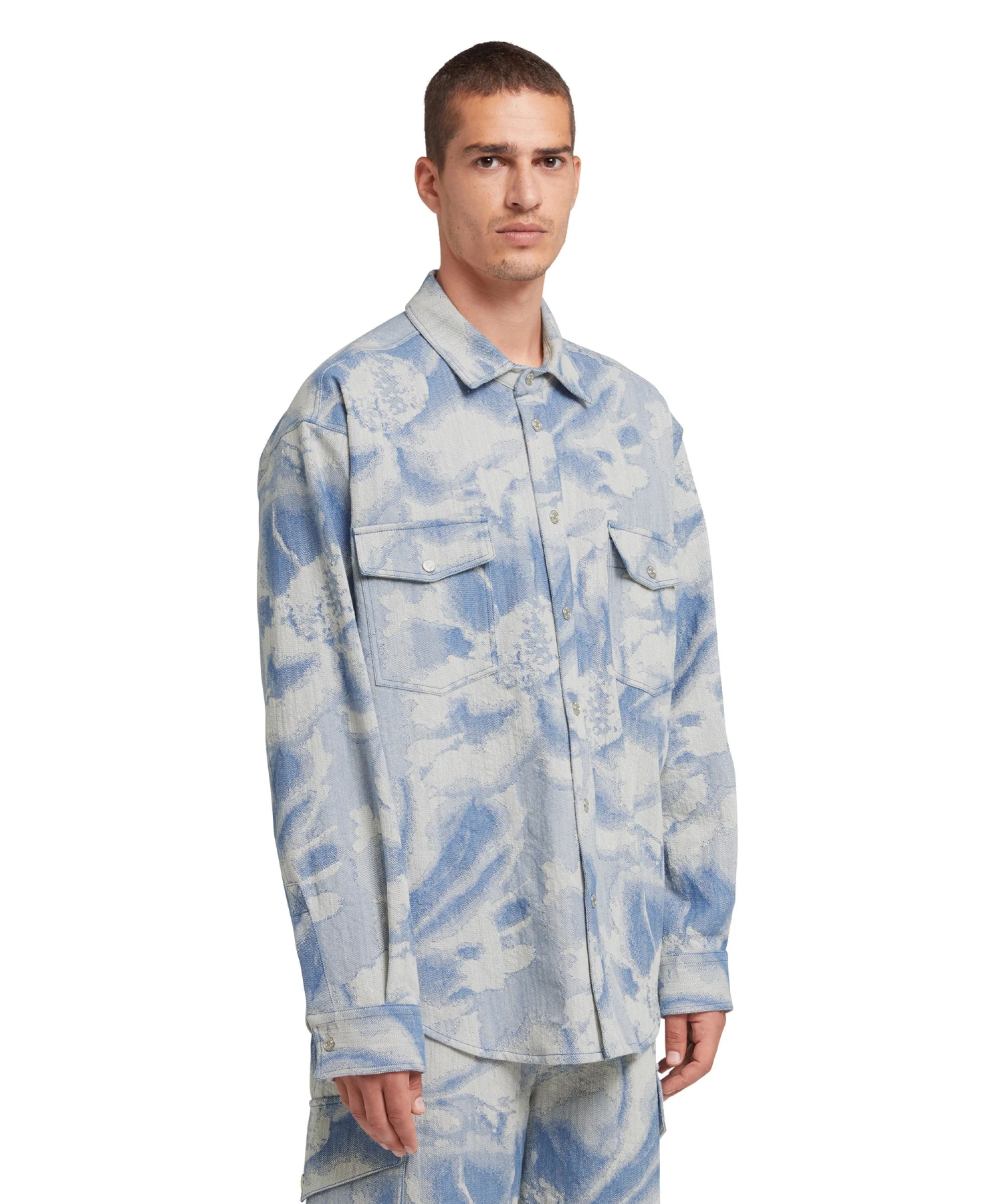 Safari is the inspiration of the theme of the Spring/Summer 24 collection. The denim with jacquard workmanship recreates the design of desert daisies. Shirt with stud buttons and logo label applied on the back. Oversize fit.
