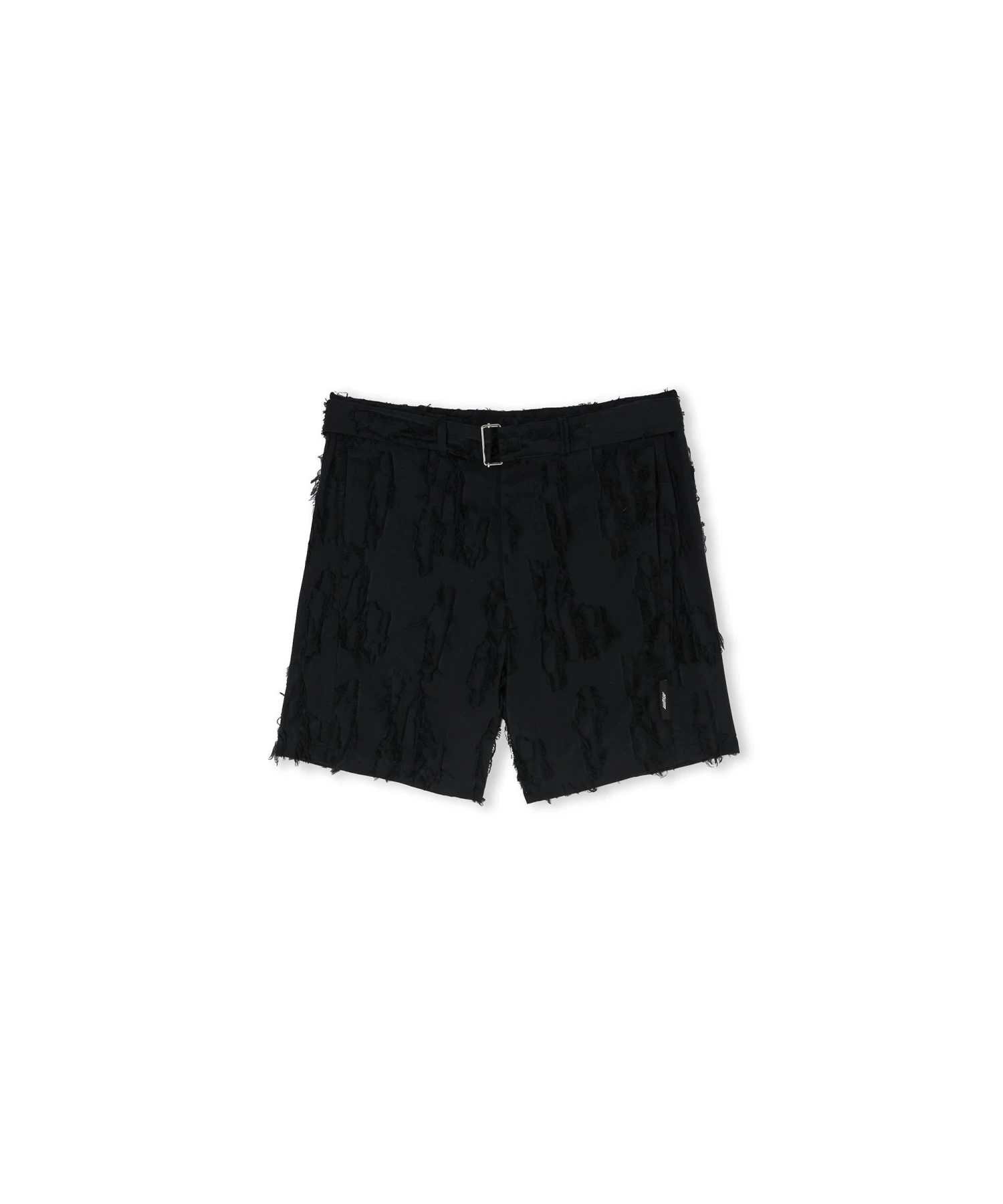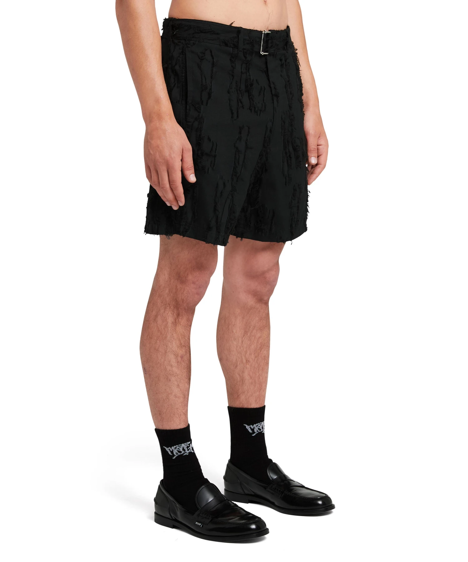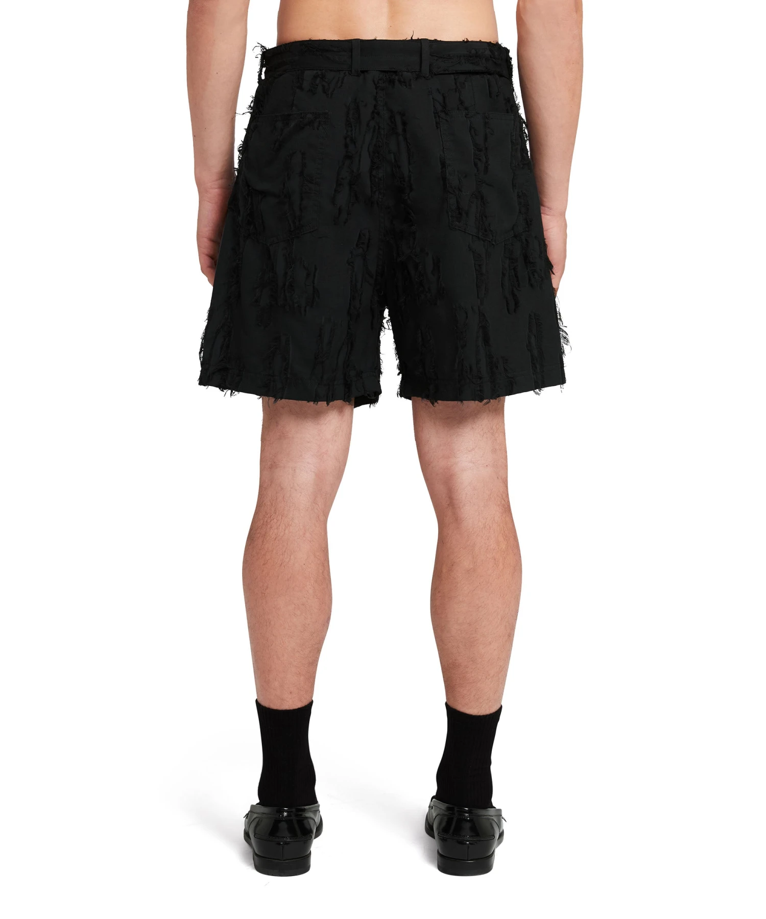 Cotton shorts with fringed jacquard design. Hook closure with internal counter button. Color coordinated belt. Side and back pockets. Regular fit and thigh length.