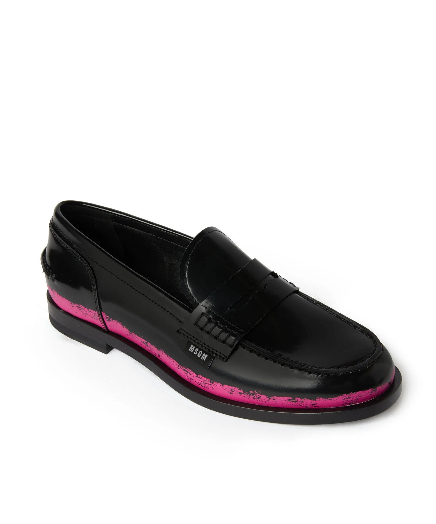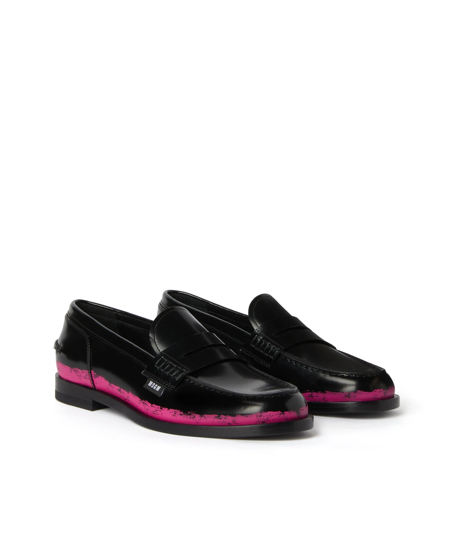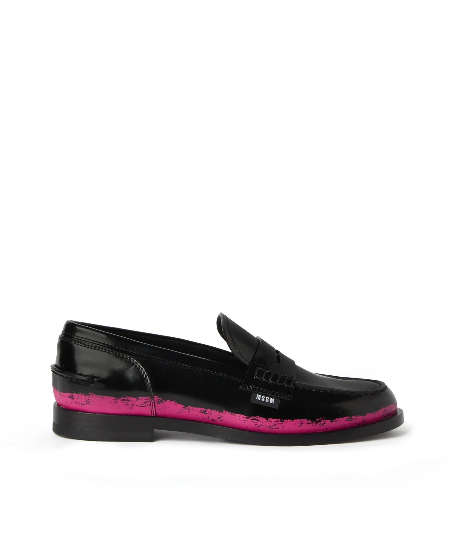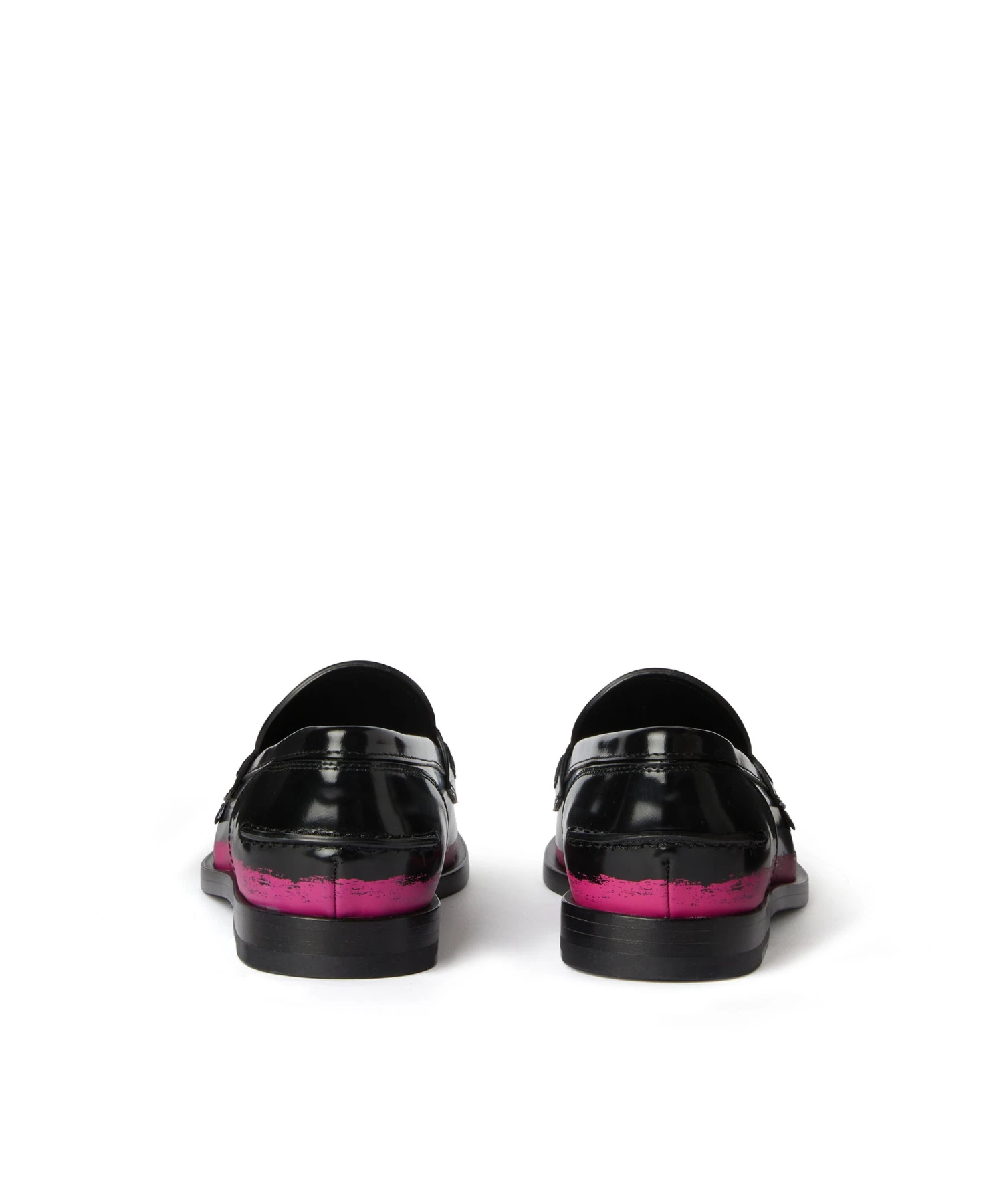 Black abraded calfskin loafers with leather soles and fuscia brushstroke print on the upper. Fabric patch with jacqard logo. Heel height: 1 cm / 0.4 inches.
