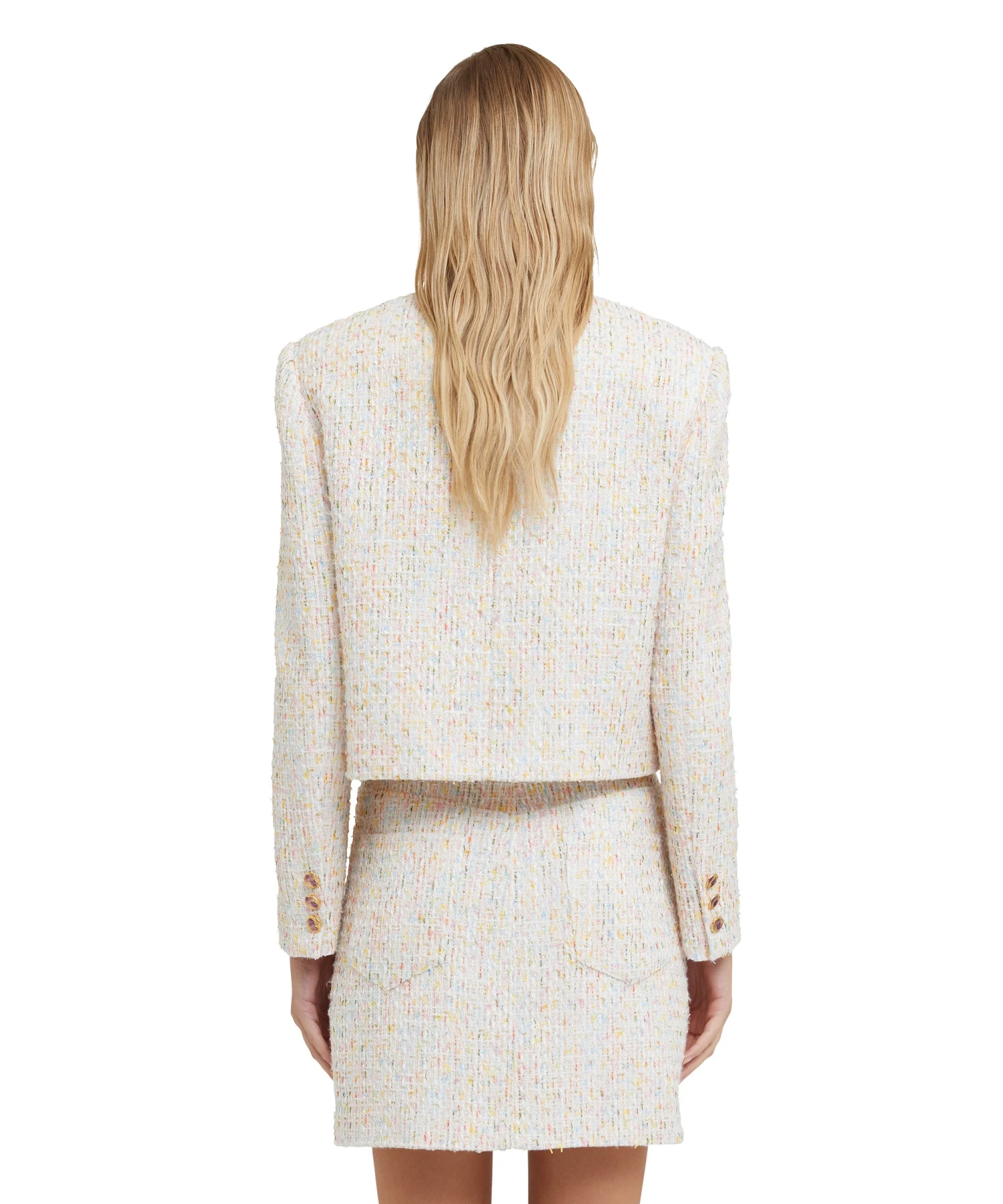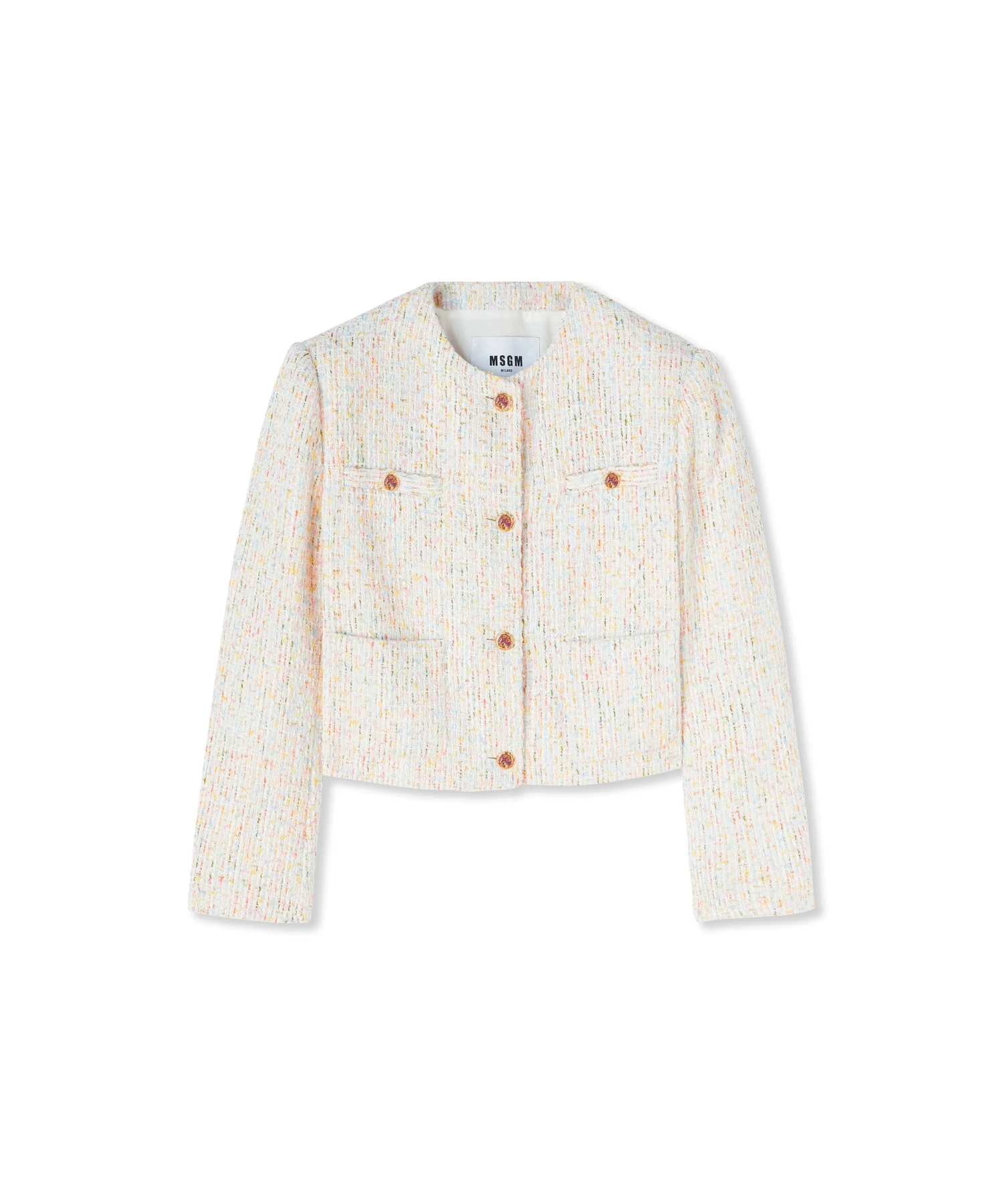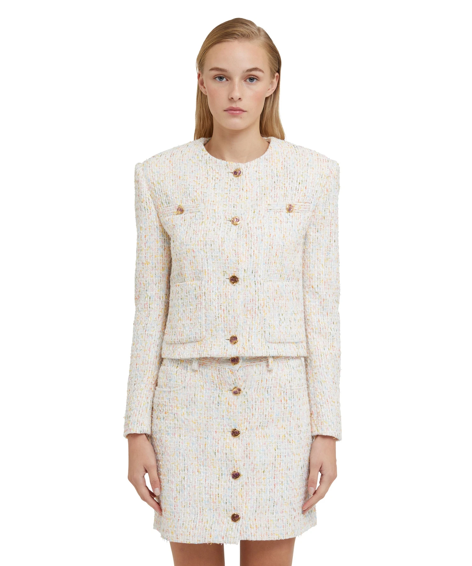 Multicolor tweed short jacket with pocket detail and jeweled buttons. Internal shoulder pads. Regular fit.