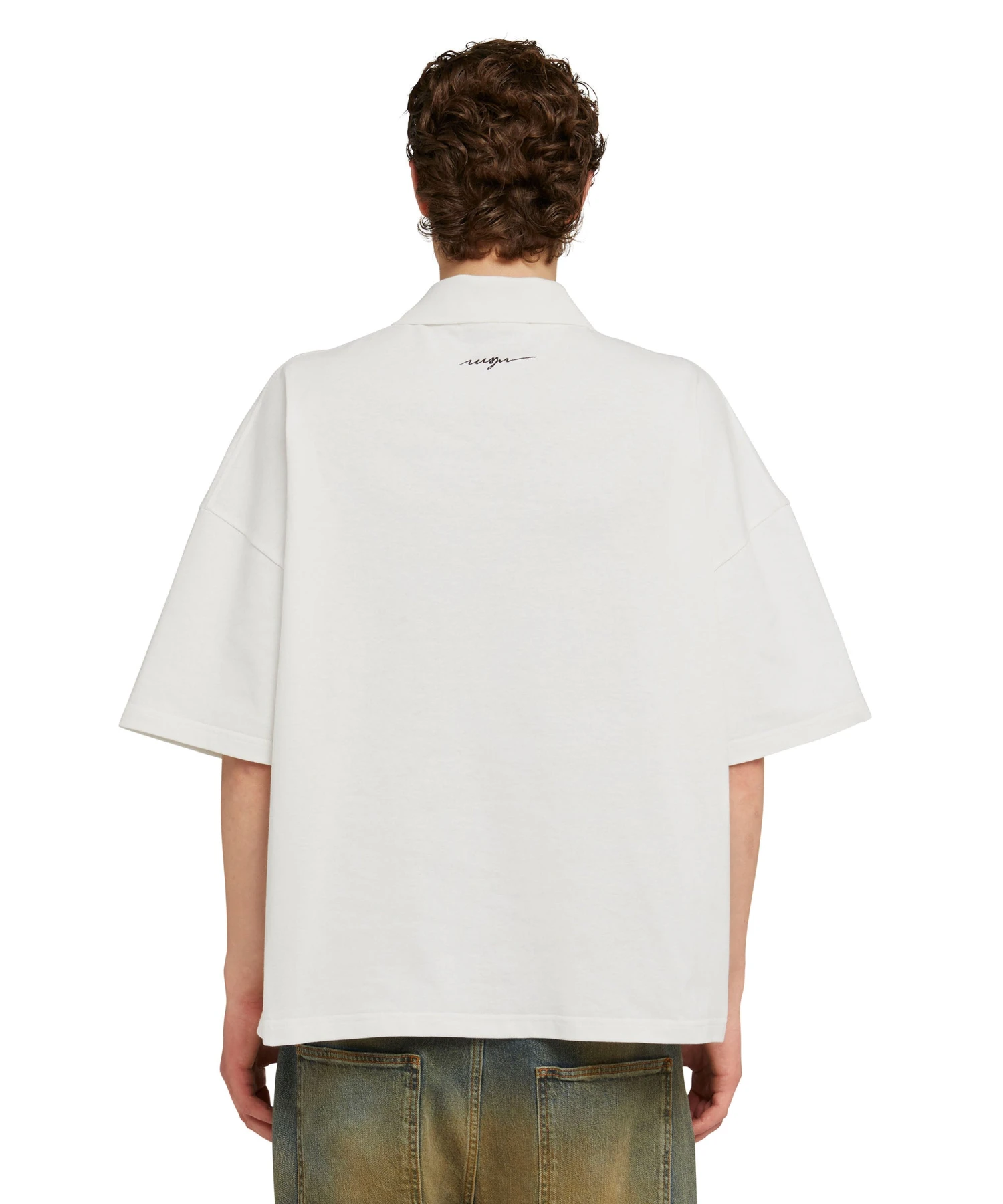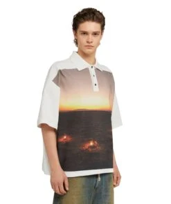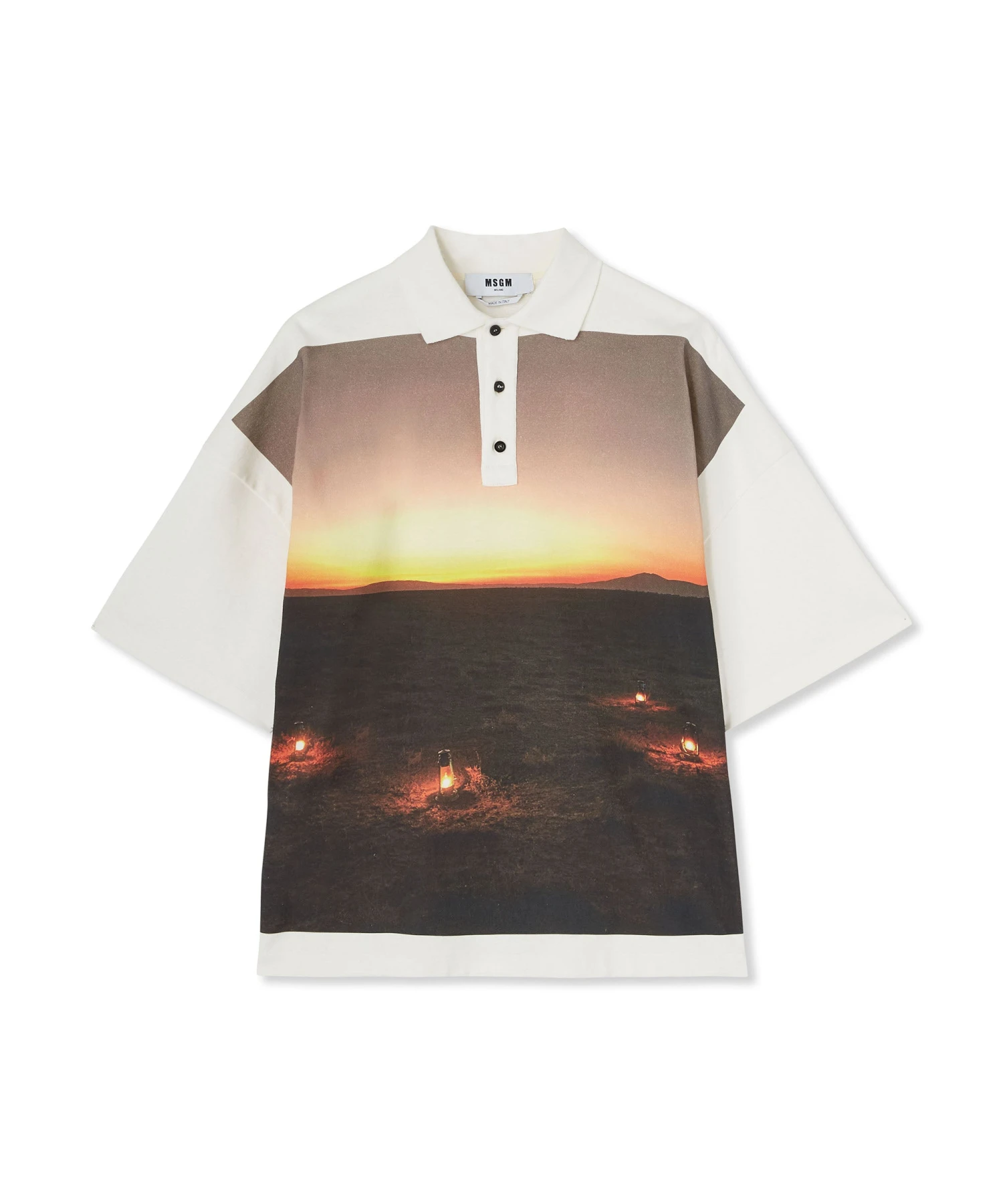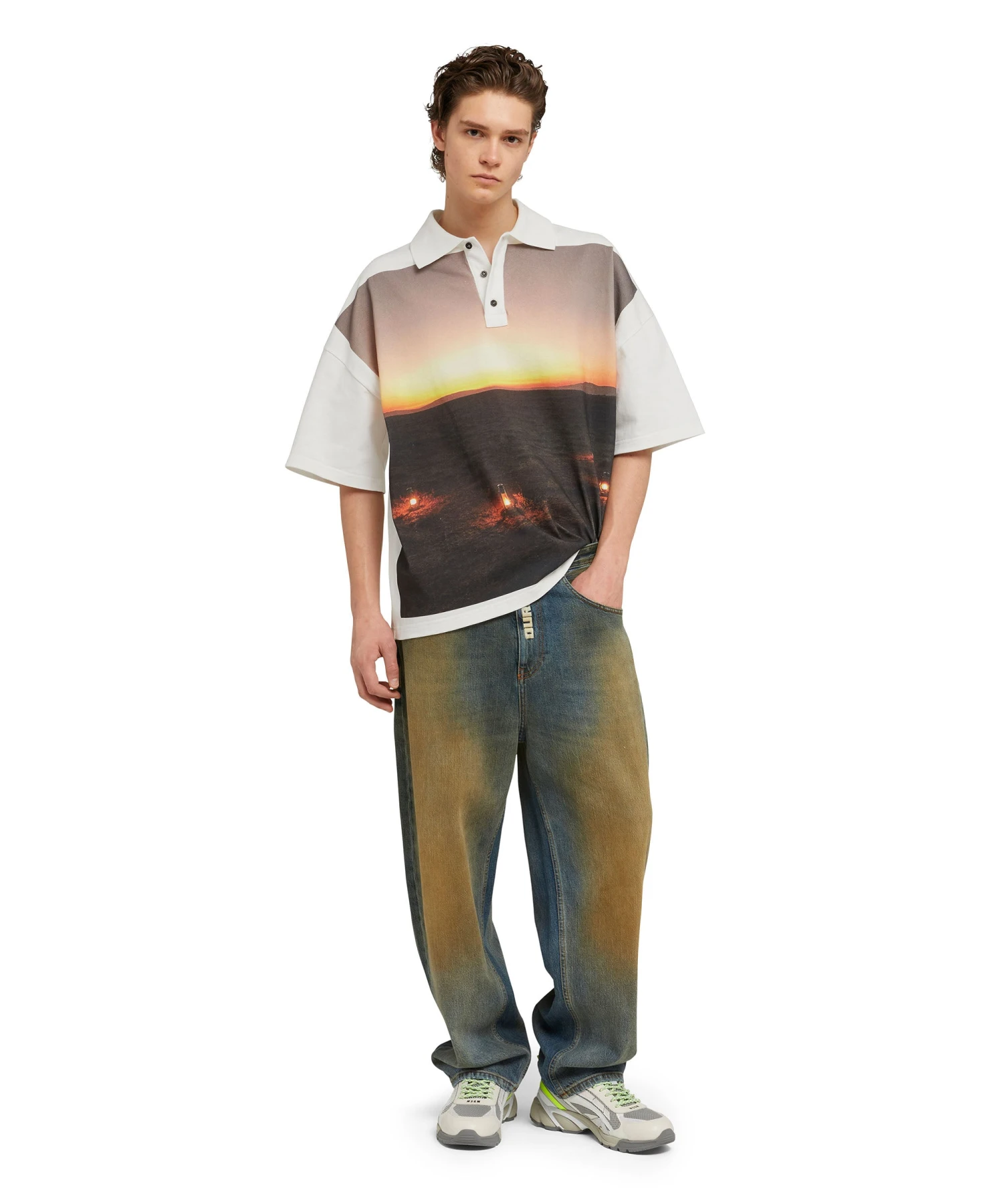 Safari is the inspiration of the theme of the Spring/Summer 24 collection. The “Tanzanian gaze torch snap” print was developed starting from a real image of a sunset on the savannah. Heavy cotton polo shirt with three visible buttons and ribbed collar. Contrasting logo embroidered on the back. Oversize fit.