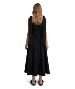 Embossed cotton poplin long waisted dress with straps with bow fastening on the shoulders. Wide side neckline and full skirt. Regular fit.
