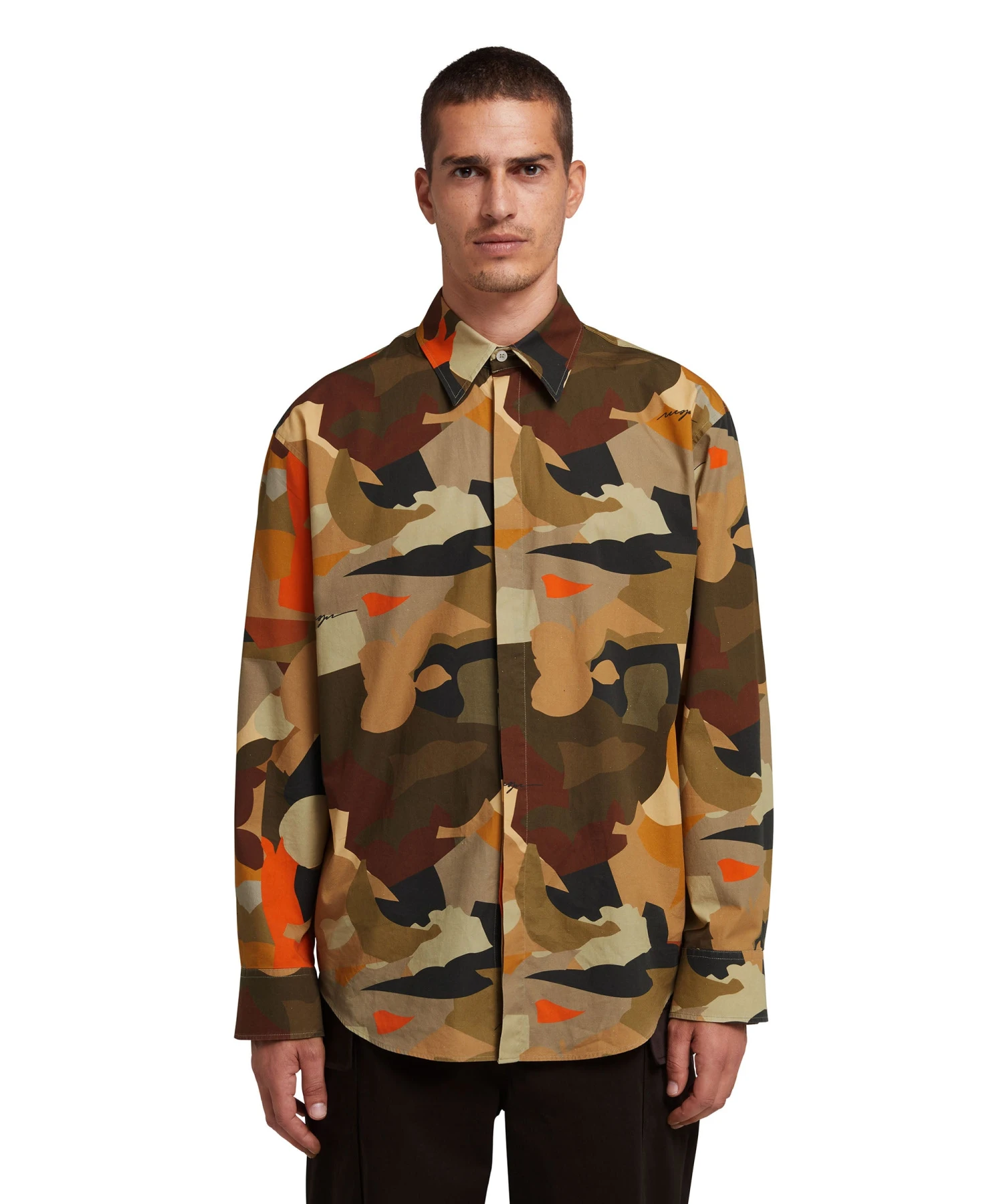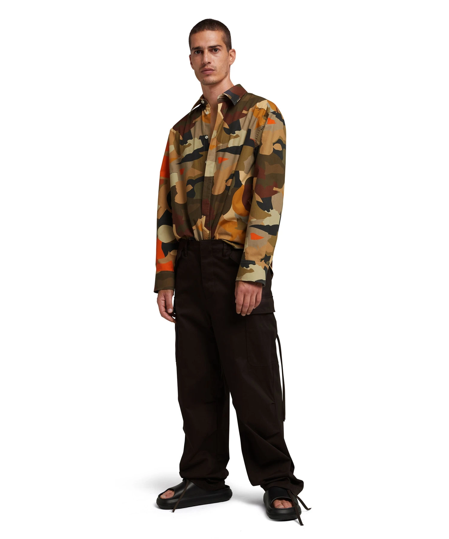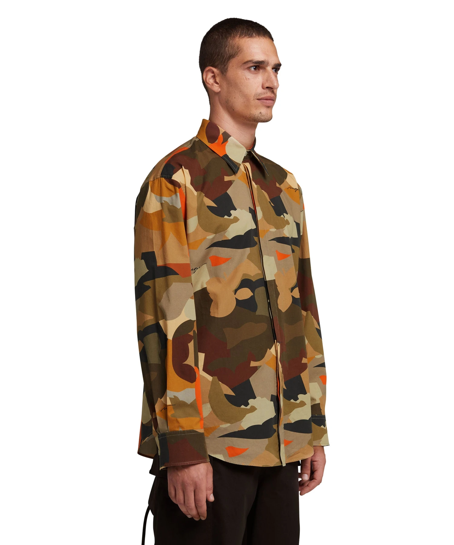 Safari is the inspiration of the theme of the Spring/Summer 24 collection. The “geo camo” print presents a revisitation of camouflage in a geomterical key. Printed poplin shirt with hidden buttons and logo label applied on the back. Oversize fit.