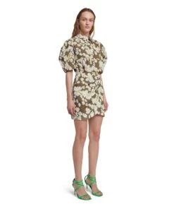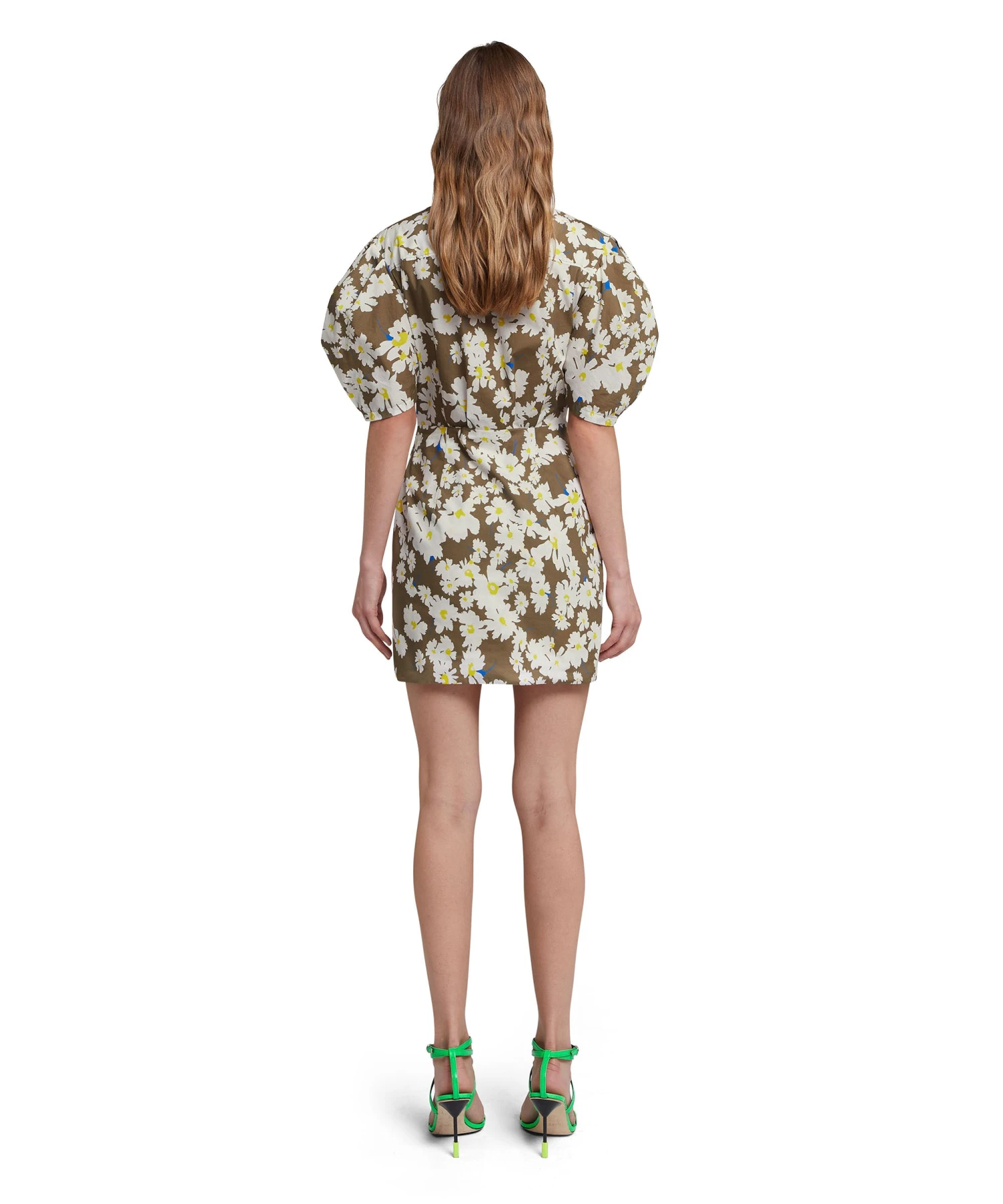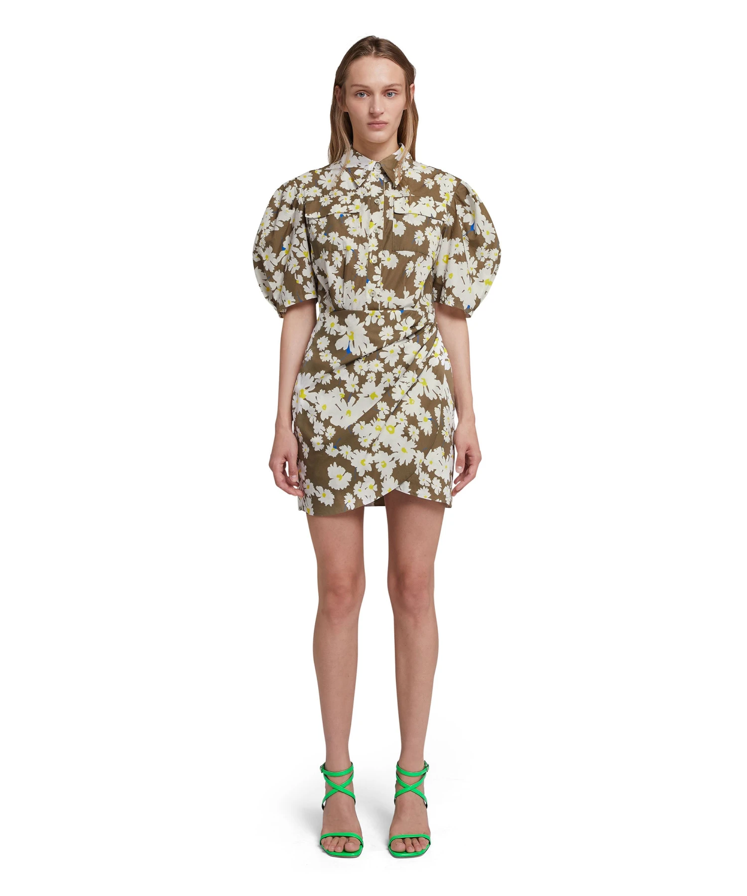 Short poplin shirt dress with daisy print all-over and draped skirt. Classic collar, balloon sleeves and front closure with visible buttons. Regular fit.
