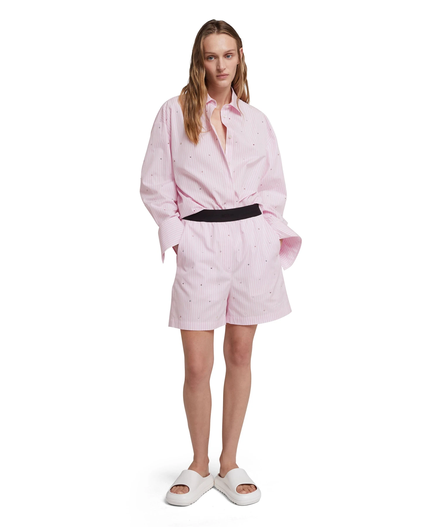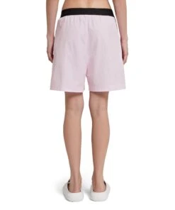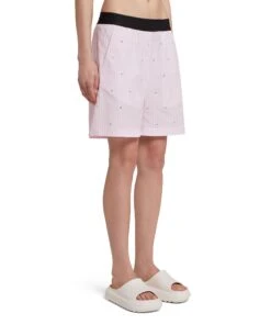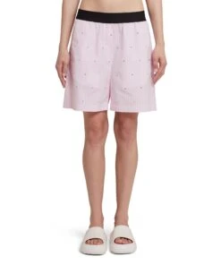 Light poplin shorts with two-tome striped pattern and rhinestone application on the front. Logoed elastic waistband. Side pockets. Regular fit.