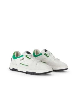 Leather sneakers with two-tone rubber basketball sole. Flat waxed cotton laces with transparent ends. “Rock” application in PTU on the back. Fabric “signature” label and printed logo on the side. Bottom height: 3.5 cm / 1.4 inches.