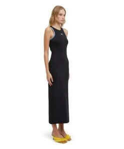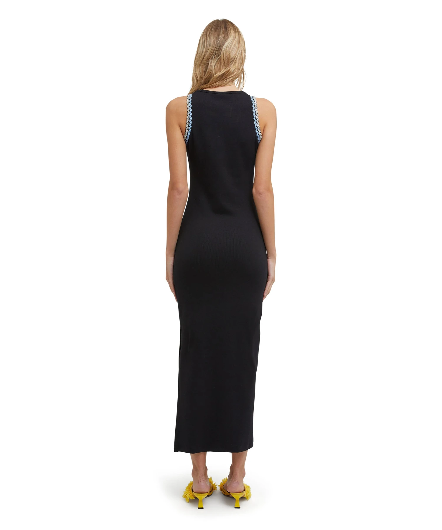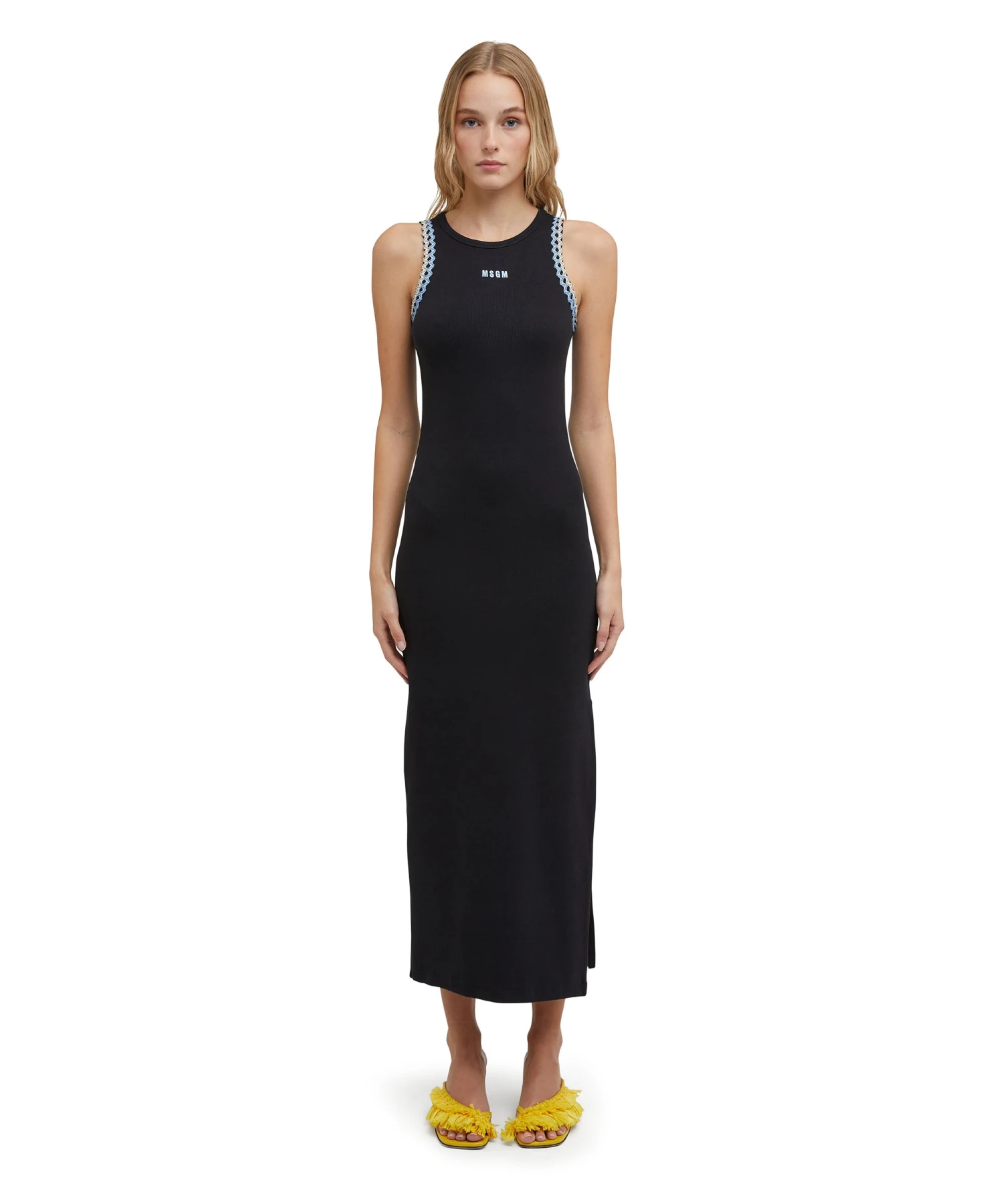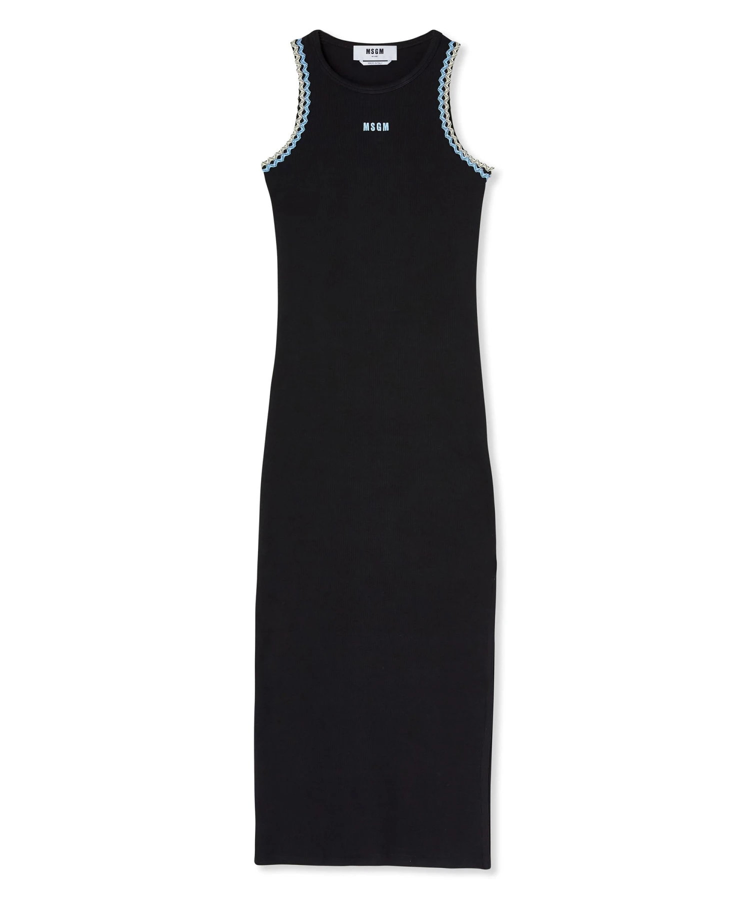 Ribbed jersey long sleeveless dress with decorative applications on the armhole and contrasting MSGM logo embroidered on the chest. Deep side slit at the bottom. Snug fit.