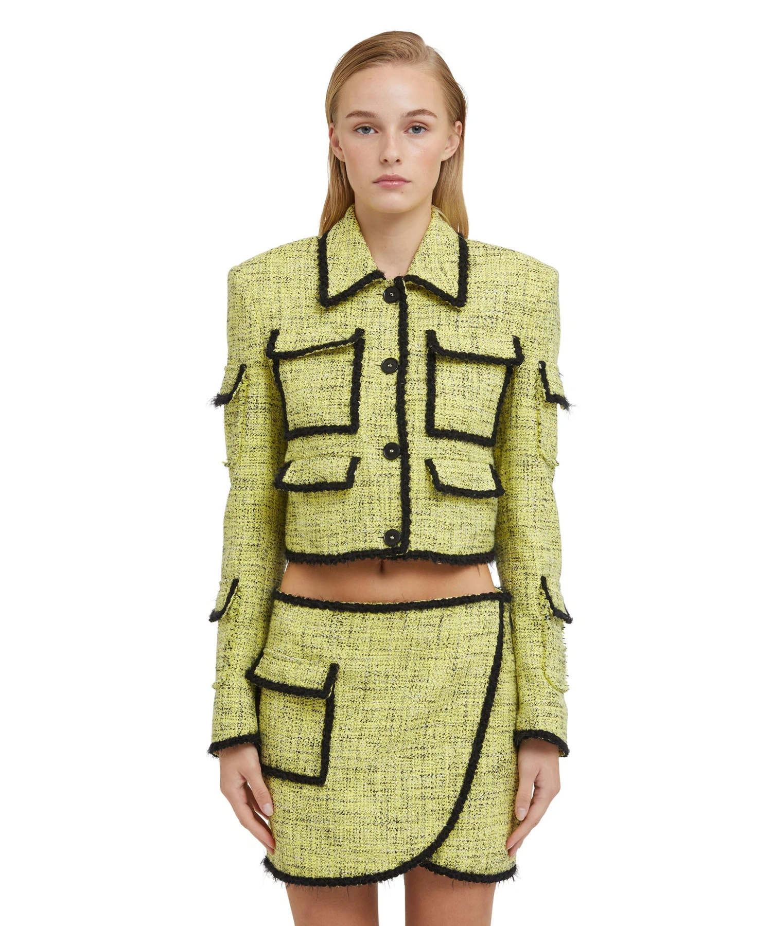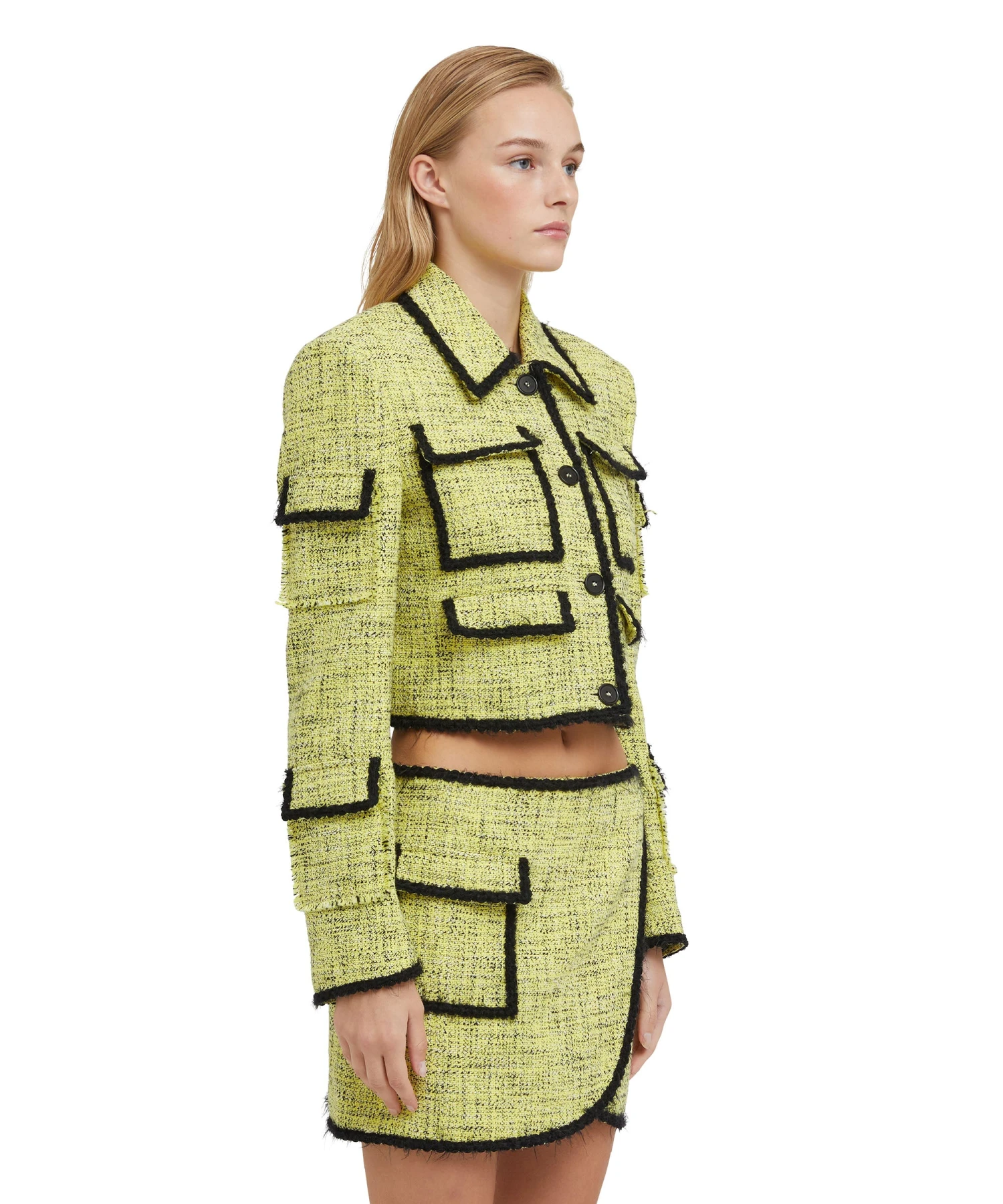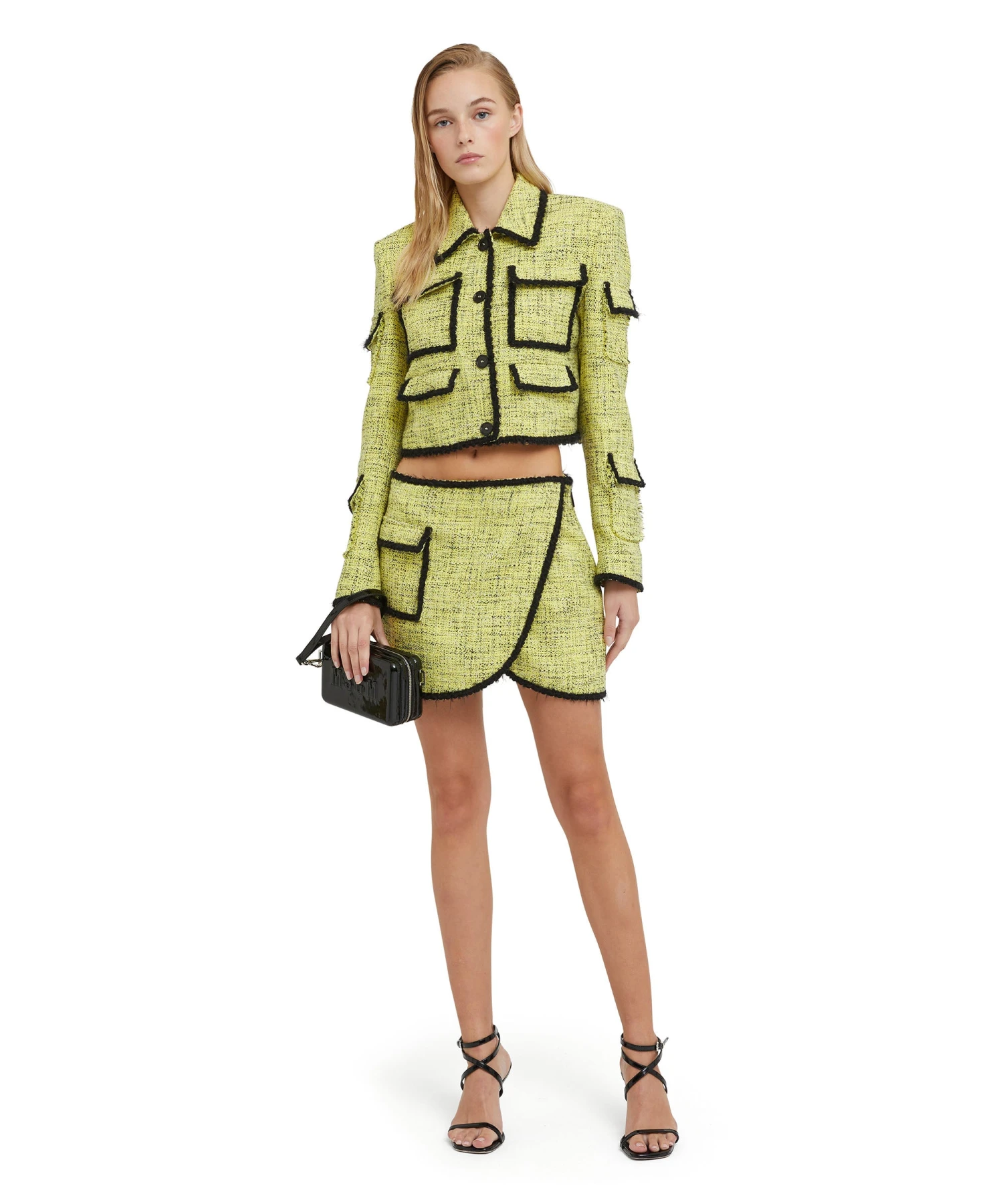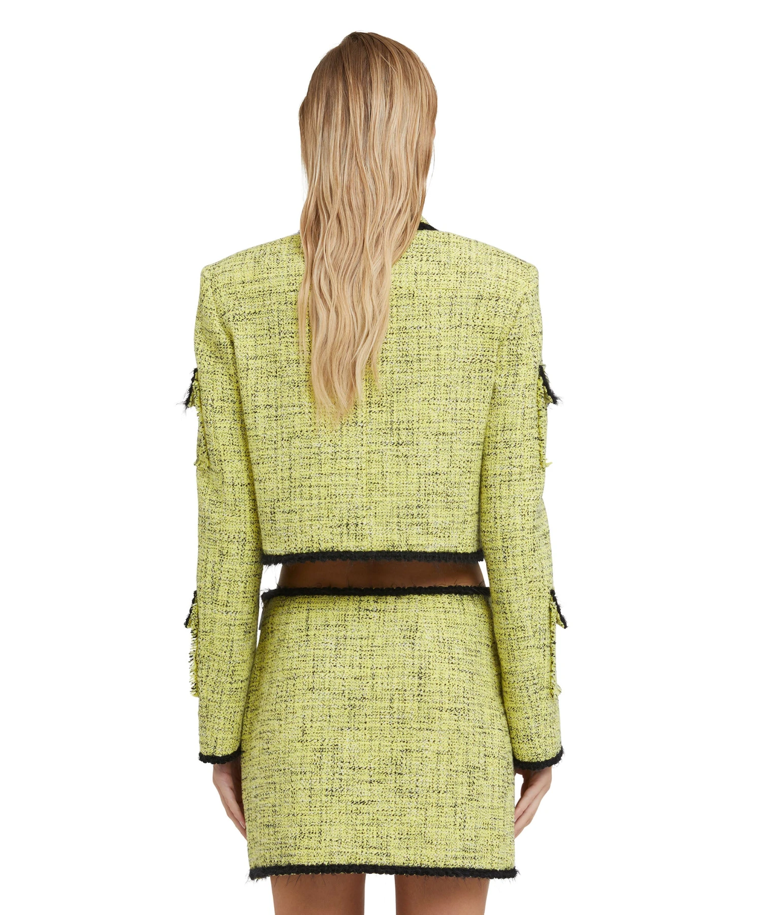 Salt and pepper tweed short jacket with pocket detail and contrasting trim. Internal shoulder pads. Regular fit.