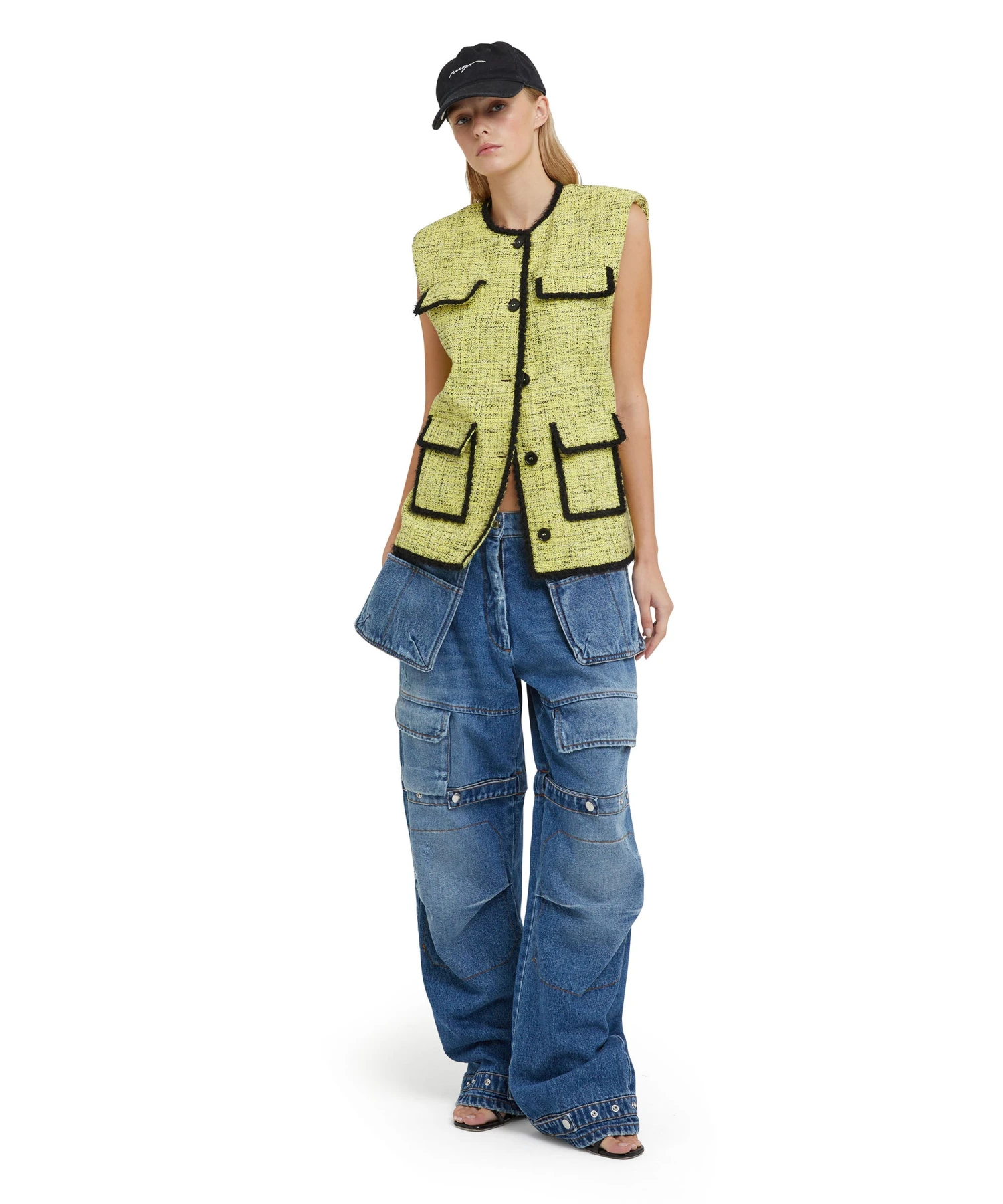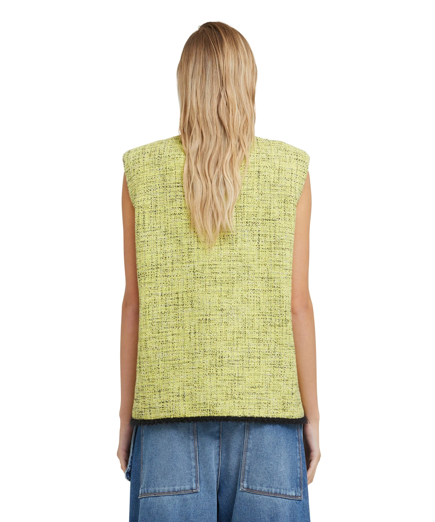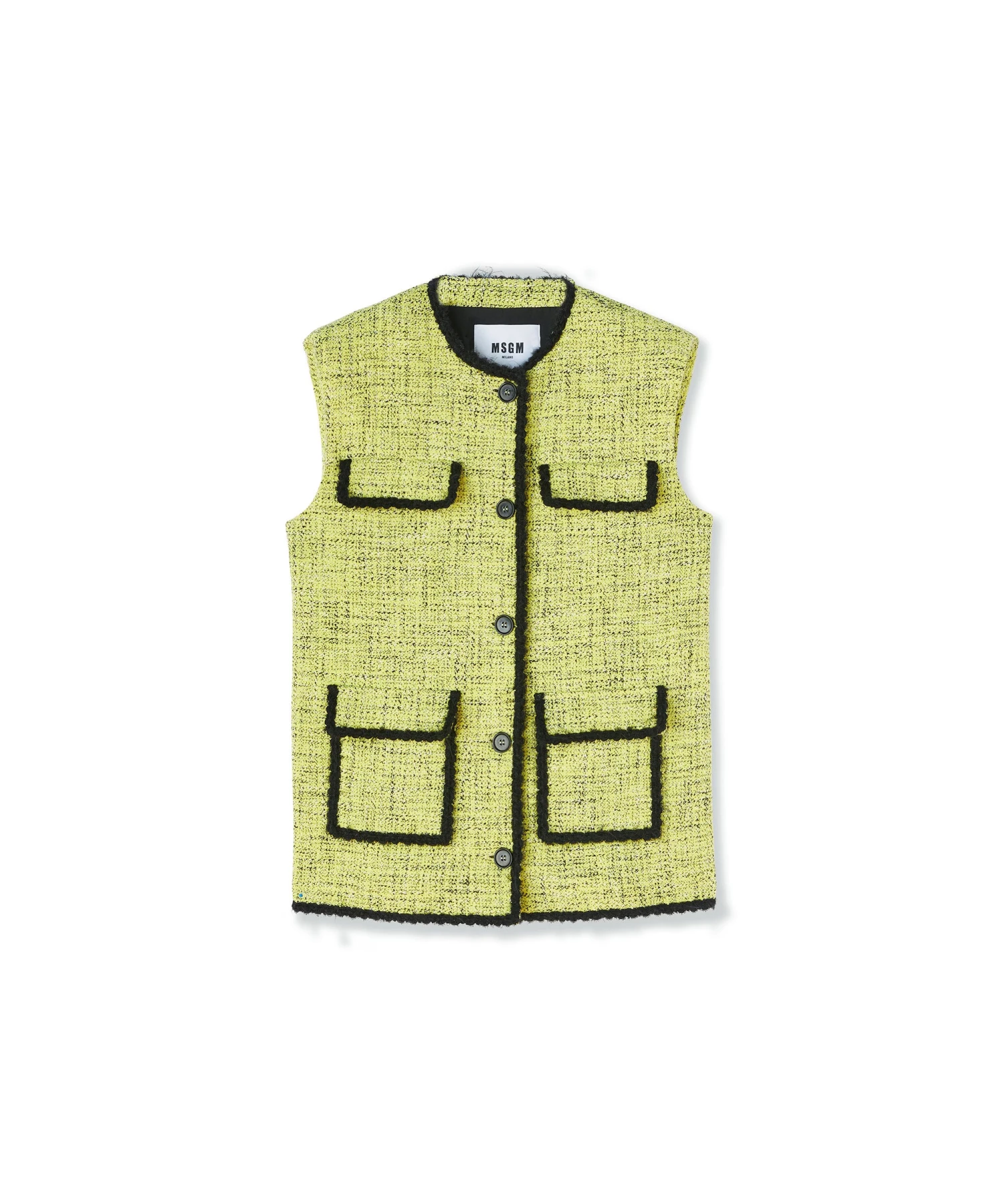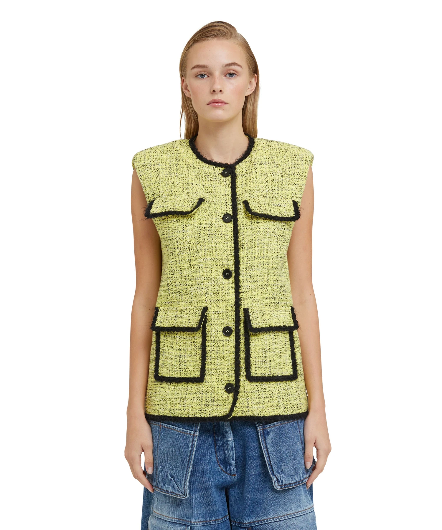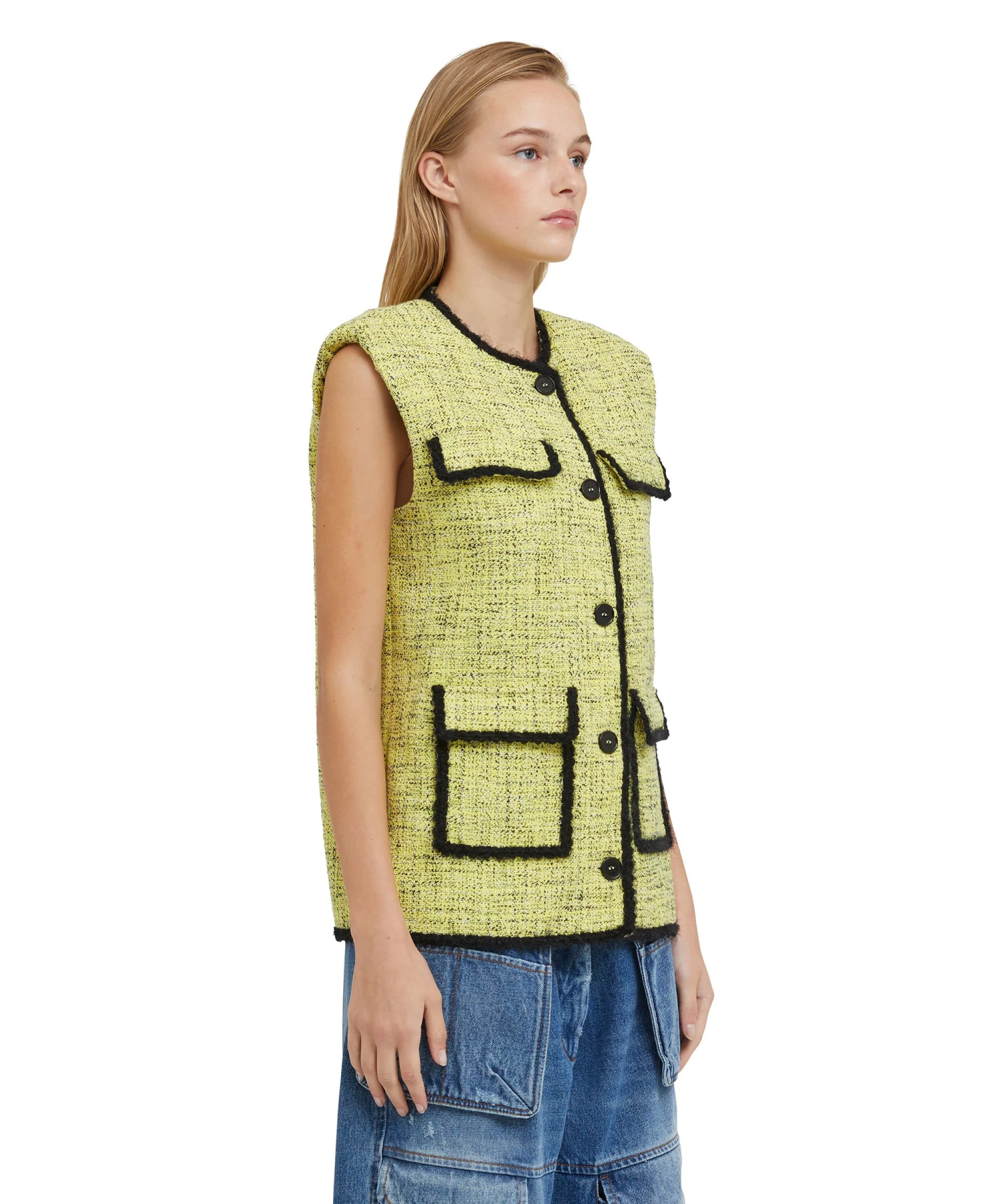 Salt and pepper tweed sleeveless jacket with pocket detail and contrasting trim. Regular fit.