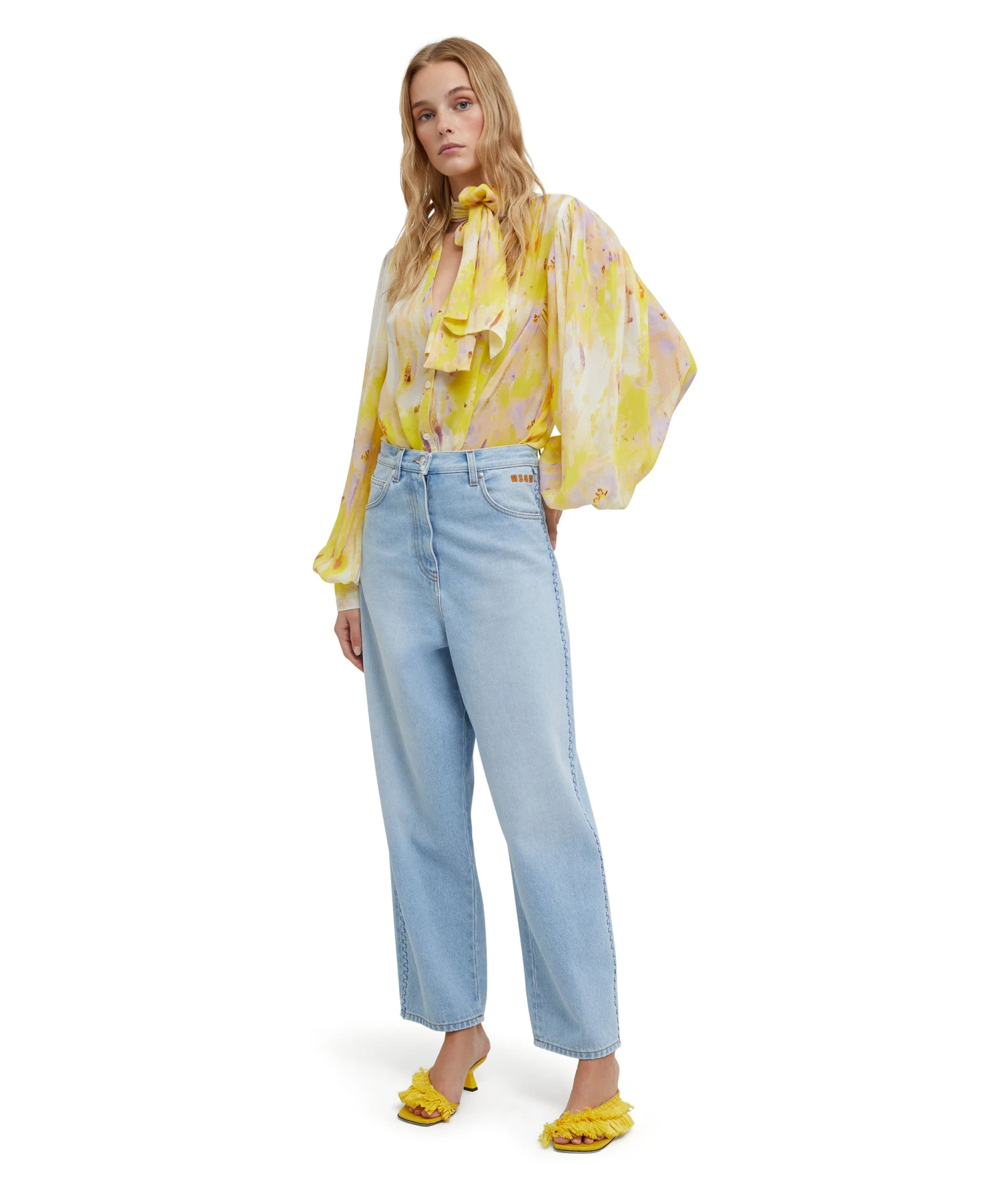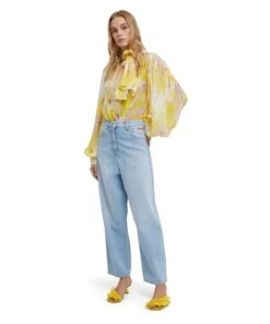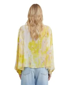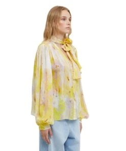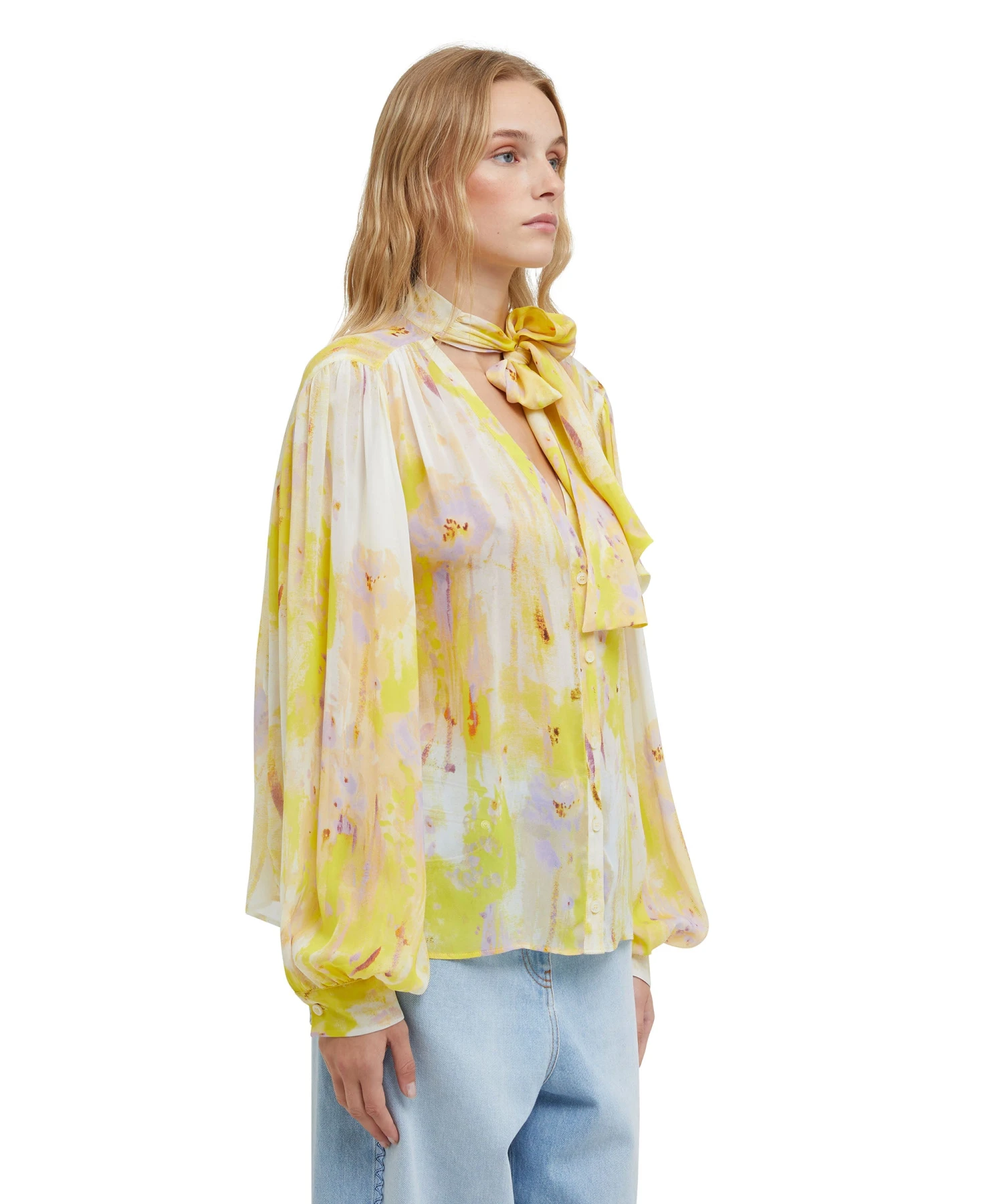 Georgette shirt with “artsy flower” print all-over with roomy puffed sleeves and sashed neck. V neck collar, closure with visible buttons. Regular fit.