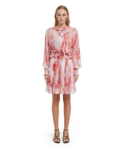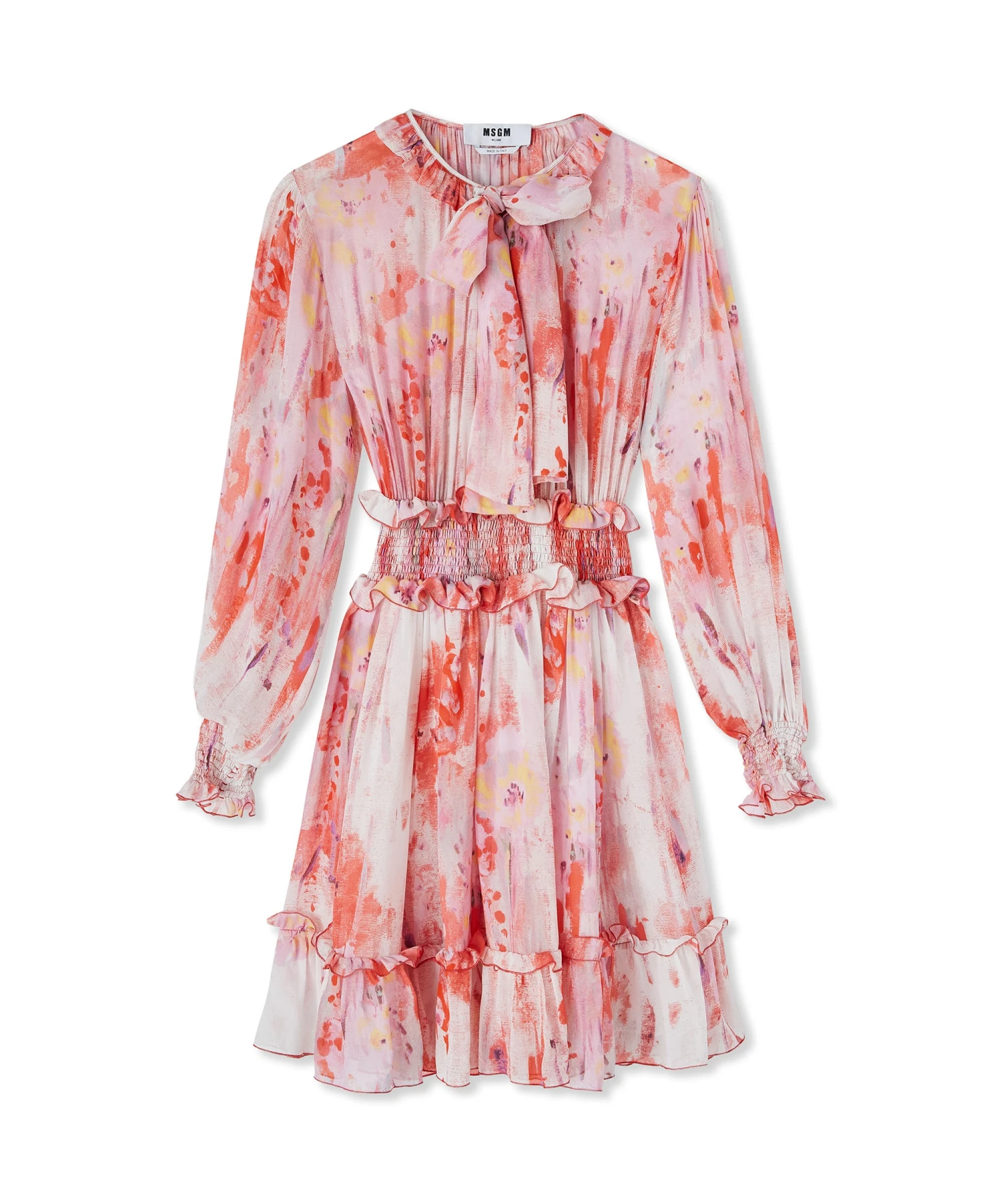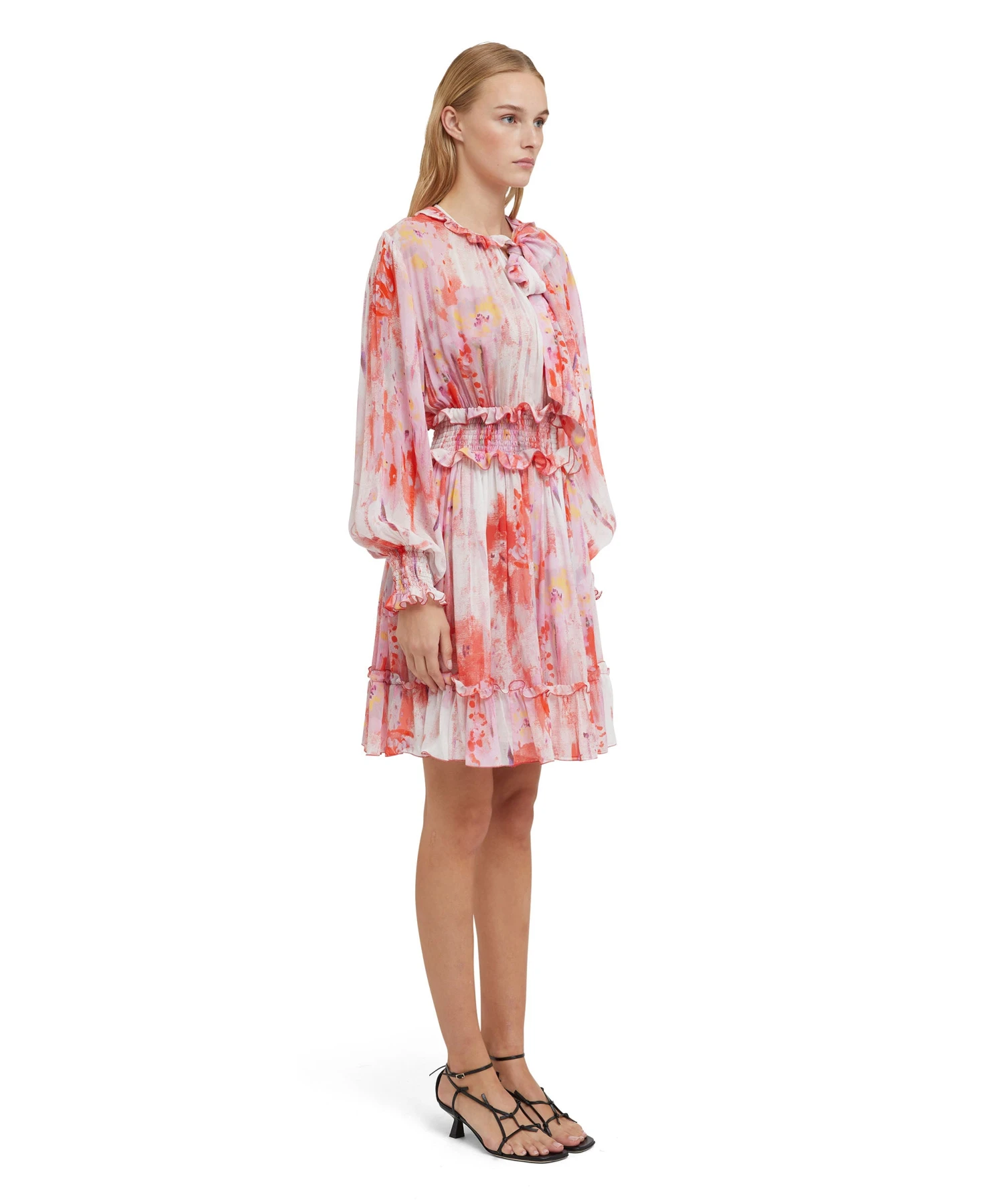 Georgette fabric short dress with “artsy flower” print all-over, decorated with small ruffles with elasticized waistband and cuffs. Wide, roomy sleeves. Regular fit.