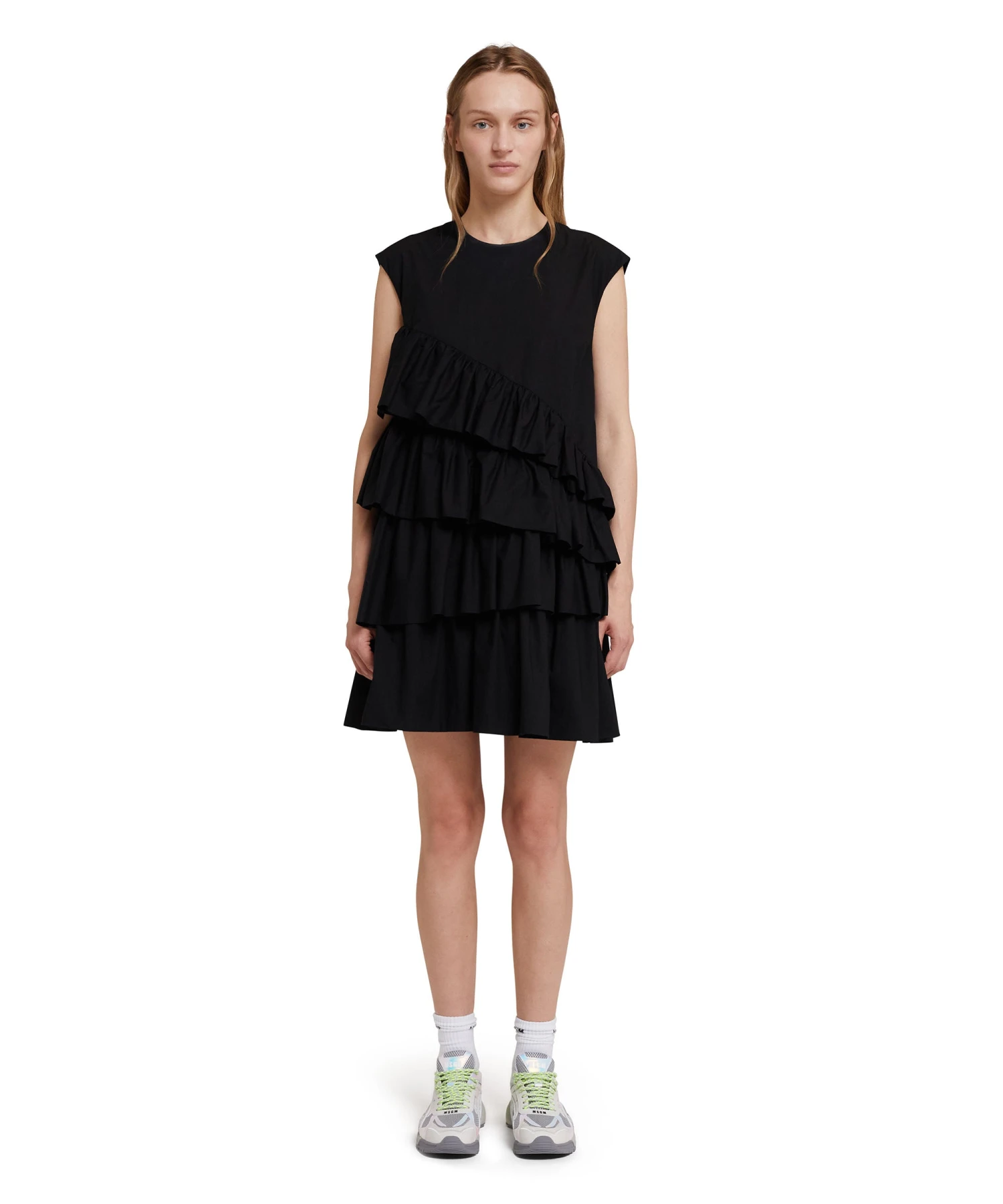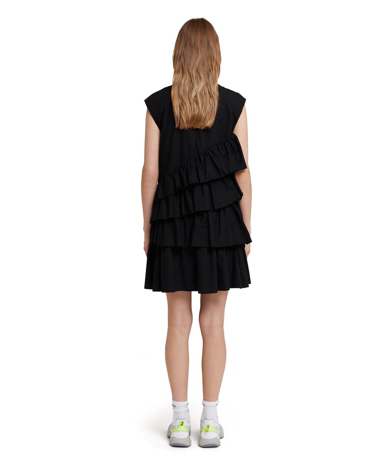 Poplin sleeveless mini dress with ruffles. Rear zipper closure. Above the knee length. Regular fit.