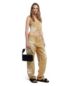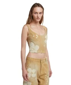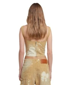 Denim sleeveless top with tie-dye treatment and daisy design. Wide neckline. Rear zipper closure. Snug fit.