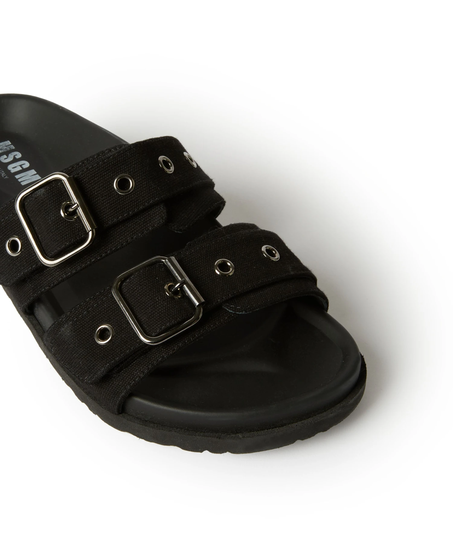 Flat canvas sandal with buckle and eyelets. Leather covered insole with rubber tread. Bottom height: 1 cm / 0.4 inches.