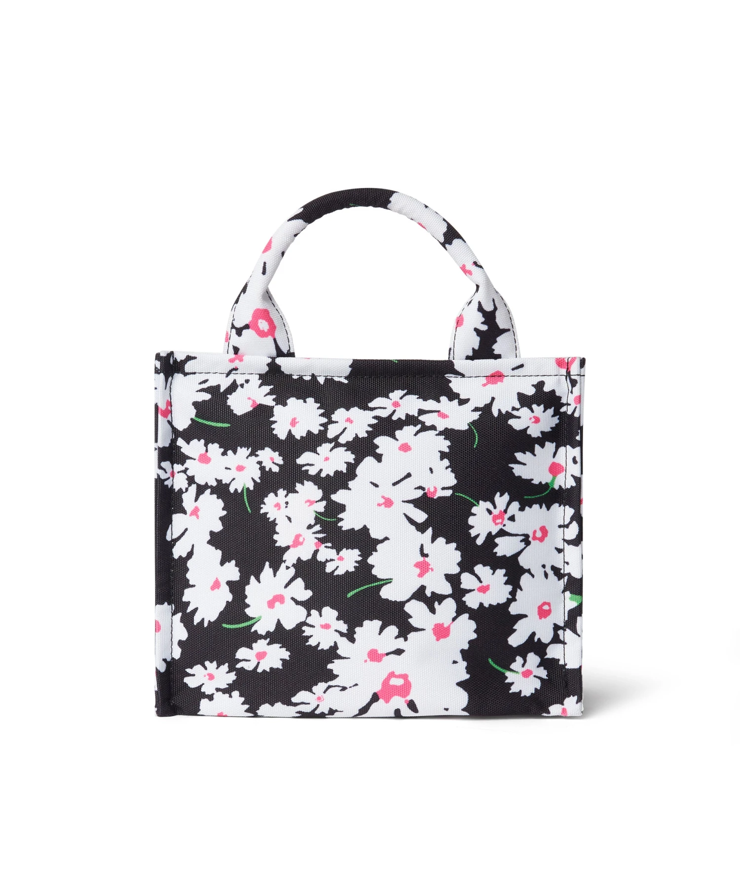 Canvas tote bag with multicolor print and printed logo. Adjustable and removable nylon gros grain shoulder strap in with matching jacquard logo. Neutral color fabric lining. Measurements: 25 x 12 x 20 cm / 9.8 x 7.7 x 7.9 inches
