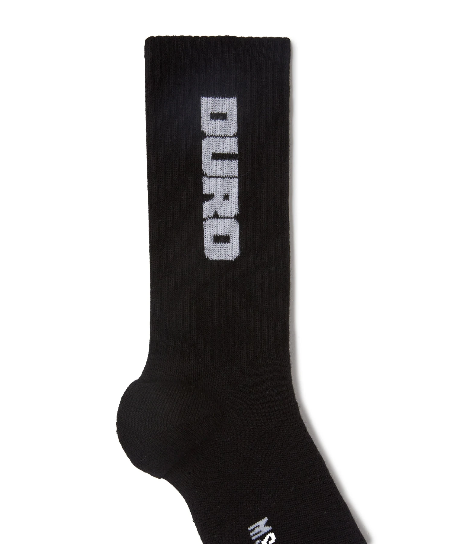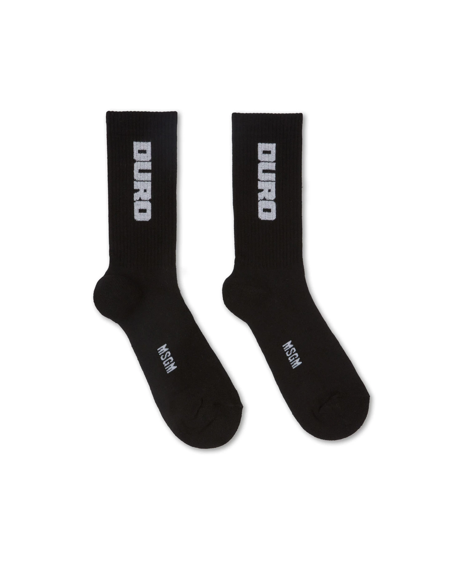 Solid color cotton socks with upper characterized by flat ribbed workmanship. This accessory is decorated with a contrasting color quote from the “duro” collection. The sole of the foot, the toe and the heel are in reinforced cotton.