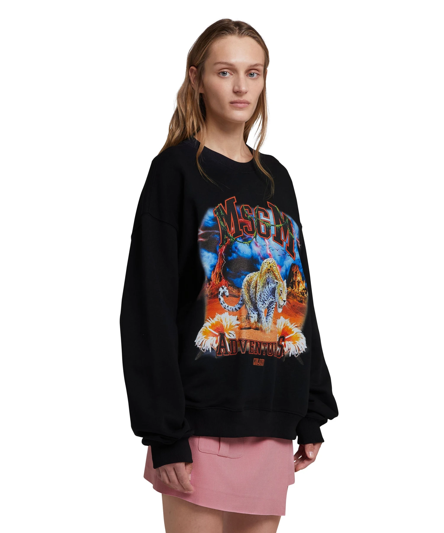 Solid color fabric crewneck sweatshirt with “MSGM adventures” graphic print on the front. Ribbed collar, cuffs and bottom. Oversize fit.