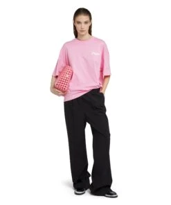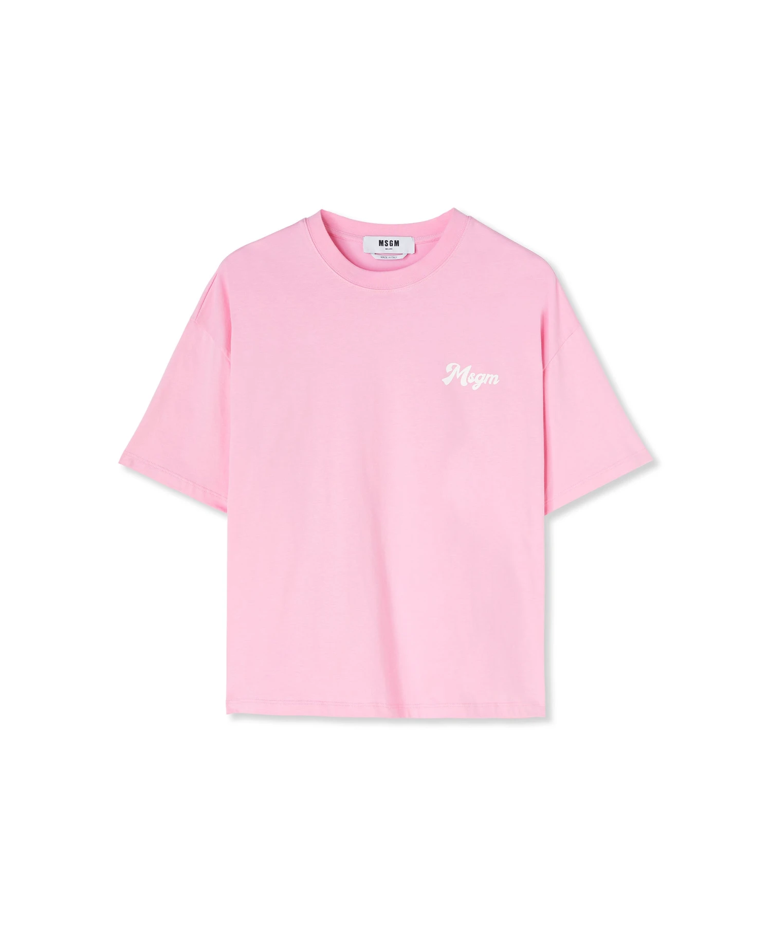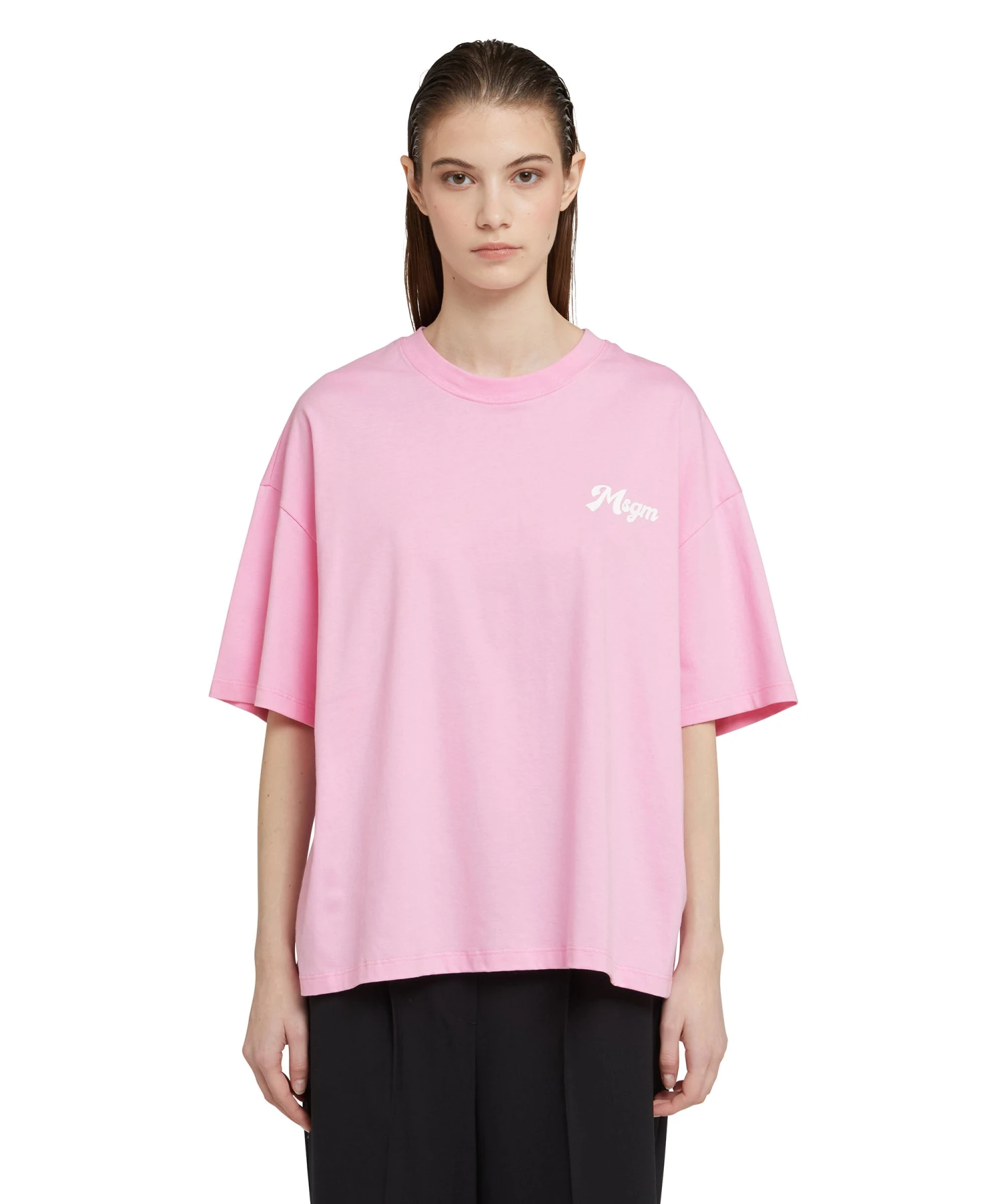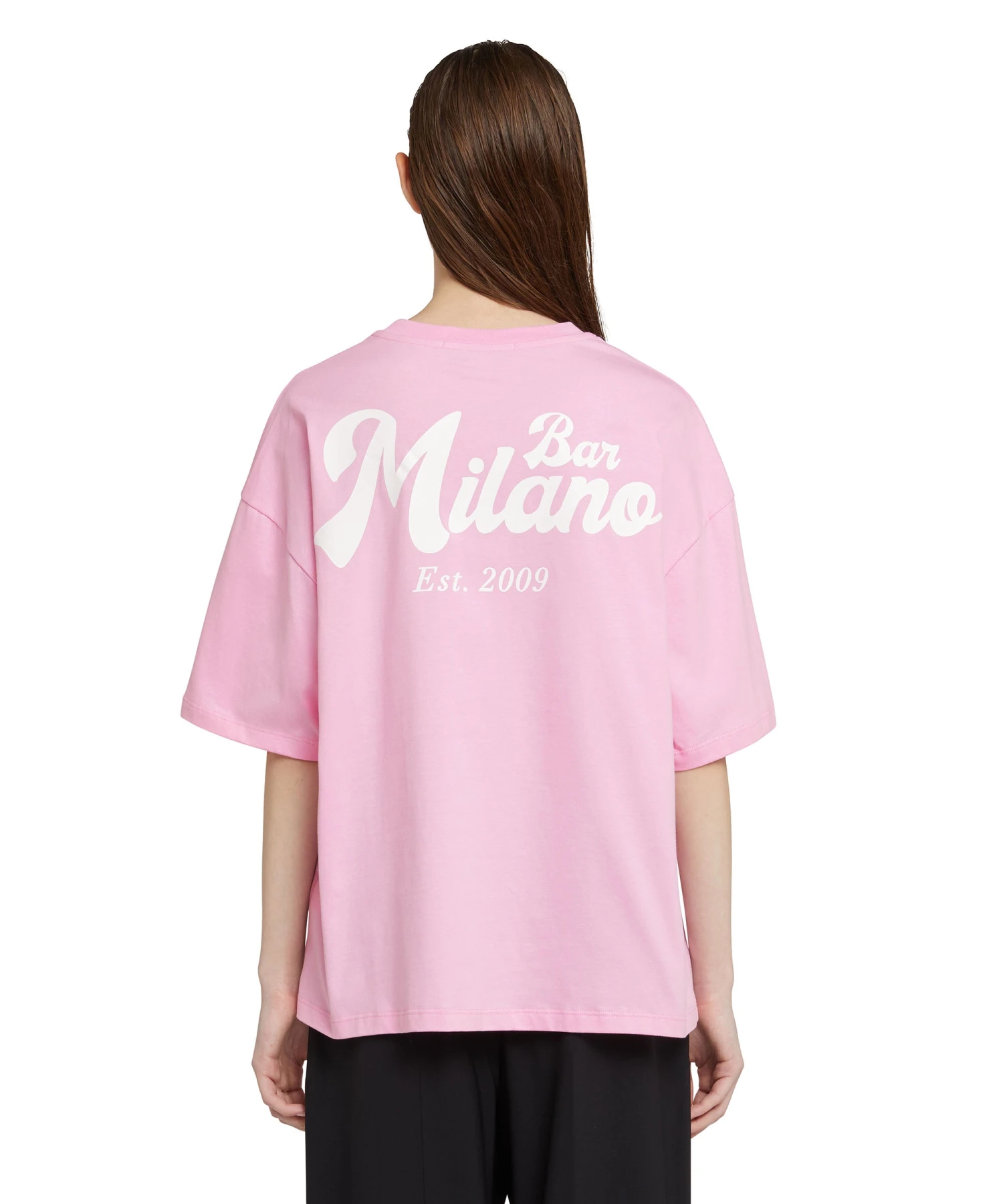 Solid color fabric crewneck t-shirt with MSGM logo print on the chest and “Bar Milano” graphic on the back. Oversize fit.