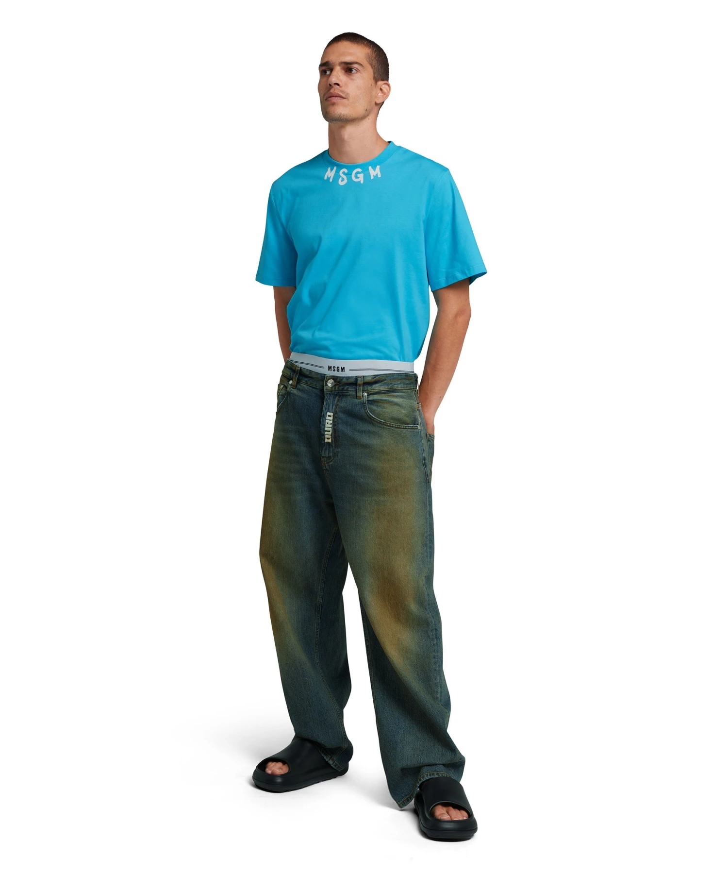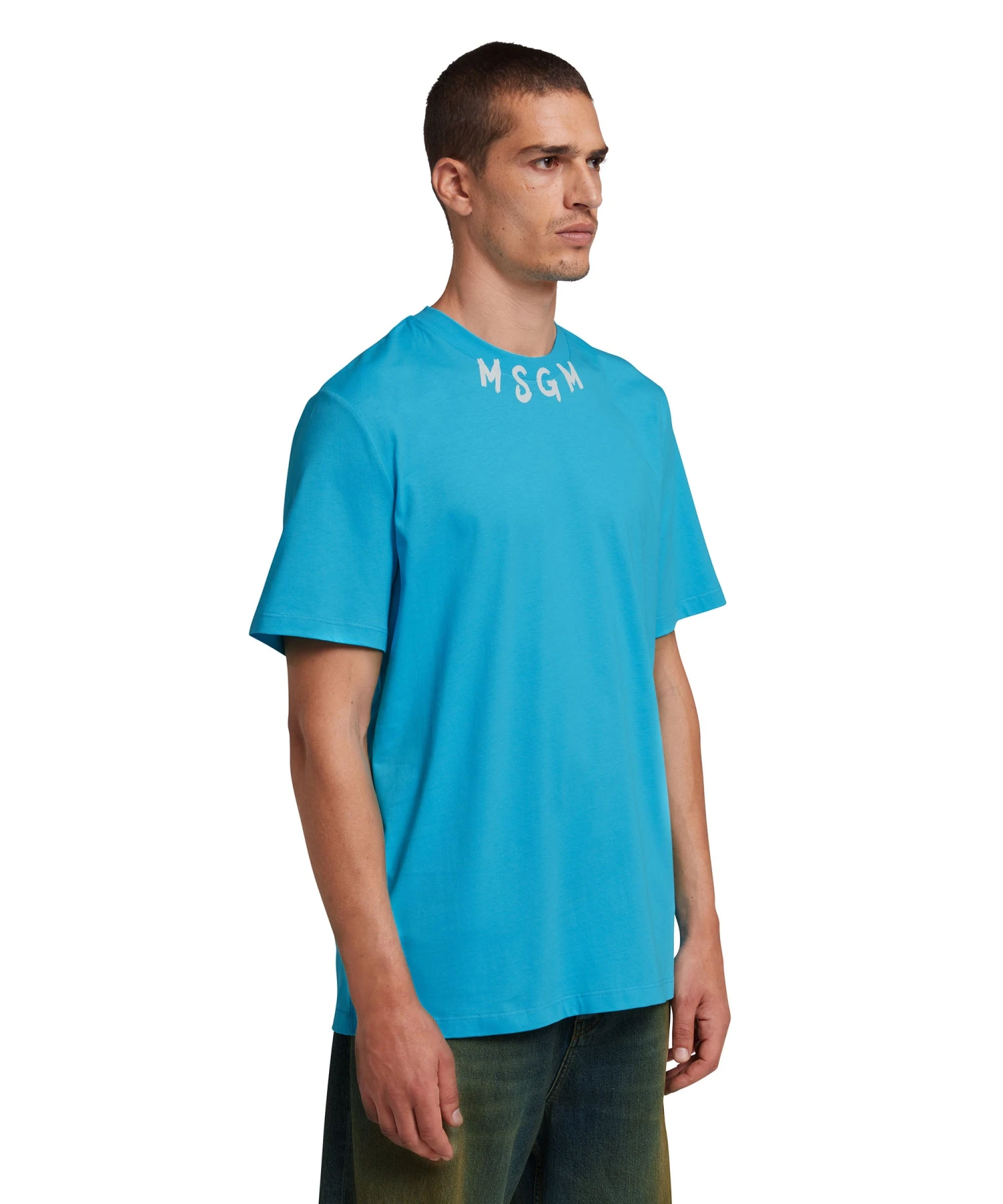 Solid color cotton crewneck t-shirt with contrasting MSGM brushstroke logo at the collar. Short sleeves and ribbed collar. Regular fit.