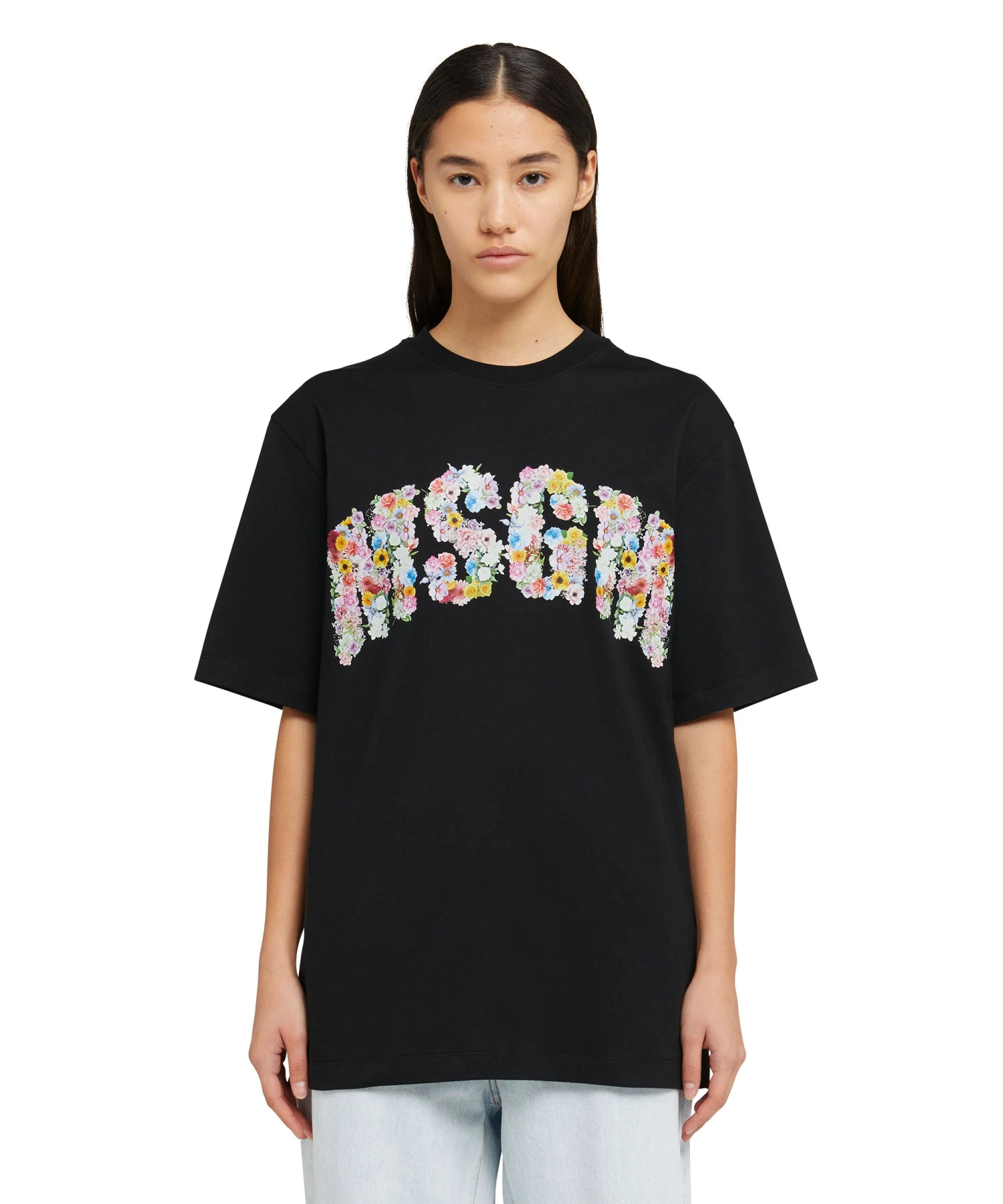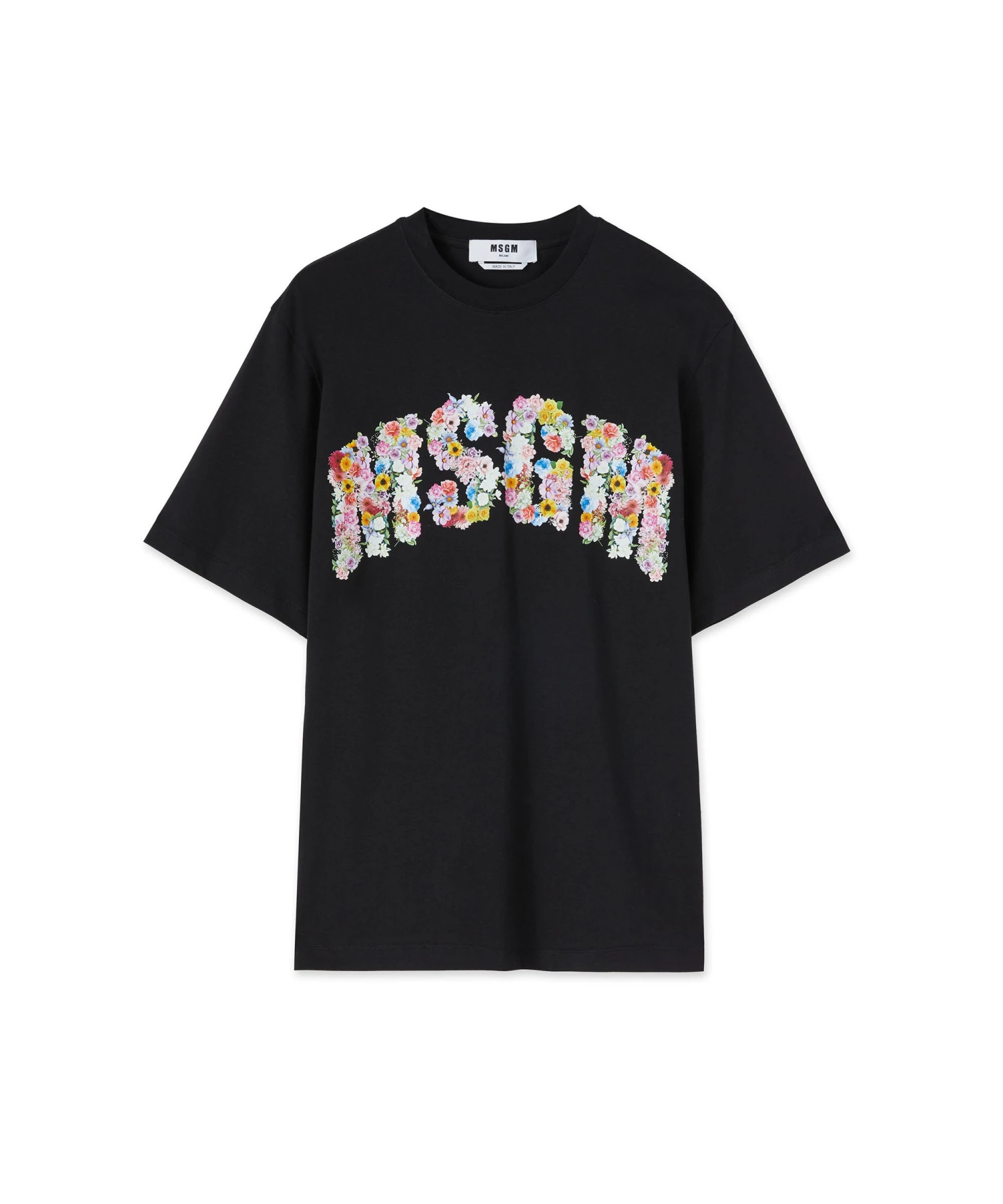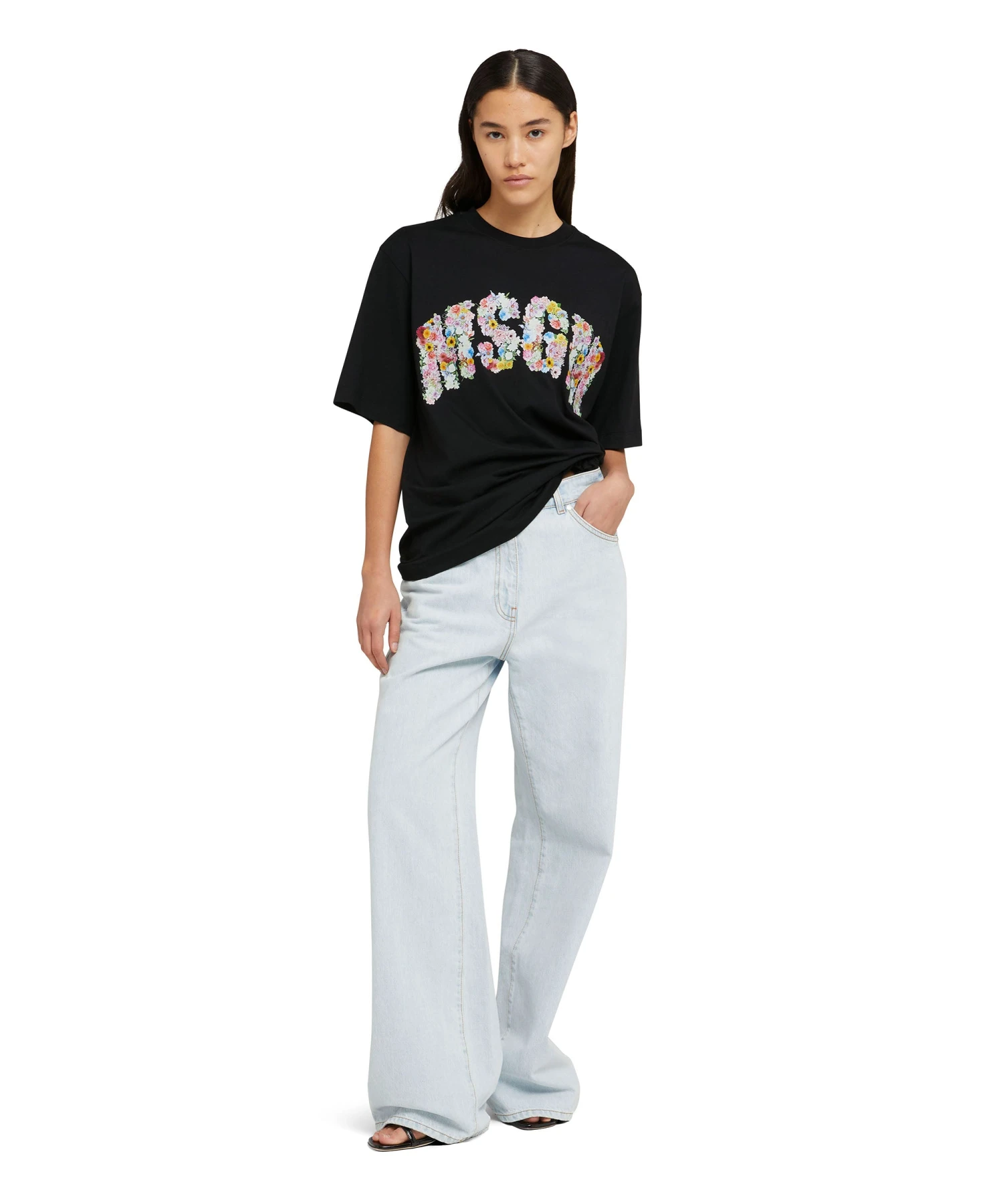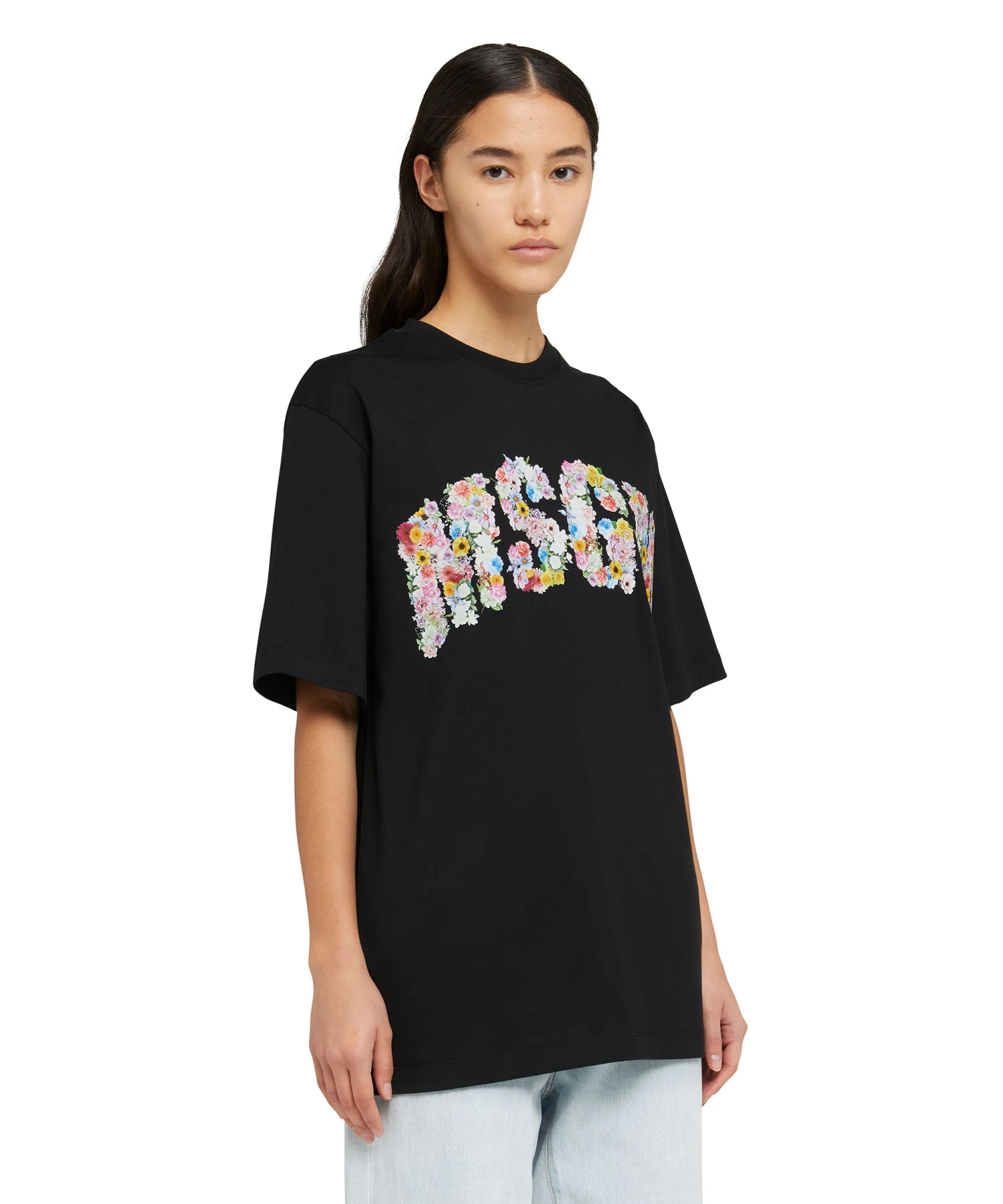 Cotton crewneck T-shirt with contrast color floral college logo on front. Short sleeves and ribbed collar. Oversize fit.