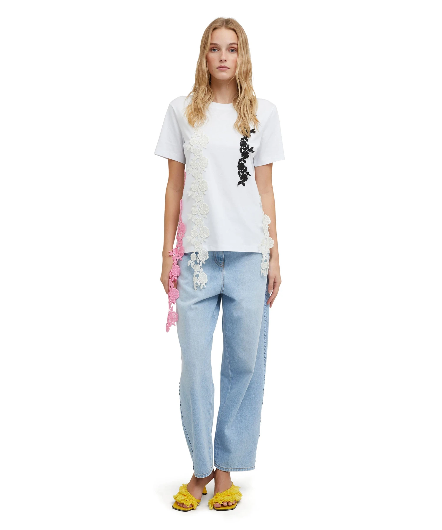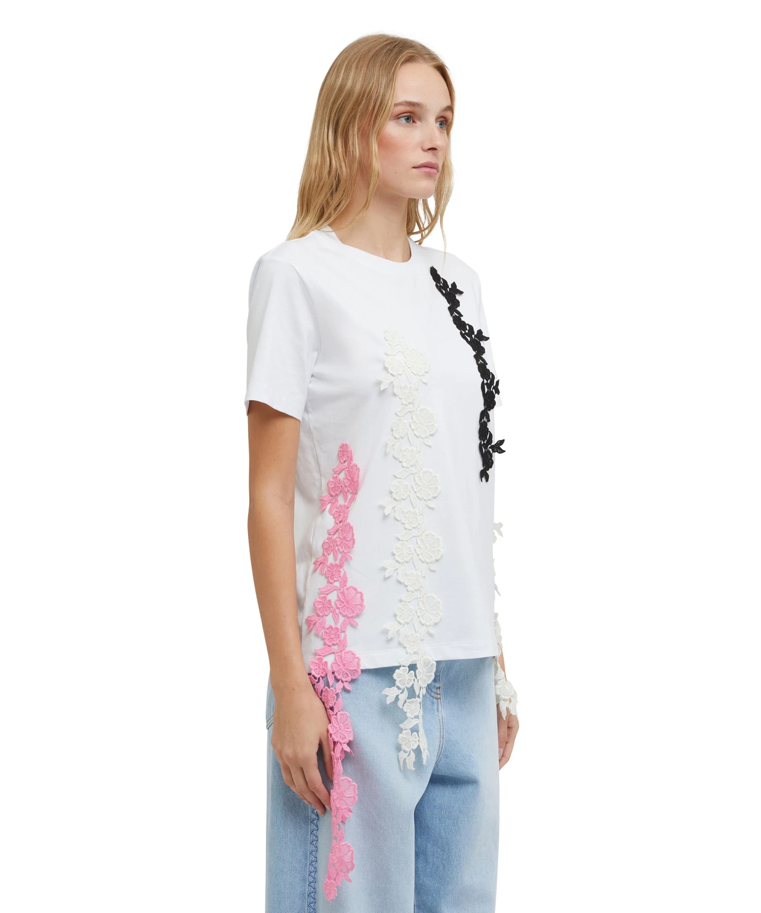 Solid color fabric crewneck t-shirt with lace applications. Regular fit.