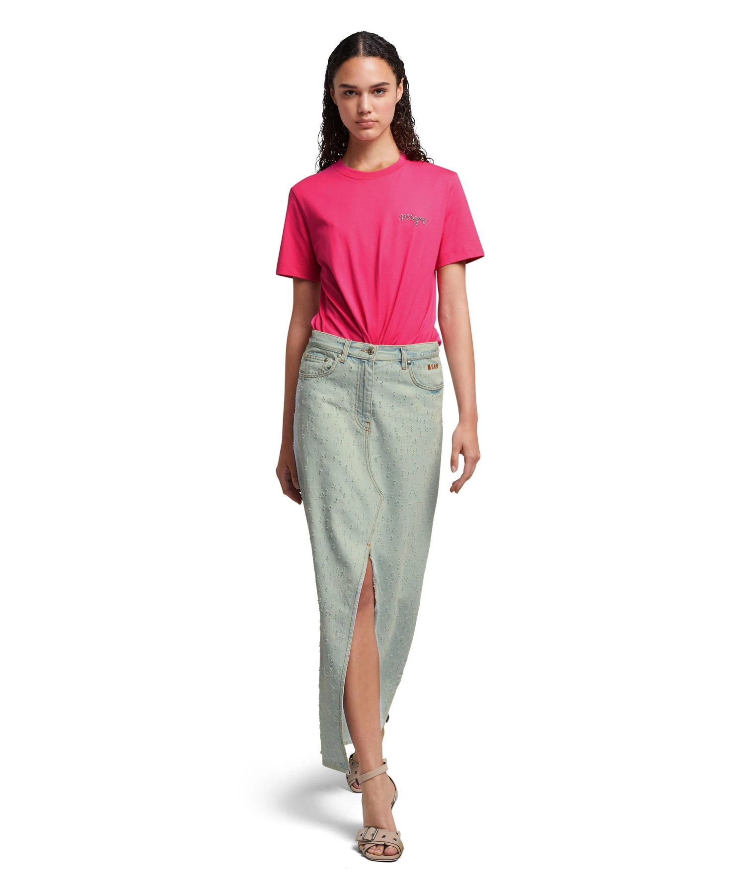 Solid color cotton crewneck t-shirt with contrasting MSGM glitter logo embroidered on the chest. Regular fit.