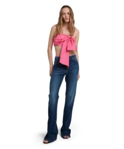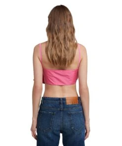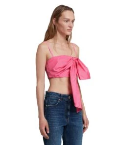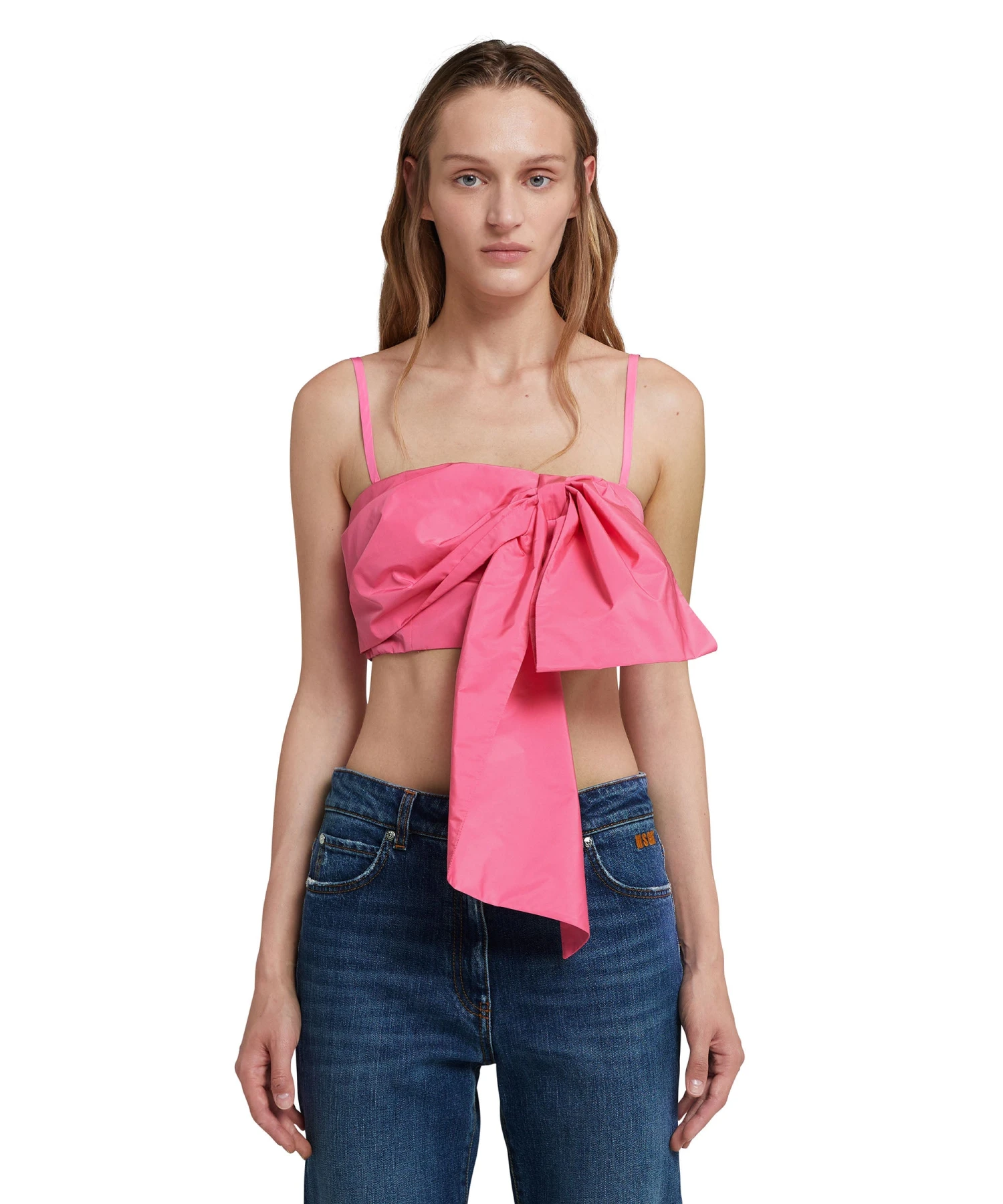 Solid color taffeta top with decorative front bow. Thin shoulder straps. Regular fit.