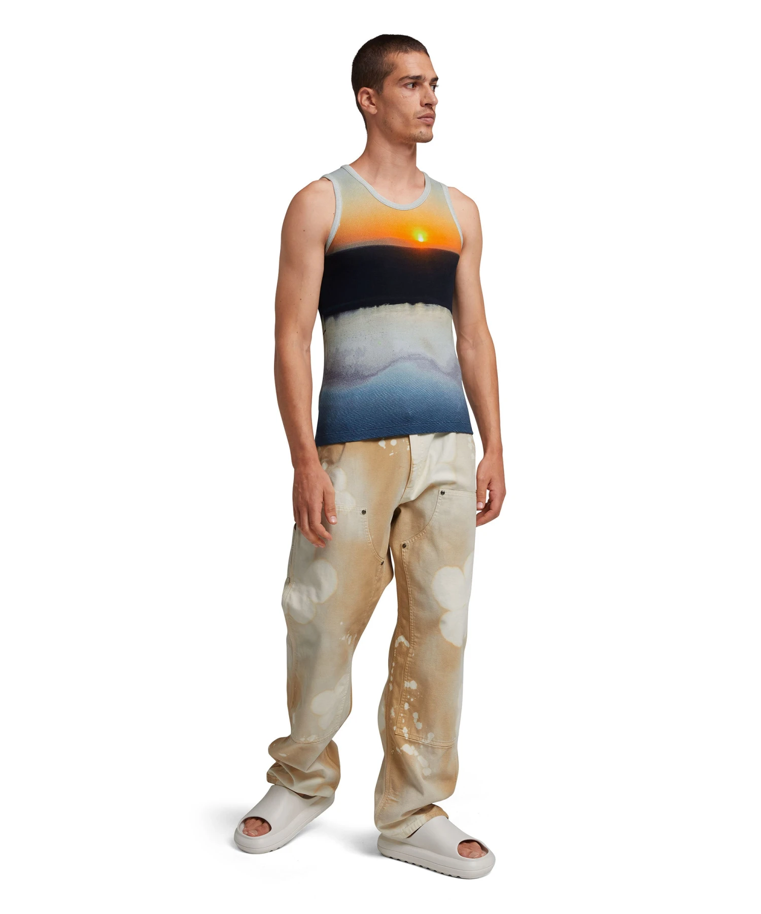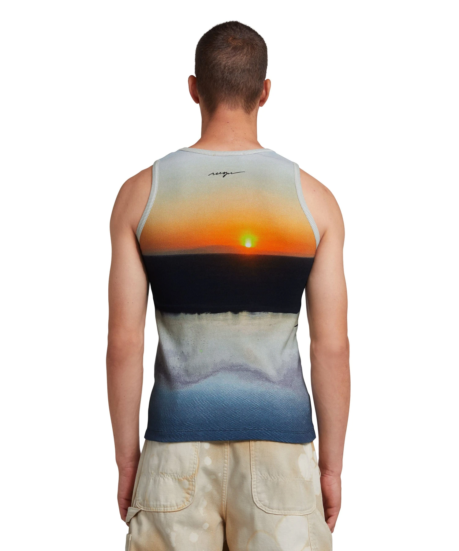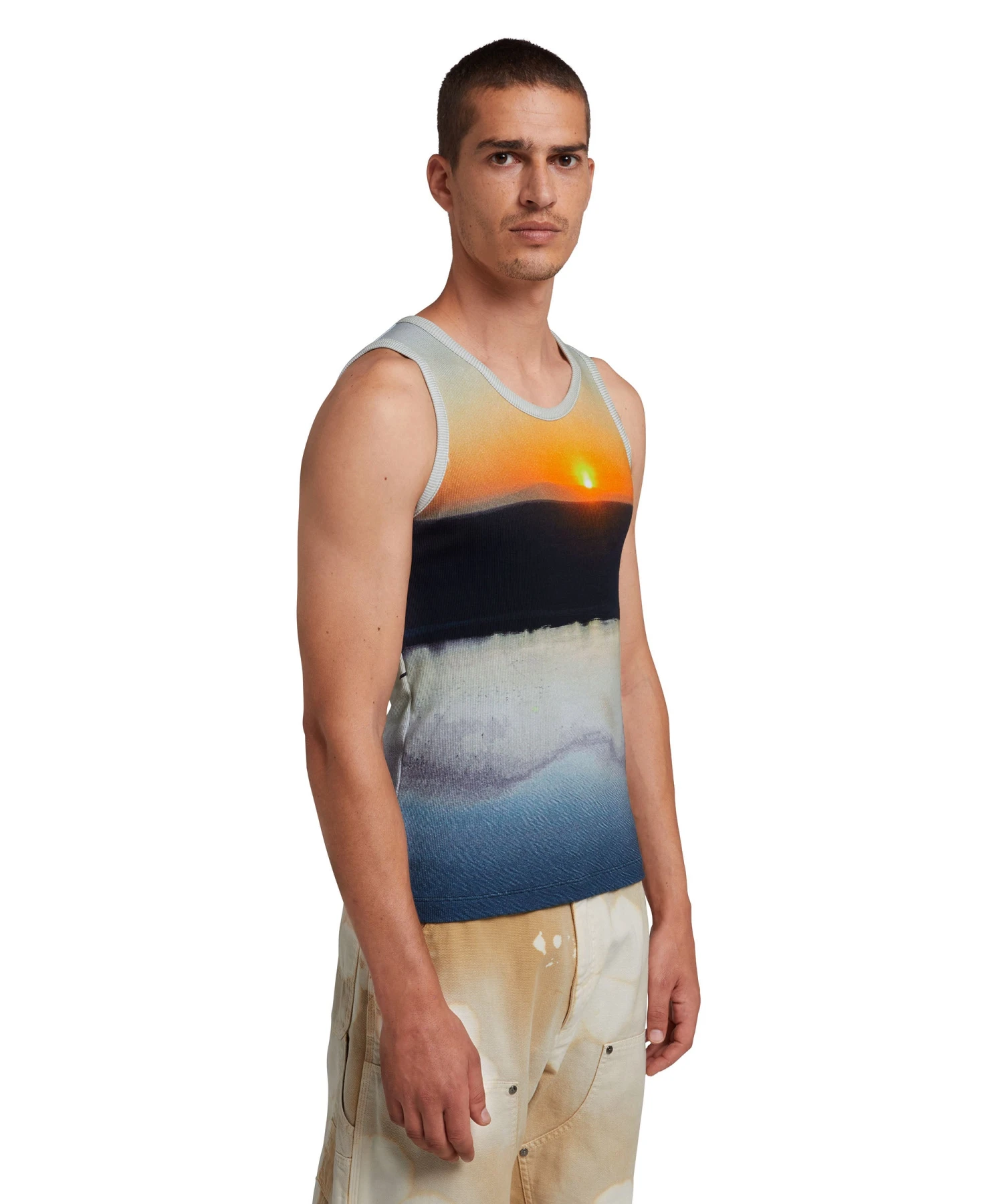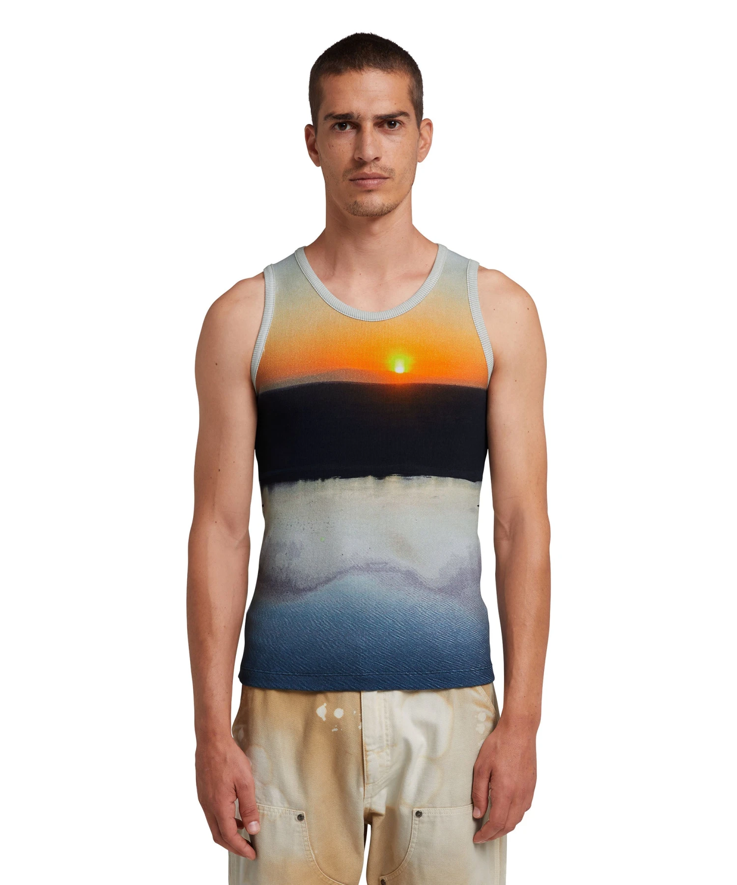 Safari is the inspiration of the theme of the Spring/Summer 24 collection. The “Tanzanian gaze torch snap” print was developed starting from a real image of a sunset on the savannah. Allover printed cotton tank top. Snug fit.