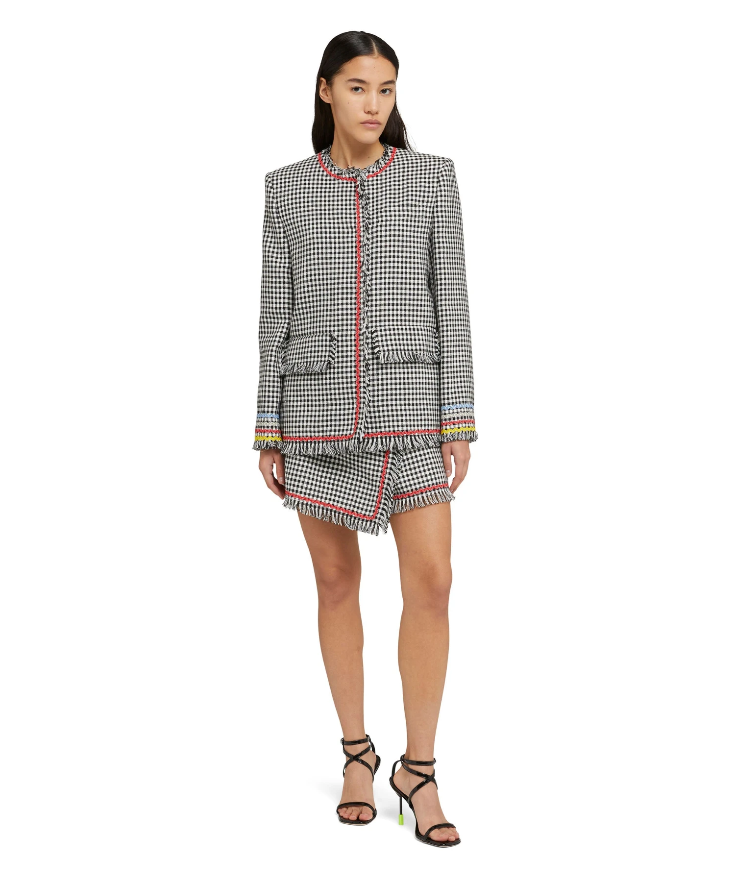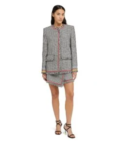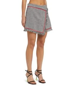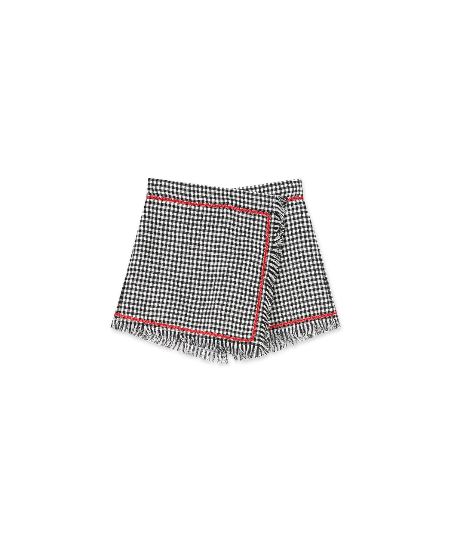 Tweed skort with vichy motif and decorative applications with frayed profiles. Asymmetrical wrap closure. Welt pocket on the side. Regular fit.